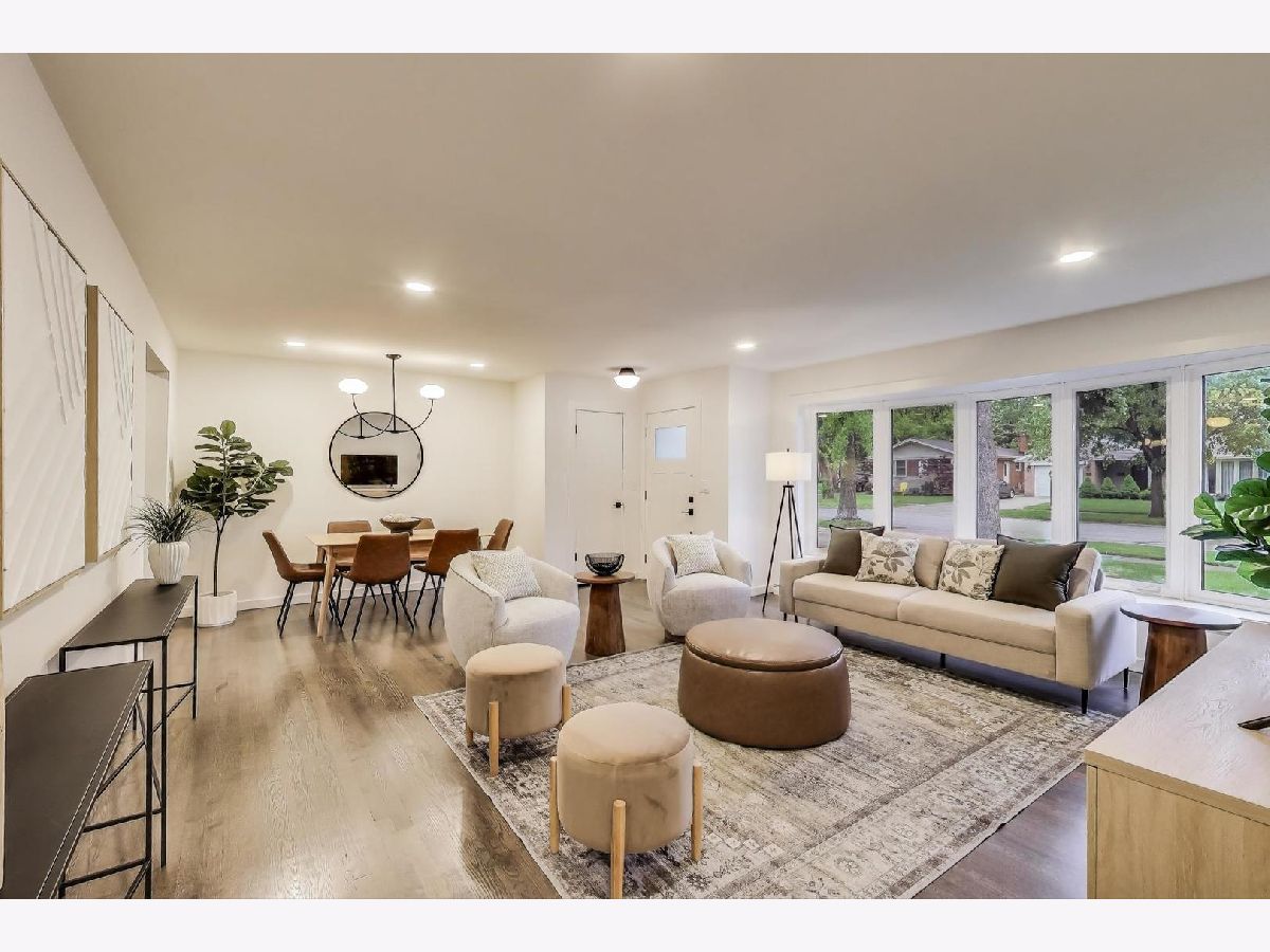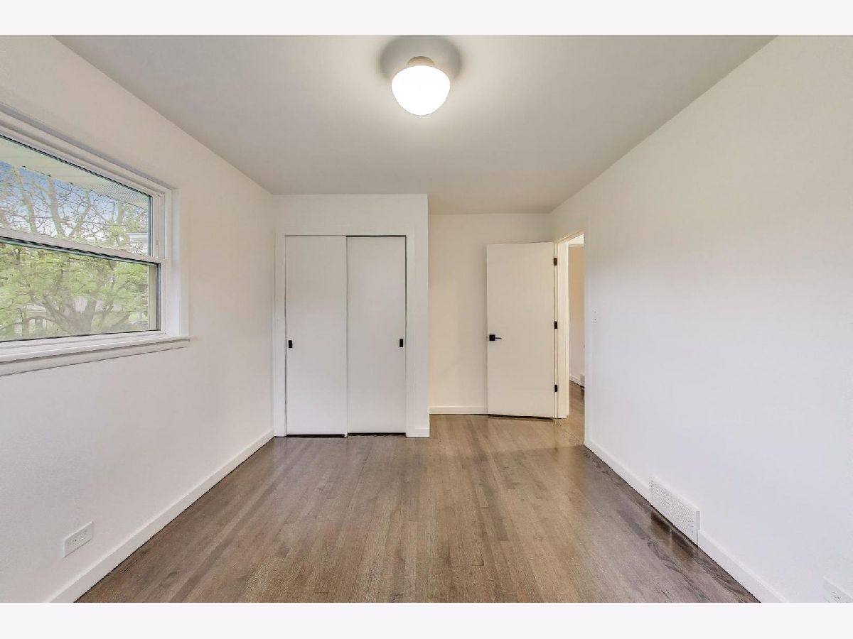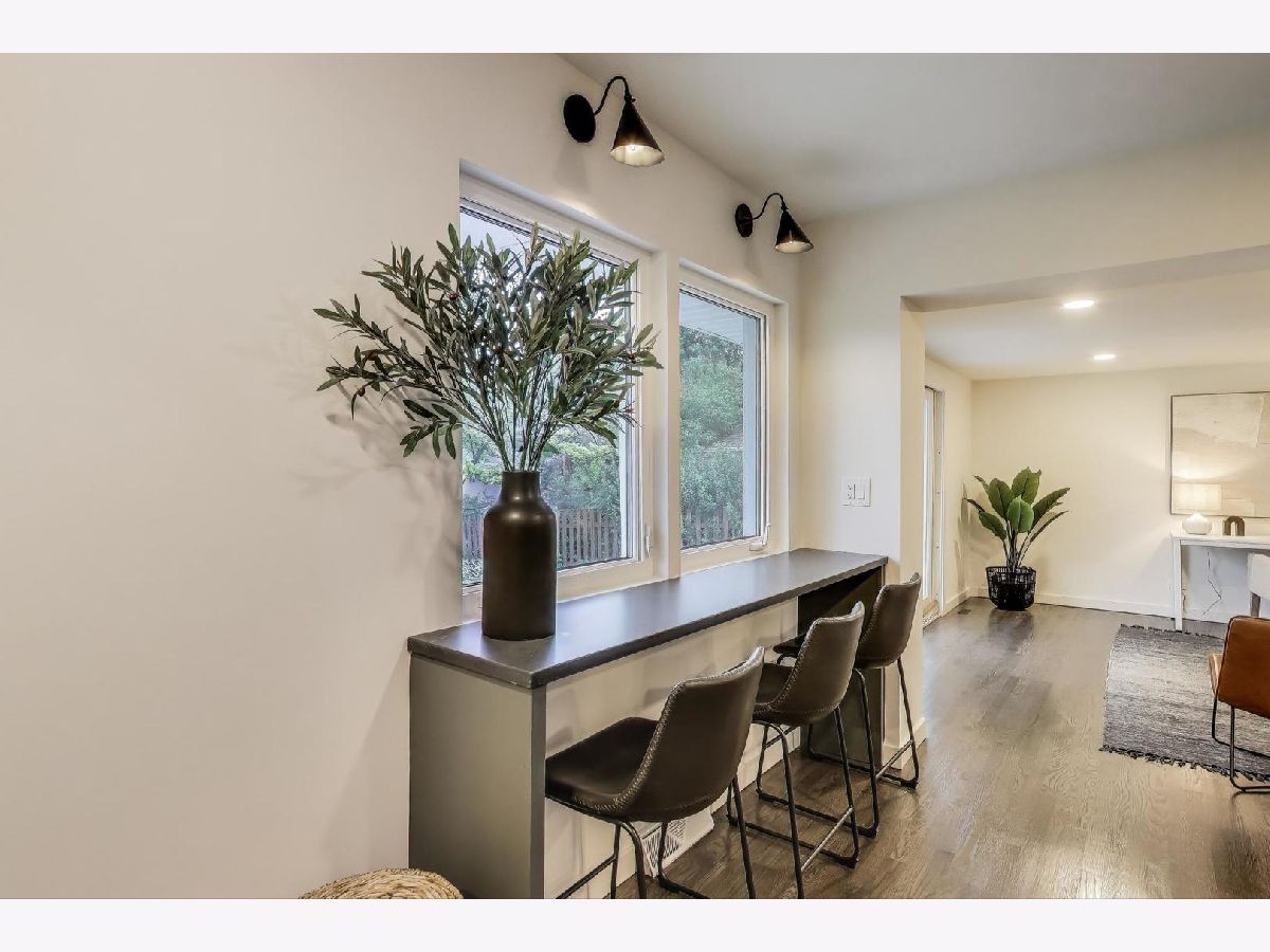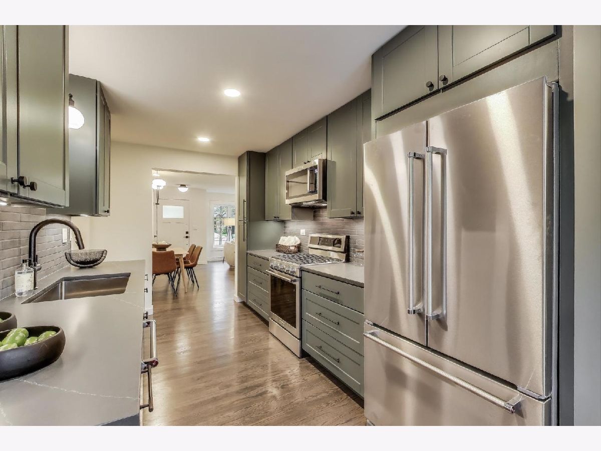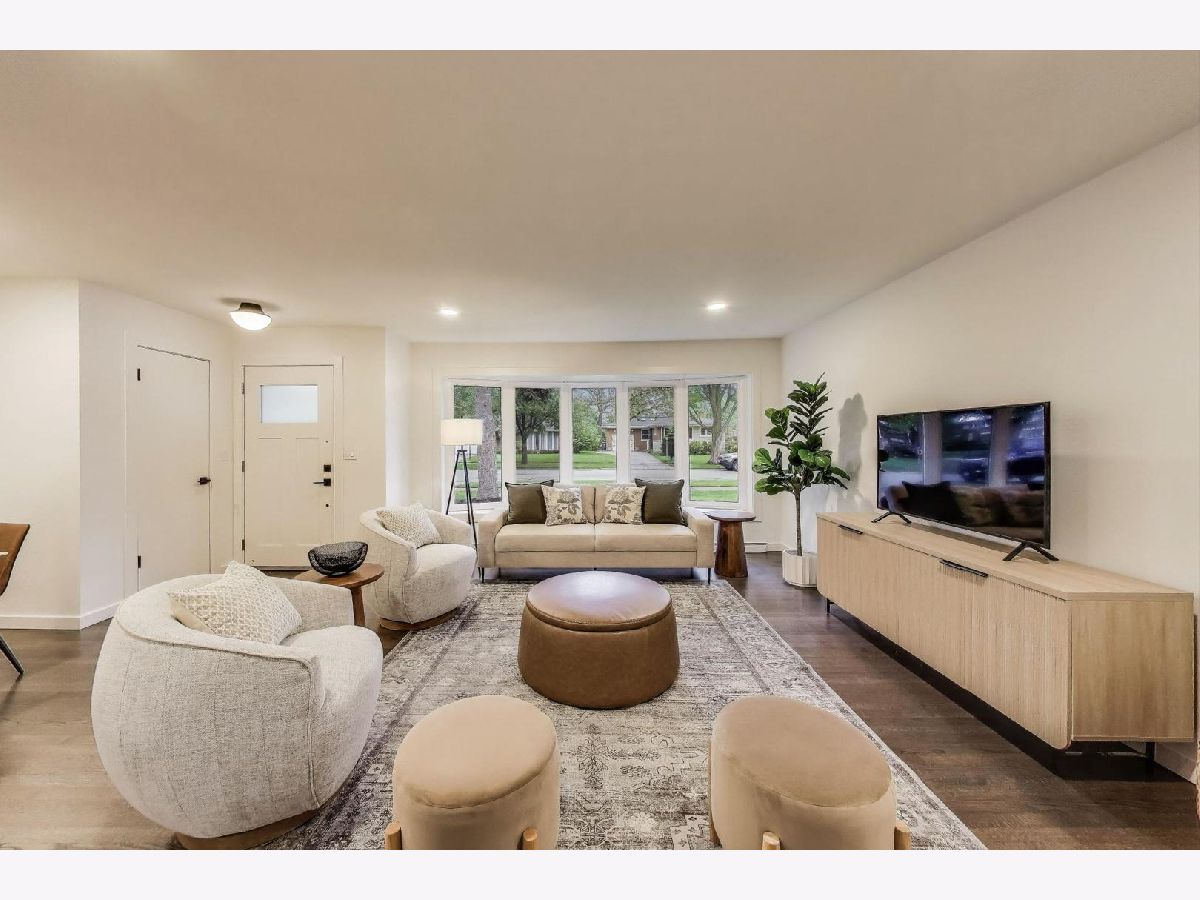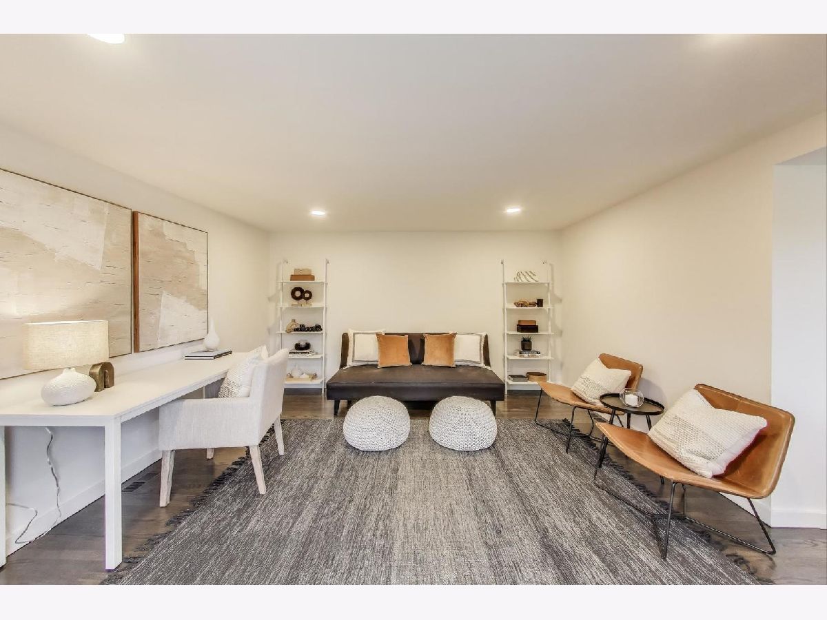 Welcome to this fully renovated and stylish 4-bedroom, 1.1-bathroom brick ranch, ideally located in one of Mount Prospect's most desirable neighborhoods. Situated within the top-rated District 57 school system and just steps from the soon-to-be revitalized Lions Park (2025-2027), this home offers both modern elegance and unbeatable convenience. Step inside to discover a bright and spacious open-concept living and dining area-perfect for entertaining. Rich walnut-stained hardwood floors span the main level and stairway to the lower level, complemented by fresh custom paint by Benjamin Moore throughout. The stunning kitchen features 42" shaker-style cabinets with abundant storage, a pantry, honed soapstone countertops, and premium KitchenAid Professional Series stainless steel appliances. A 3-person counter sits beside expansive west-facing windows that flood the space with natural light and overlook the new concrete patio and large, landscaped backyard. A versatile family room or home office, located on the main floor, adjacent to the kitchen, opens directly to the patio through sliding glass doors-ideal for indoor/outdoor living. Three generous main-floor bedrooms offer ample closet space. The beautifully remodeled full bathroom showcases oversized green ceramic tiled shower walls, marble hexagon flooring, a stylish walnut double vanity with quartz countertops, and matte black lighting/mirror and plumbing fixtures. The powder room, adjacent to the kitchen, is equally refined with black marble hexagon tile flooring, a chic vanity with honed soapstone countertop, and bold, color-saturated walls, ceiling, and trim. A newly added mudroom includes a built-in bench with cubbies above and below, a large coat closet, and direct access to the attached one-car garage with excellent storage options. Downstairs, you'll find an expansive finished basement that includes oversized marble-look tiled laundry room with high-efficiency side-by-side washer/dryer, quartz folding counter, stainless steel utility sink, and ample cabinetry; a massive recreation room, ideal for media, games, or a home gym; a spacious fourth bedroom; a large storage area and separate utility/HVAC room with potential to add a second full bathroom (then would be two full bath, one 1/2 bath). Step outside through the rear sliding doors to enjoy the newly poured concrete patio, mature trees, and perennial plantings that enhance the private backyard retreat. Gorgeous matte black lighting fixtures throughout. Additional updates include: all-new electrical wiring, new water supply and drain lines, new PVC sewer line from the house to the city main, newer roof, newer windows, and gutter guards, new furnace, new a/c and new water heater. Newly Landscaped front beds with boxwoods and black mulch. Located in a quiet neighborhood close to schools, parks, public pools, shopping centers, and dining options, this home combines modern upgrades with timeless comfort. Don't miss the opportunity to make this beautifully upgraded home your own-schedule your private showing today!