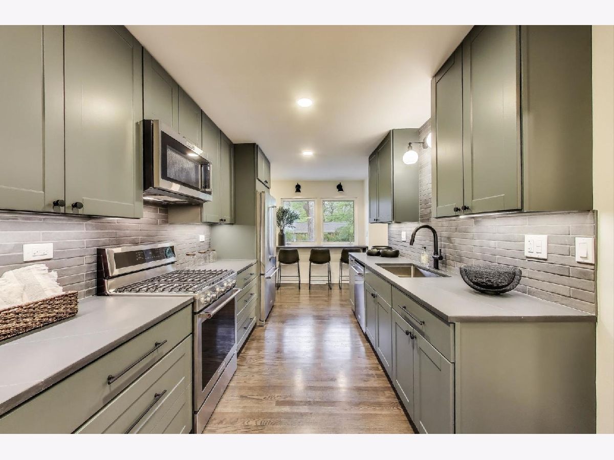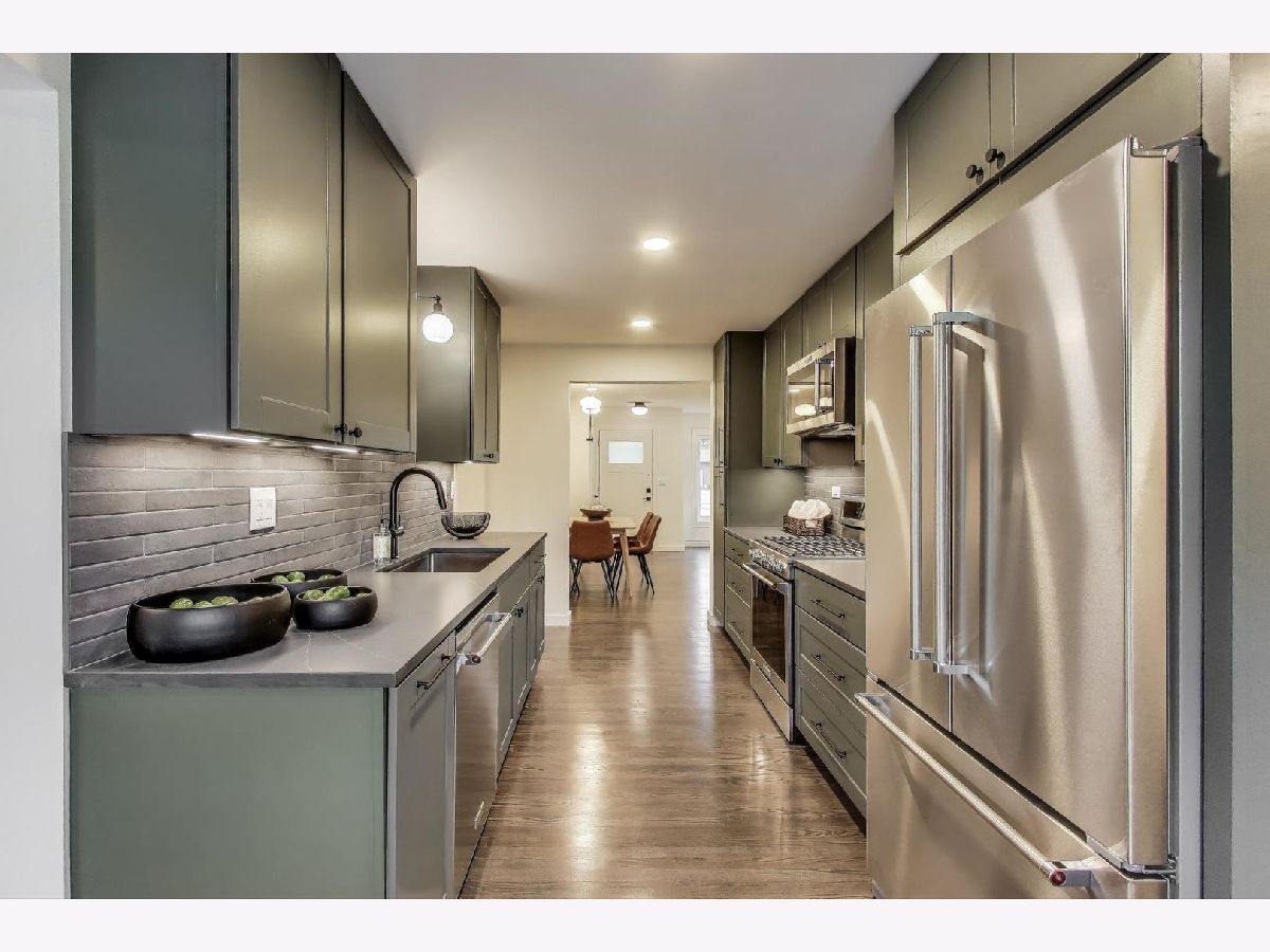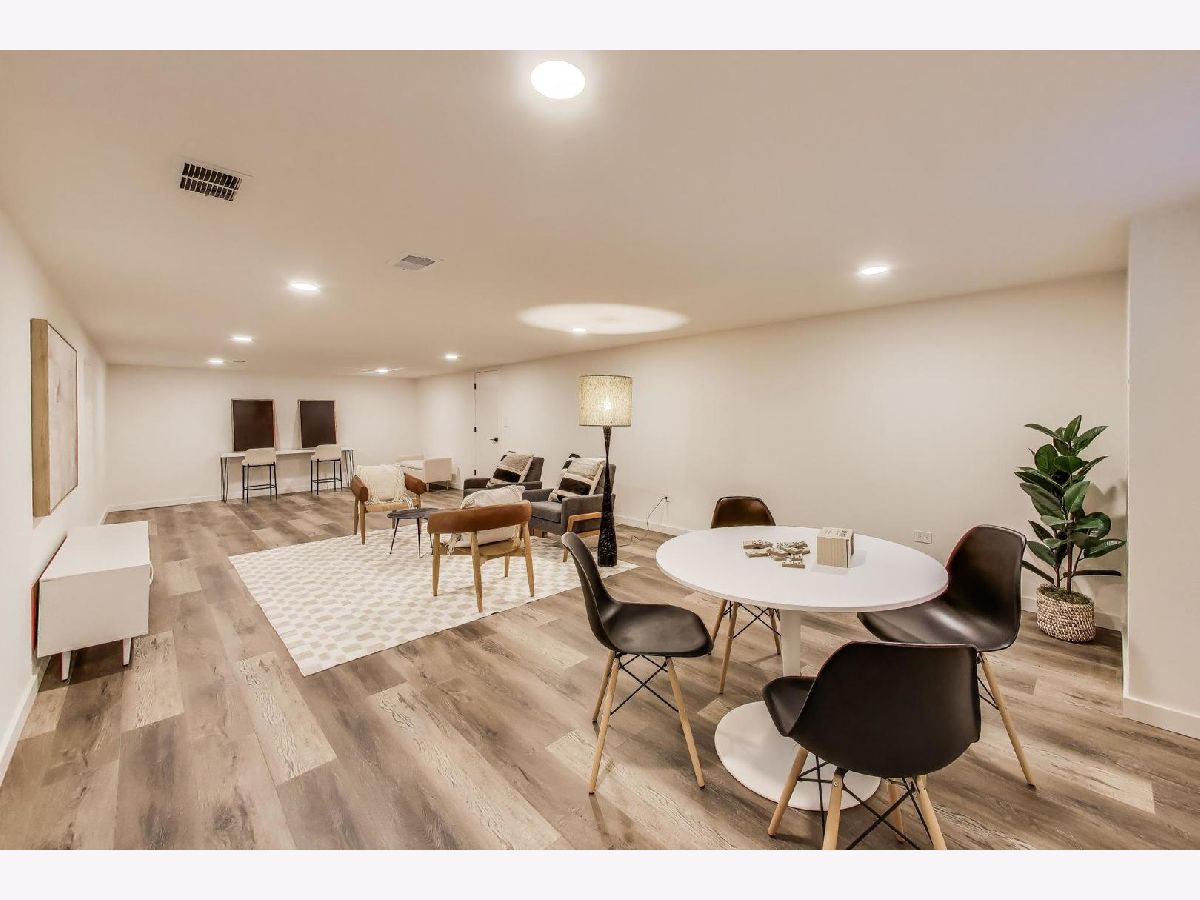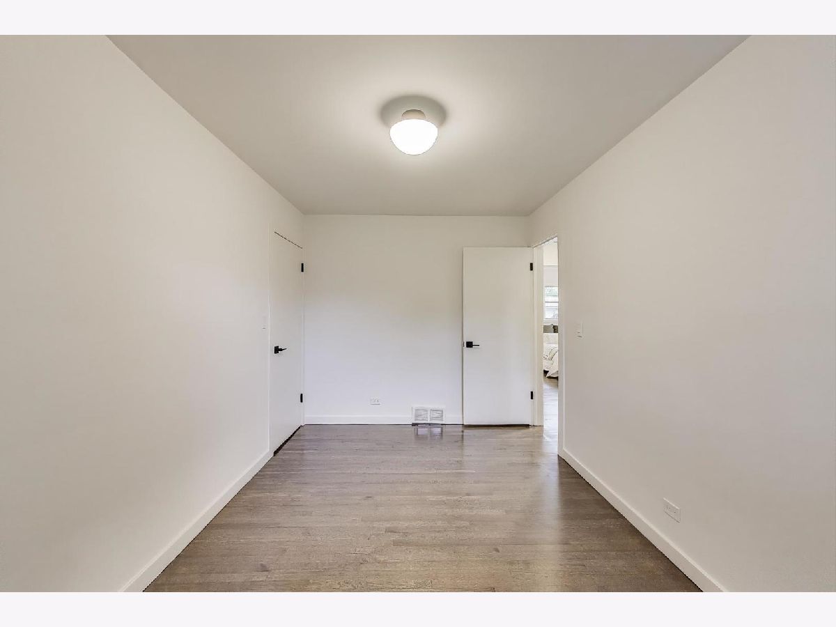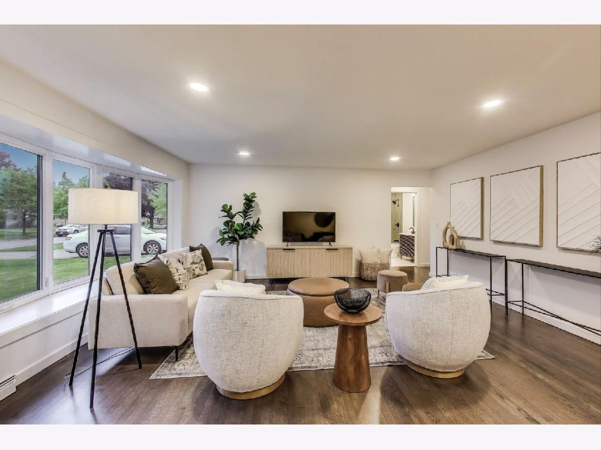Welcome to this fully renovated and stylish 4-bedroom, 1.1-bathroom brick ranch, ideally located in one of Mount Prospect's most desirable neighborhoods. Situated within the top-rated District 57 school system and just steps from the soon-to-be revitalized Lions Park (2025-2027), this home offers both modern elegance and unbeatable convenience. Step inside to discover a bright and spacious open-concept living and dining area-perfect for entertaining. Rich walnut-stained hardwood floors span the main level and stairway to the lower level, complemented by fresh custom paint by Benjamin Moore throughout. The stunning kitchen features 42" shaker-style cabinets with abundant storage, a pantry, honed soapstone countertops, and premium KitchenAid Professional Series stainless steel appliances. A 3-person counter sits beside expansive west-facing windows that flood the space with natural light and overlook the new concrete patio and large, landscaped backyard. A versatile family room or home office, located on the main floor, adjacent to the kitchen, opens directly to the patio through sliding glass doors-ideal for indoor/outdoor living. Three generous main-floor bedrooms offer ample closet space. The beautifully remodeled full bathroom showcases oversized green ceramic tiled shower walls, marble hexagon flooring, a stylish walnut double vanity with quartz countertops, and matte black lighting/mirror and plumbing fixtures. The powder room, adjacent to the kitchen, is equally refined with black marble hexagon tile flooring, a chic vanity with honed soapstone countertop, and bold, color-saturated walls, ceiling, and trim. A newly added mudroom includes a built-in bench with cubbies above and below, a large coat closet, and direct access to the attached one-car garage with excellent storage options. Downstairs, you'll find an expansive finished basement that includes oversized marble-look tiled laundry room with high-efficiency side-by-side washer/dryer, quartz folding counter, stainless steel utility sink, and ample cabinetry; a massive recreation room, ideal for media, games, or a home gym; a spacious fourth bedroom; a large storage area and separate utility/HVAC room with potential to add a second full bathroom (then would be two full bath, one 1/2 bath). Step outside through the rear sliding doors to enjoy the newly poured concrete patio, mature trees, and perennial plantings that enhance the private backyard retreat. Gorgeous matte black lighting fixtures throughout. Additional updates include: all-new electrical wiring, new water supply and drain lines, new PVC sewer line from the house to the city main, newer roof, newer windows, and gutter guards, new furnace, new a/c and new water heater. Newly Landscaped front beds with boxwoods and black mulch. Located in a quiet neighborhood close to schools, parks, public pools, shopping centers, and dining options, this home combines modern upgrades with timeless comfort. Don't miss the opportunity to make this beautifully upgraded home your own-schedule your private showing today!