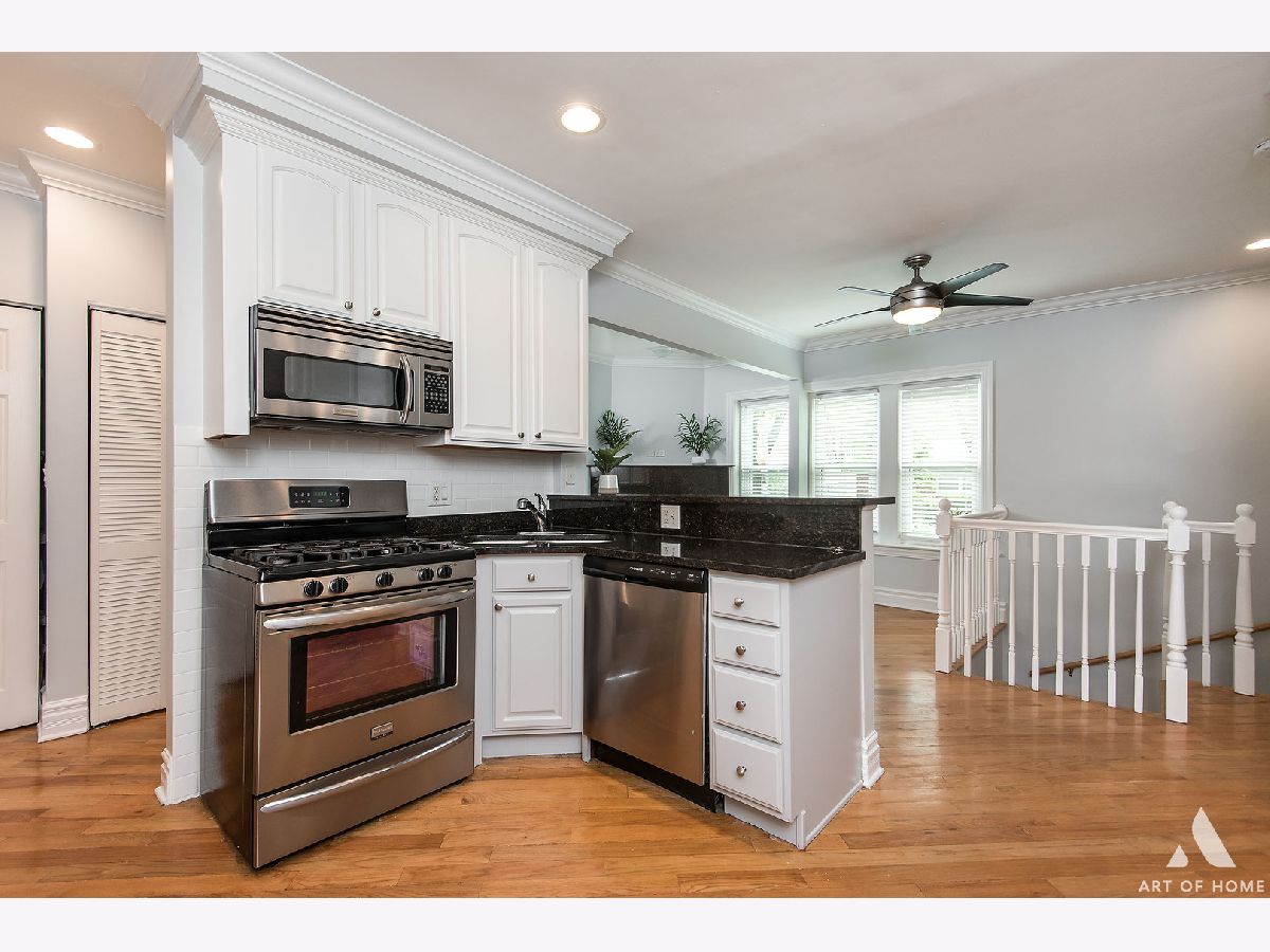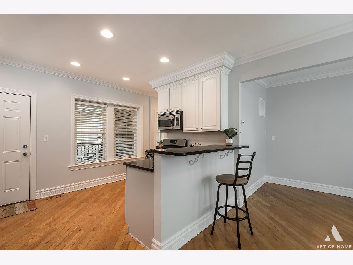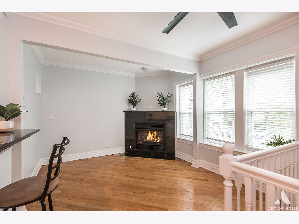 Welcome home to this freshly updated duplex down on a quaint and beautiful tree-lined street in the North Park neighborhood. Enjoy open concept living with hardwood floors throughout and a spacious kitchen featuring freshly painted cabinets, stainless steel appliances, and a plethora of beautiful granite countertops for prepping meals, eating at the bar, or entertaining. Tons of cabinet space for storage and a trendy white subway tile backsplash. Relax in the living room beside a gas start, a wood-burning fireplace with stone surround, and large windows streaming in natural light. The first floor also features a full bathroom, in-unit washer/dryer, and access to the large common deck perfectly situated off of the kitchen for grilling and dining. Head downstairs to the two generous bedrooms and large 2nd full bathroom with dual vanity, separate standing shower, and jetted soaking tub. The unit has many updates, including fresh paint throughout, a new dishwasher and garbage disposal-newer windows, washer, dryer, hot water tank, stove, and A/C unit. Conveniently located a few blocks from the Brown Line and local expressways. Great area with many restaurants, parks, and shopping nearby. One Parking space is available for an additional $15K. There is also ample street parking. Turn the key and move in!