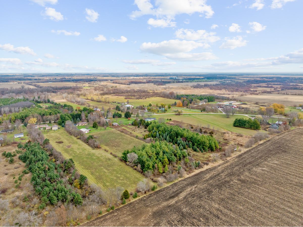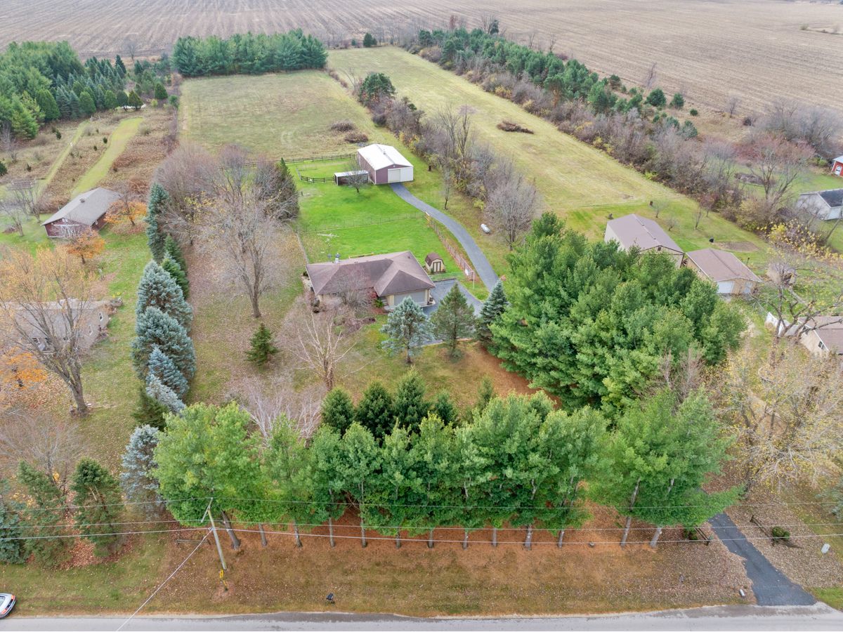 Pride of ownership reflected with this attractive 5 acre farmette! Quality built all brick ranch! Welcoming living room with gleaming hardwood floor~kitchen has attractive cabinety with pull out drawers, pantry, lazy susan, newer SS appliances,island~eat in area has sliding doors to oversized new Trex deck which is great for entertaining~ 3 bedrooms, 1 with hardwood flooring~full bath on main floor and in basement~laundry room on both floors, also. Brand new whole house water filtration system (softener,reverse osmosis, chlorine injection system). Partially finished basement with big family/rec room. 30' x 55' pole barn has concrete floor, 2 stalls, and running water~Fenced back yard w/utility shed. Property is fenced with paddock possibility. Easy access to I90. The rare farmette you have been looking for!