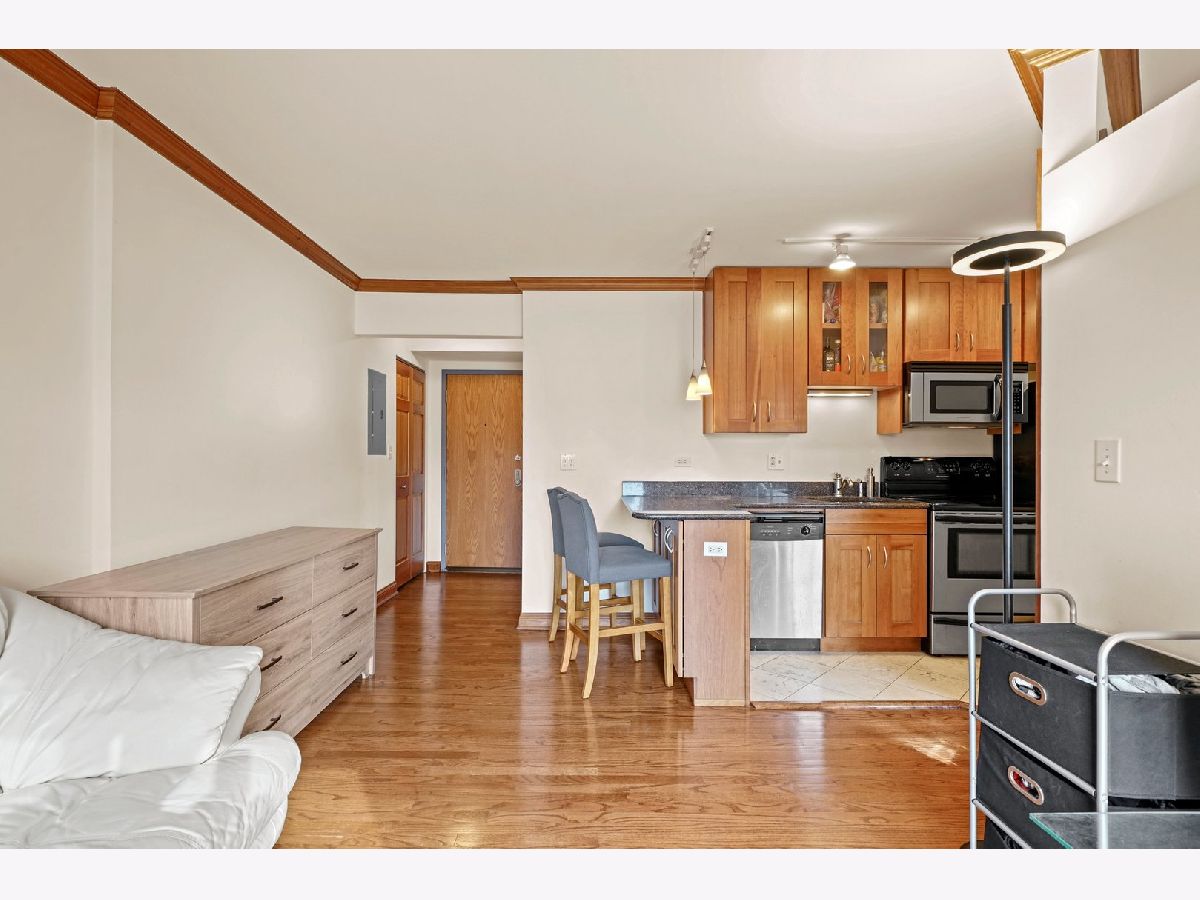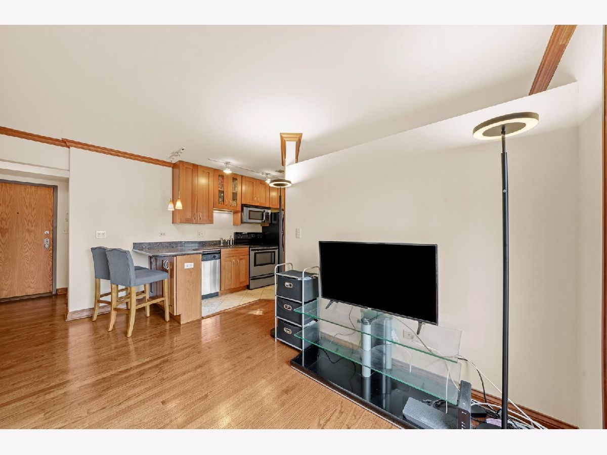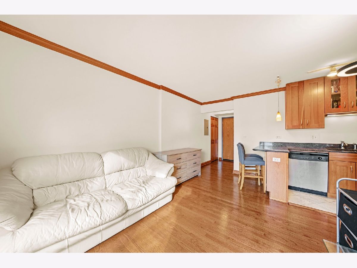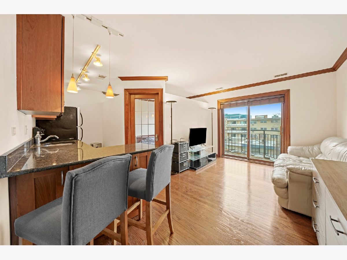 Updated top floor 1 bed 1 bath in the heart of Lakeview. Enjoy the spring weather from your spacious west facing balcony looking over beautiful tree lined Barry Ave. This unit is absolutely move in ready. Featuring fresh paint, hardwood floors, crown molding throughout, washer/dryer in unit, plus central air. Kitchen includes granite counters, stainless steel appliances, ample cabinet space, and breakfast bar. The lofted bedroom with a glass door allows for great natural light throughout. Ample closet space plus additional storage in the building. Clean & neat bathroom with granite counters & medicine cabinet. Boutique elevator building that was recently updated. All hallways were refreshed with new paint and carpet plus recent smart building repairs & maintenance. Assessments include professional management, bike room, additional storage, Xfinity HDTV cable and high speed internet. Perfect Lakeview location with multiple bus lines at the end of the block, short distance from 2 el stations, XSport, Lakeview Athletic Club, Marianos, Trader Joe's, and the lakefront is just 2 blocks away!