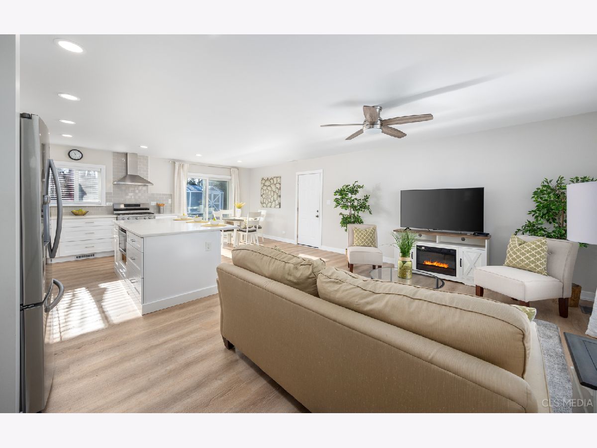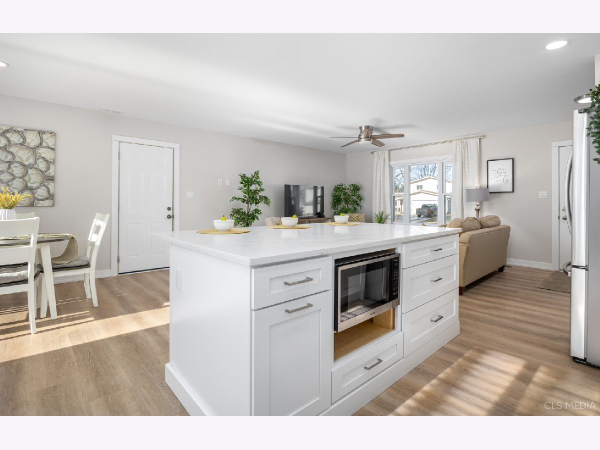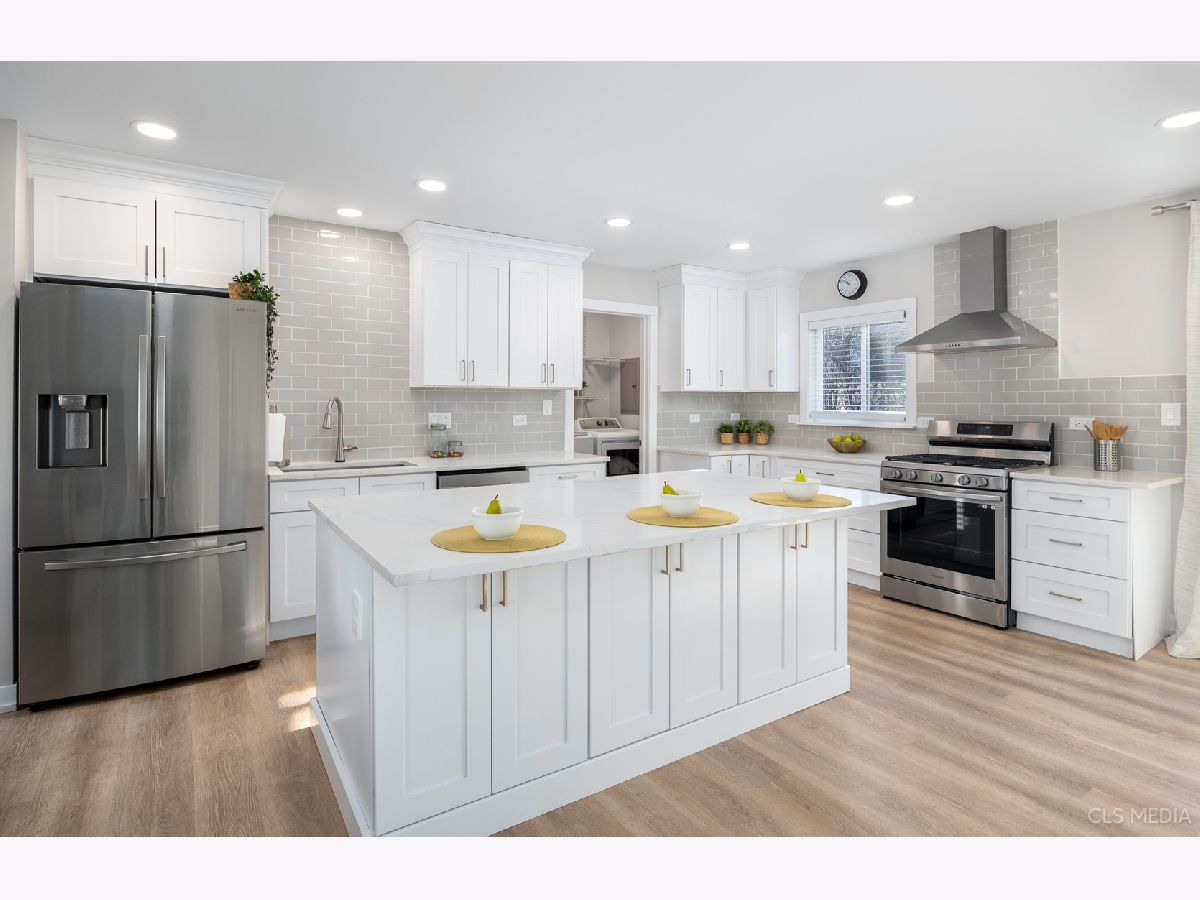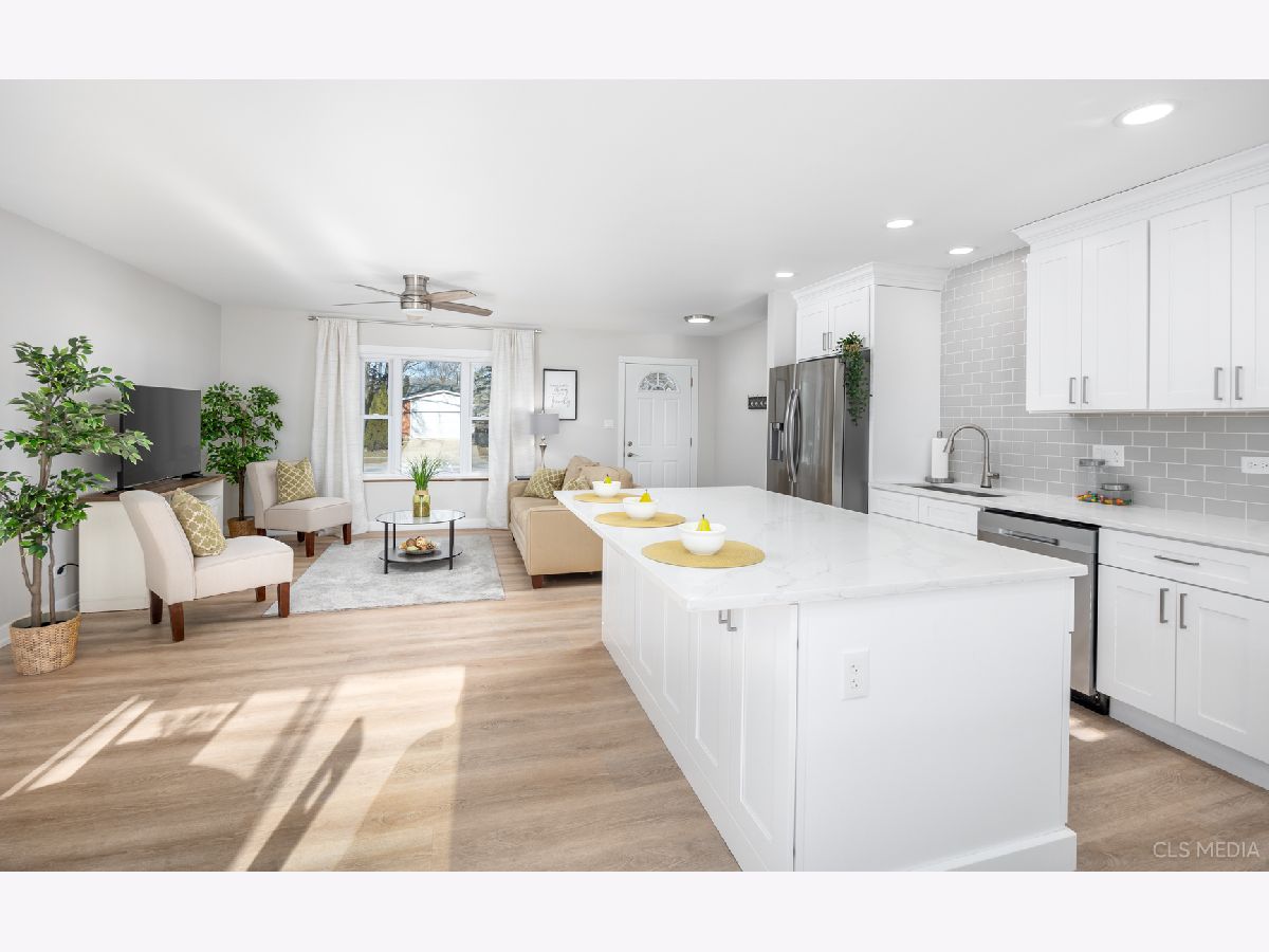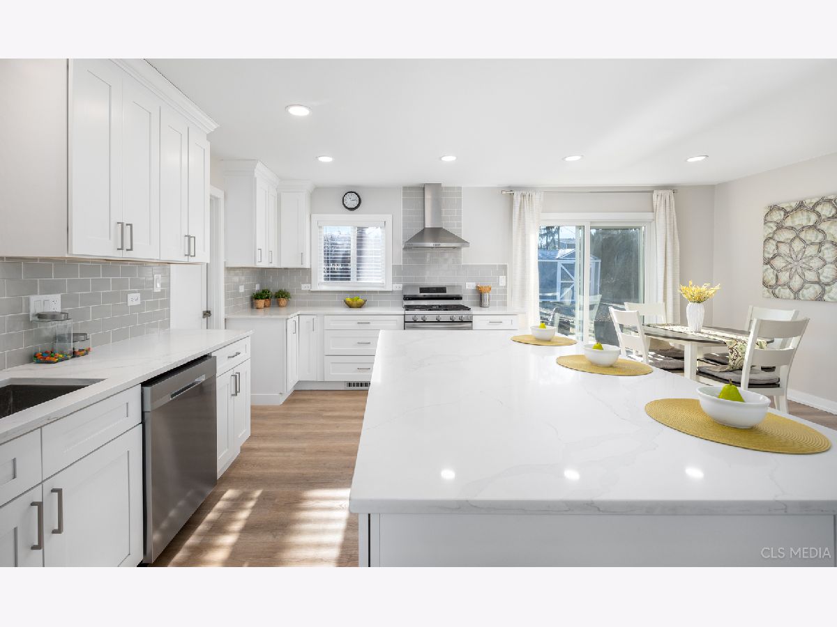 Must see gorgeous RANCH home with timeless updates. Loads of natural light fill this beautiful open-concept kitchen featuring a huge eat-at island. Quartz counters, white shaker cabinets, all stainless appliances. Luxury vinyl plank flooring throughout, solid wood doors painted white with high-end trim. Big, fenced-in back yard with newer concrete patio and new brick paver sidewalk (2022). Newer vinyl windows (2018) and new patio door (2022). Roof, gutters, facia (2019), siding (2022), driveway (2019),garage door (2019). HVAC about 2018. Full remodel (2022) done with permit from the Village of Schaumburg.