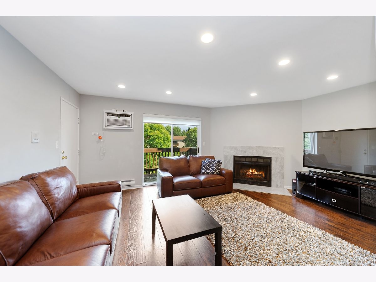 A move-in ready 2 bedroom, 1 bathroom conveniently located by Deer Grove Forest Preserve, schools, restaurants and retail spaces; and a short drive to downtown Palatine. Step into a combined living and dining room with a wood burning fireplace that adds warmth and coziness to the space. Sliding doors from the living room lead out to a private balcony that can be used for grilling, gardening or enjoying summer days. The L-shaped kitchen features espresso wood cabinets, gleaming granite countertops and stainless steel appliances. Good sized bedrooms with wood laminate floors. Newer bathroom with marbled porcelain tile and a crisp, white vanity. Newer bedroom windows, interior doors, sliding door and AC units. In-building laundry.