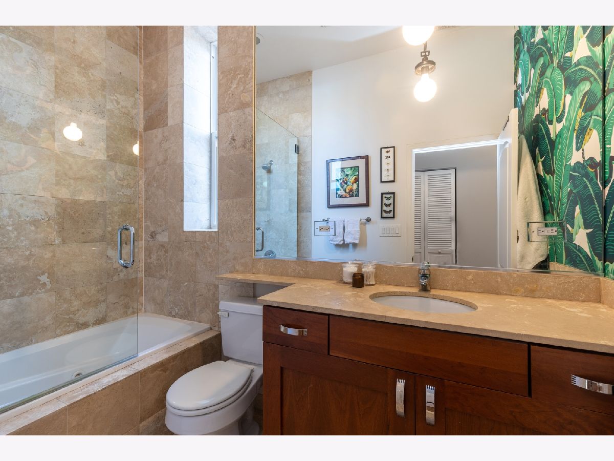 Amazing penthouse 1BR+DEN in HOT West Town w/ garage spot included! This gorgeous condo with incredibly tall ceilings & great natural light w/ treetop views features a gourmet kitchen with honed granite counters, maple cabinetry, stainless steel appliances (1-2 years new), and new beautiful backsplash. All marble bathroom with frameless glass shower, and marble vanity top with undermount sink. Beautiful hardwood floors run throughout. Great separate den with custom built-in shelving. In-unit washer/dryer, storage room, and GREAT COMMON REAR YARD. Only 1/2 mile to green line train, and less than a mile to the Expressway. Great booming locale in close distance to all the bars and restaurants on Chicago & Grand Avenue. Must see!
