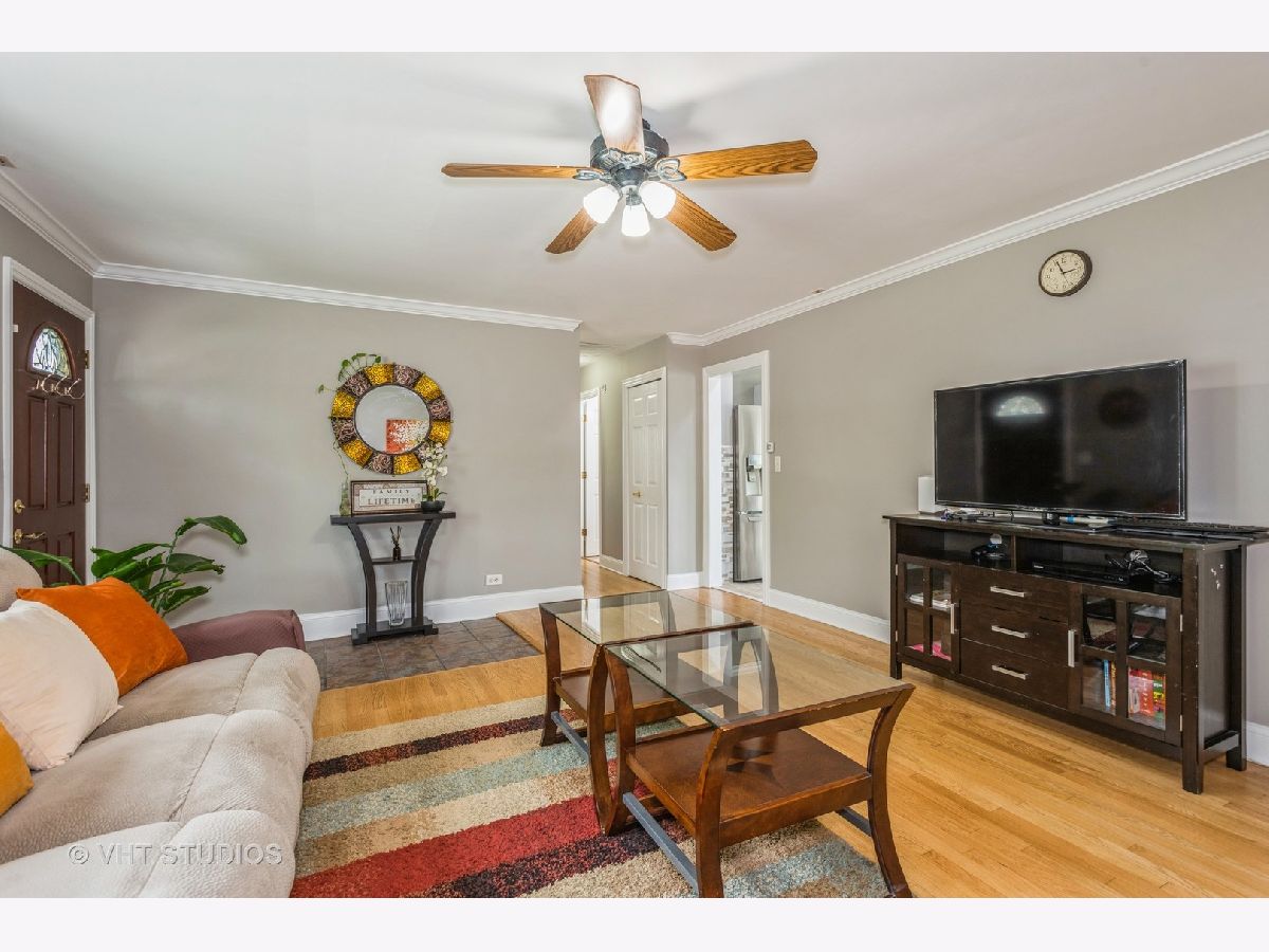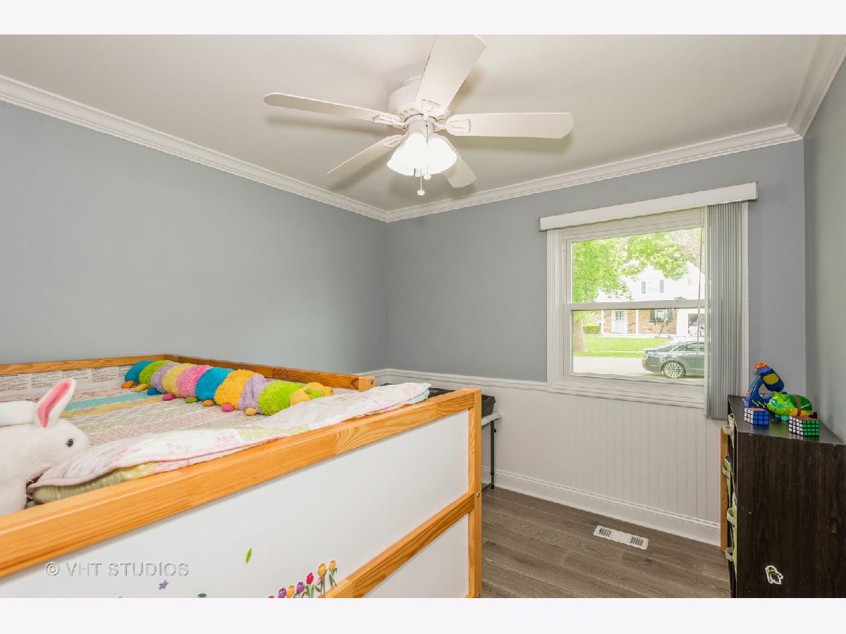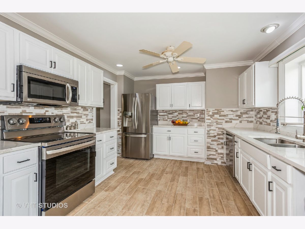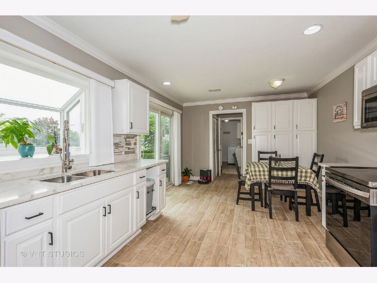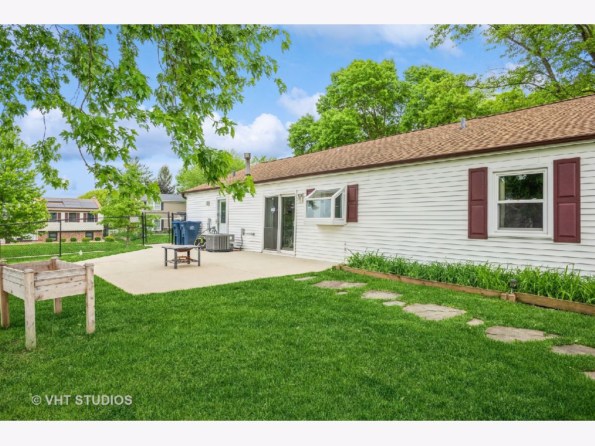 Welcome to this charming 3 bedroom, 2 bathroom ranch home. Step inside to discover hard surface flooring throughout the home (hardwood, ceramic tile or engineered hardwood), creating a seamless and easy-to-maintain living space. The living room is bathed in natural light from the large bow window, perfect for enjoying sunny mornings or cozy evenings with loved ones. The remodeled kitchen is a chef's dream with stunning quartz countertops, white cabinets, custom backsplash, garden window, and wood plank look ceramic tile floors. All appliances were upgraded in 2020 or 2021, ensuring top-of-the-line functionality and style. You'll find this home freshly painted and boasting white crown molding, upgraded 6" base trim, and white six panel doors throughout the home, adding a touch of sophistication to each room. The windows and sliding doors were replaced in 2014. There is a large utility room that houses the washer and dryer with lots of space for storage. The fenced backyard features a five-foot black vinyl coated chain link fence, providing privacy and security for outdoor gatherings. Additionally, a 10x16 shed with electric offers extra storage space or workshop. View spectacular sunsets from your back patio! This home is not only beautiful but also practical, with a new HVAC system in 2024, full wall and ceiling insulation in 2020, and a tear-off roof in 2013. New engineered hardwood installed in all three bedrooms in 2023. Located in the highly desired Hoover Math and Science school district, close to parks, park district activities, dining and shopping, this home is perfect if you are looking to settle down in a welcoming community. Don't miss out on this fantastic opportunity to make this house your new home!