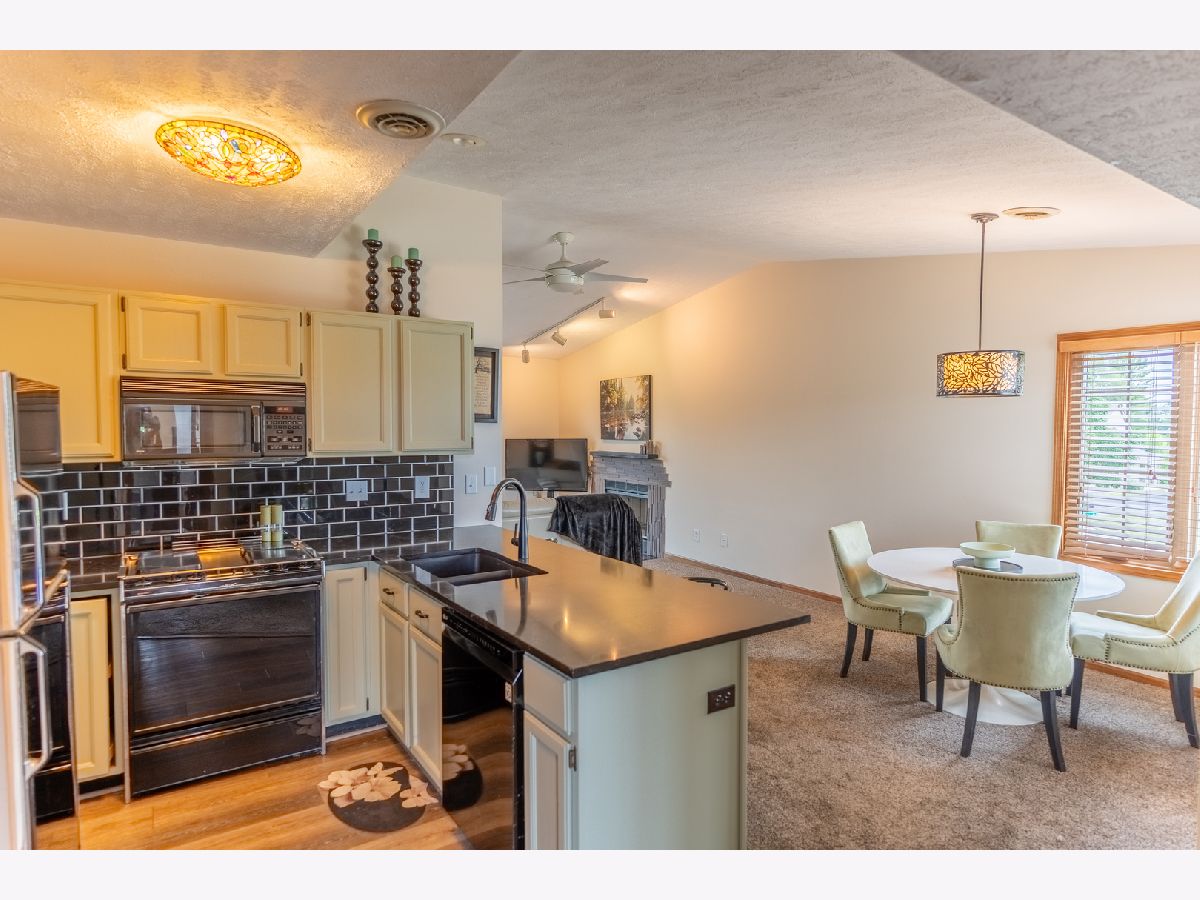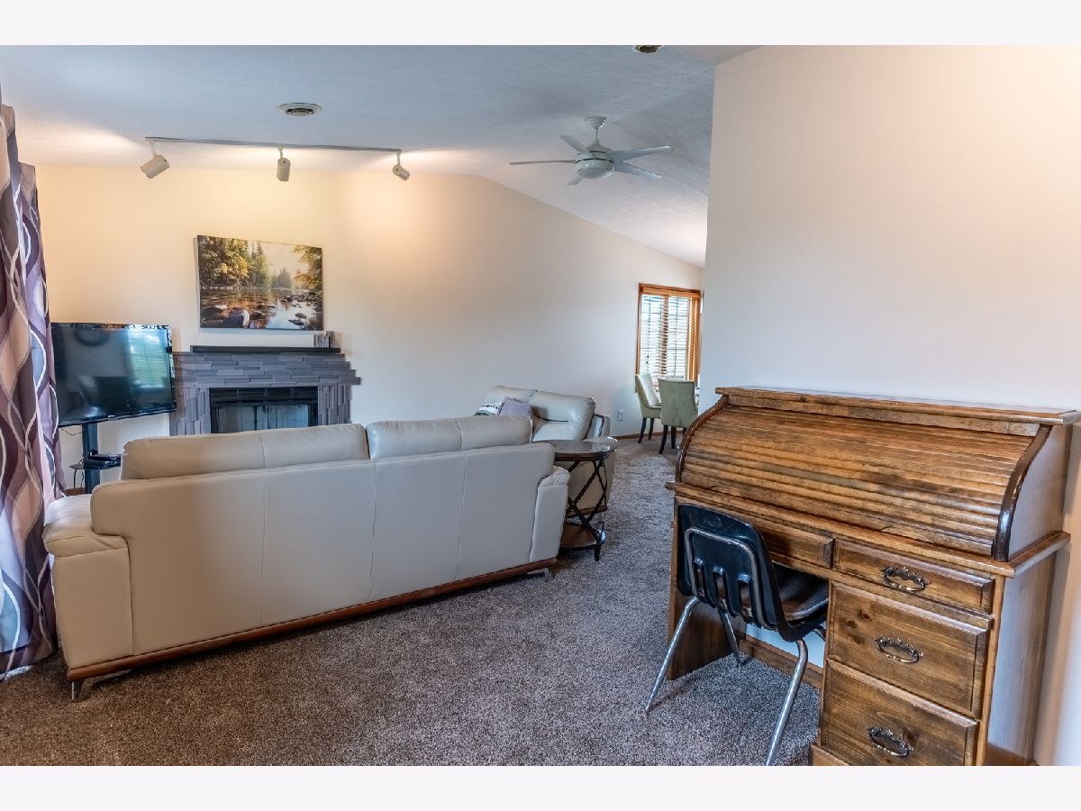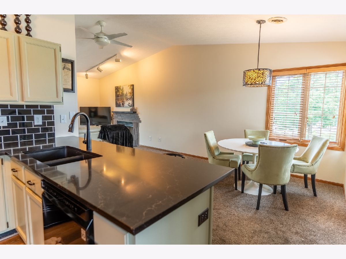 Welcome to this beautifully maintained condo offering over 1,300 square feet of comfortable living space with stylish updates throughout. Step into the inviting foyer with updated flooring that welcomes you into the home living area with vaulted ceilings that create a bright and open atmosphere. The open floor plan flows seamlessly from the foyer into the spacious dining room and updated kitchen, which features granite countertops, a tiled backsplash, breakfast bar, and new flooring-perfect for both everyday living and entertaining. Just off the kitchen, the spacious living room offers a warm fireplace with tile surround and a sliding glass door that opens to a private deck overlooking peaceful open space. An additional flex space off the living room is ideal for entertaining, a reading nook, or a home office. The light-filled primary bedroom includes a unique eyebrow window, a full en-suite bath with tile flooring, and a generous walk-in closet. A second large bedroom and another full bathroom provide plenty of space for guests or family. The separate laundry room adds convenience and functionality. The home also includes a full basement for additional storage or future finished space, and an attached one-car garage for added ease and security. Move-in ready and located in a desirable area, this condo is the perfect place to call home-schedule your showing today!