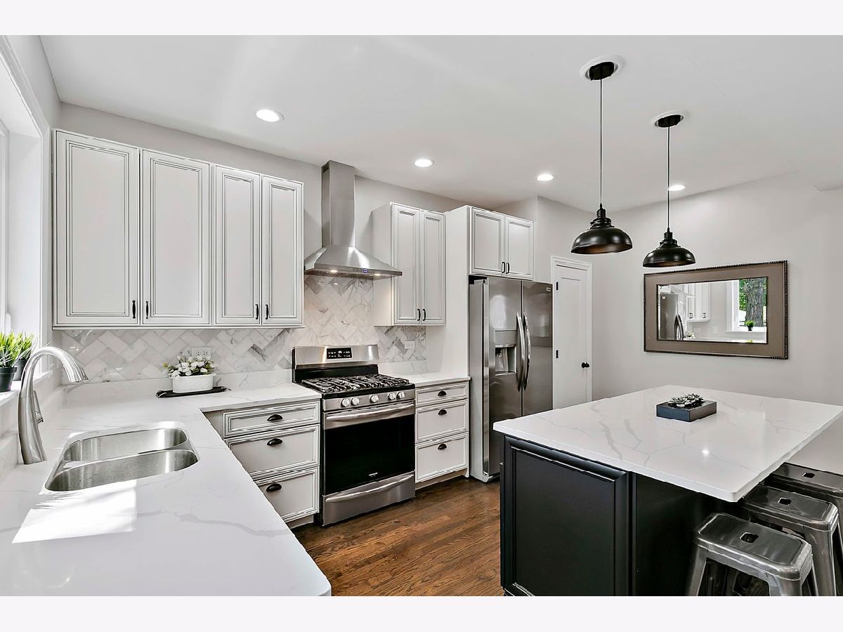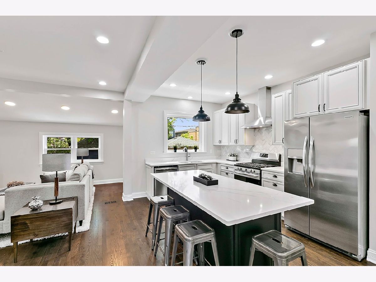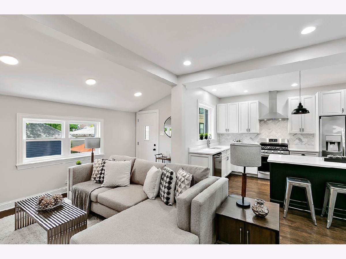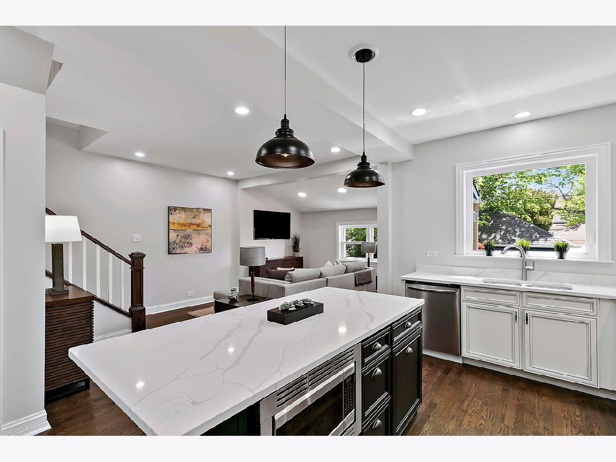 Don't miss this gorgeous , fully remodeled, four bedroom bungalow on a tree-lined street in HOT Portage Park! Features a private, 1st floor master/in-law ensuite bedroom with new bathroom, alcove for linen cabinet, and marked by a beautiful decorative sliding barn door with frosted panels for ambience light; high ceilings, original woodwork, new and newly refinished hardwood floors throughout the 1st floor and a beautiful, large open kitchen that opens up to a welcoming family room. This fabulous chef's kitchen boasts all quartz counters and over-sized island with breakfast bar, marble backsplash, pendant mood lighting, recessed lighting, quality wood cabinetry with nice detailing and modern hardware, and stainless steel appliances including an under-counter microwave. Family room with southern exposure for lots of natural light, and gorgeous oak staircase to spacious 2nd floor with master Bedroom, 2nd bedroom or office, and beautiful newly-tiled bathroom with double vanity and large shelving space. New windows throughout, new hvac, electric, plumbing, hot water heater, concrete sidewalks, garage door, and more! **Close to everything- access to CTA, shops, restaurants, dining, schools, CTA, expressway, and short walk to gorgeous Portage Park with Olympic-size pool and high dive, tennis courts, playground, walking/biking paths, baseball fields and community center.