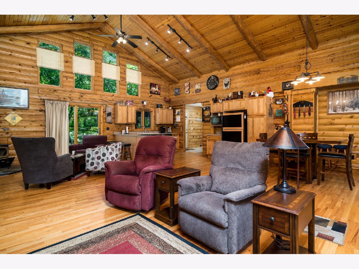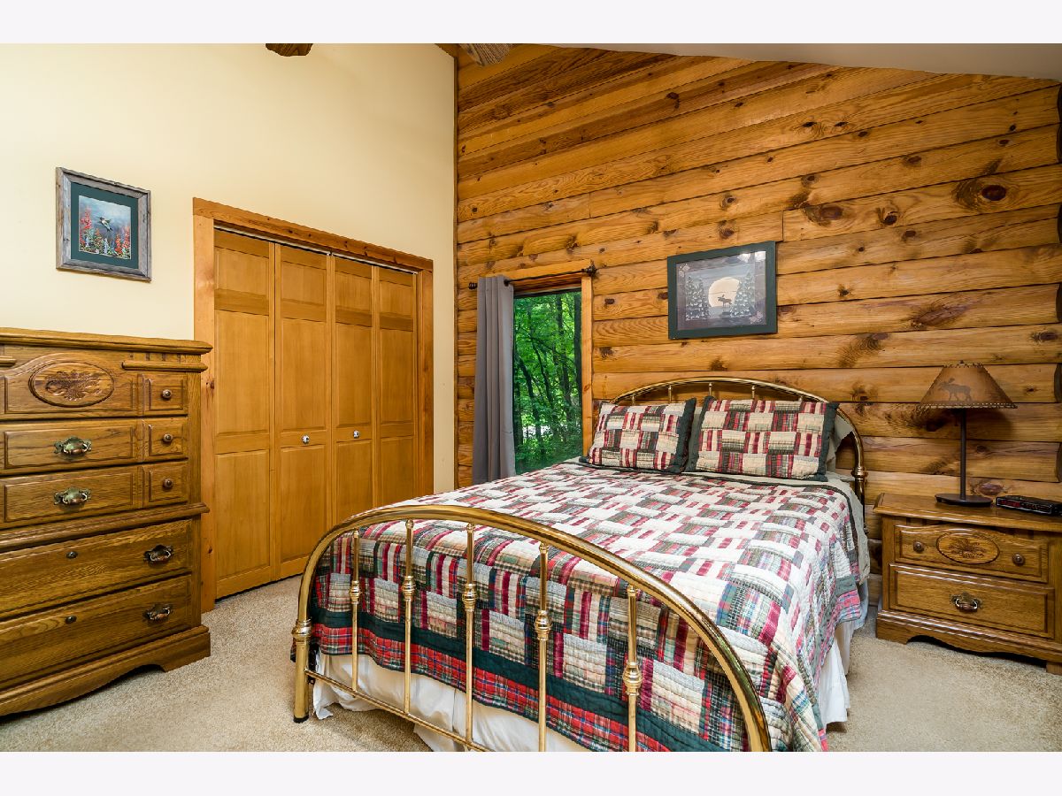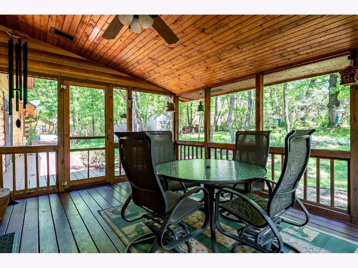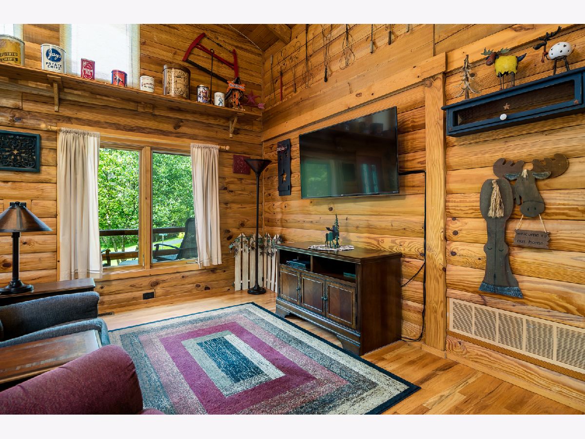 Custom Log Home sits on a double wooded lot. Grand Open floor plan with vaulted ceilings and large living room, dining room and kitchen with wood burning stove. Main floor laundry, perfect screened porch plus deck and a perennial filled yard with fire-pit and garden shed. Master bedroom with master bath. Second and third bedrooms are a good size. Full basement with family room area, shop and 3rd bath. Amenities include full southern yellow pine logs, hardwood floors, vaulted ceilings, sauna and an attached garage. Homeowners can enjoy a stocked lake, private roads, 2 beaches and tennis courts. Virtual tour available for your preview.
