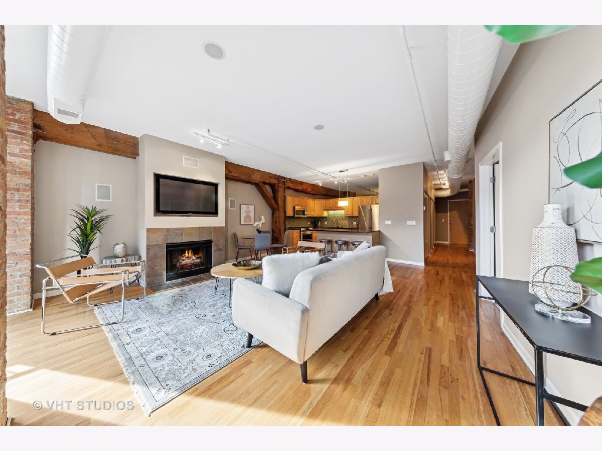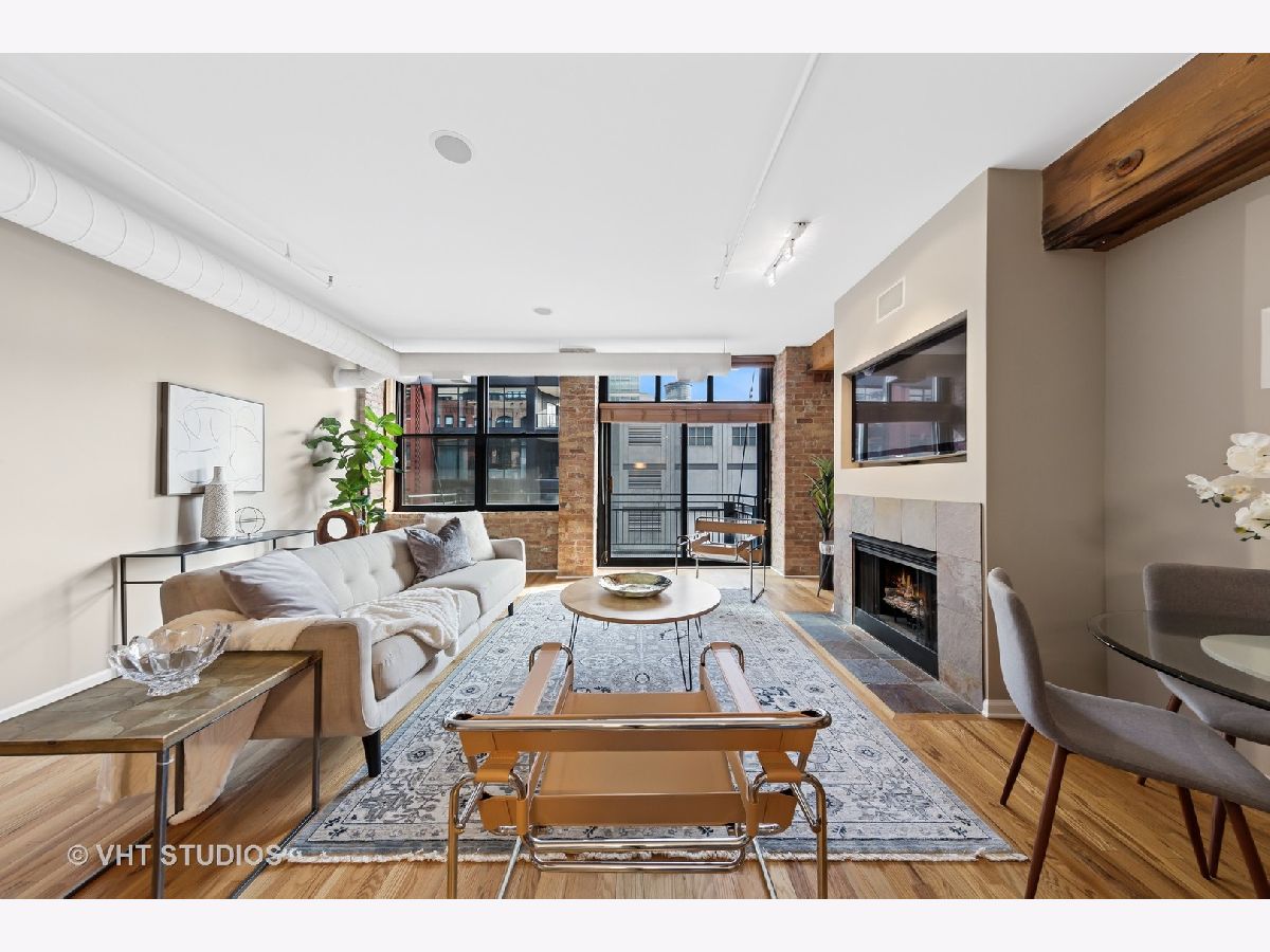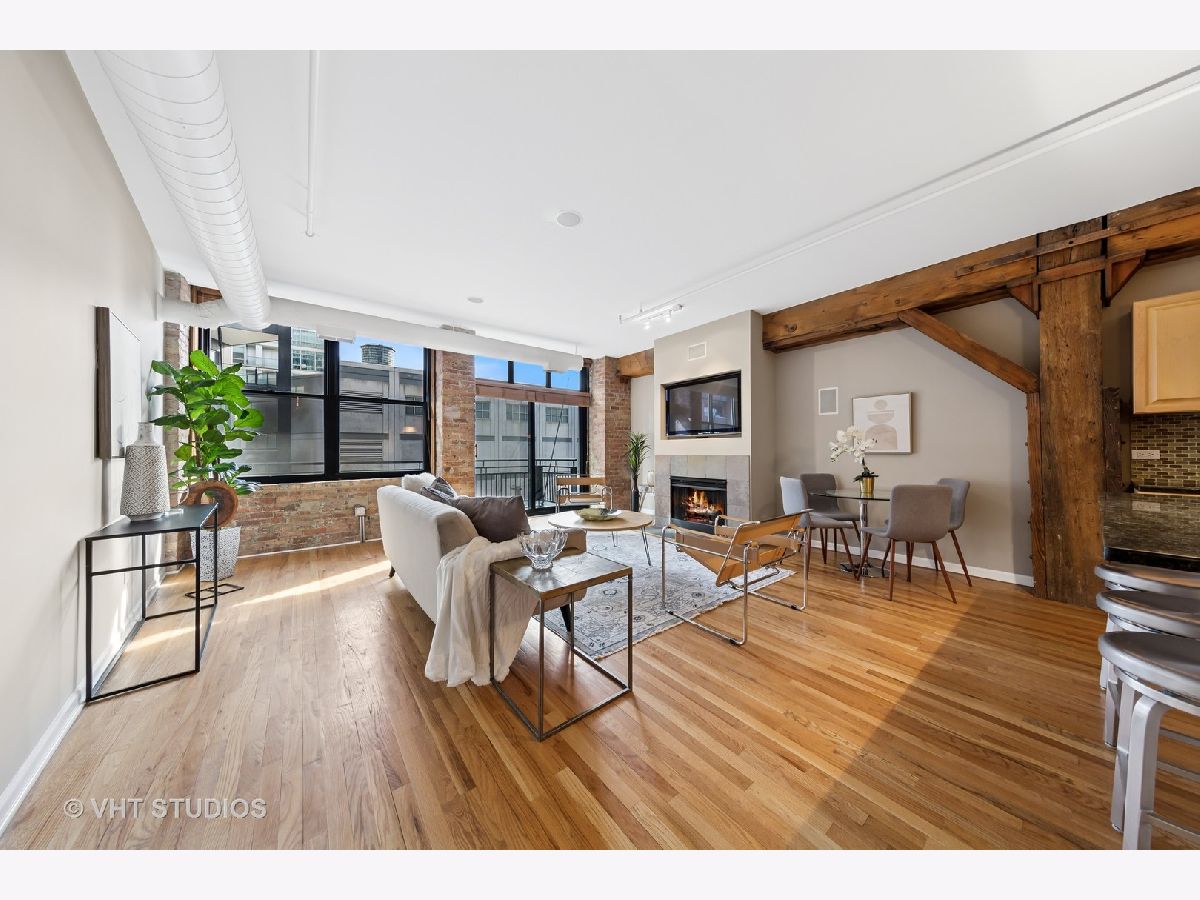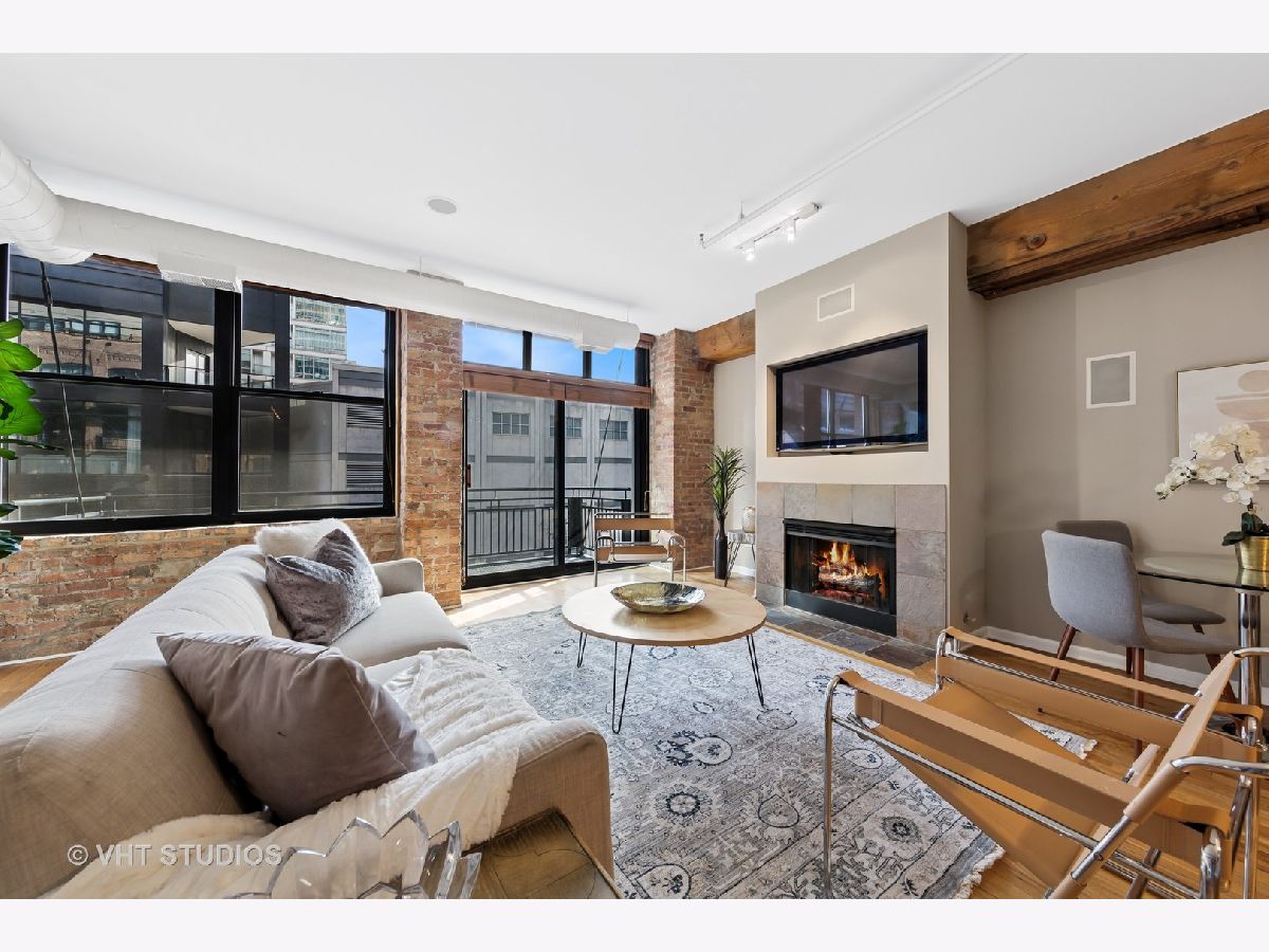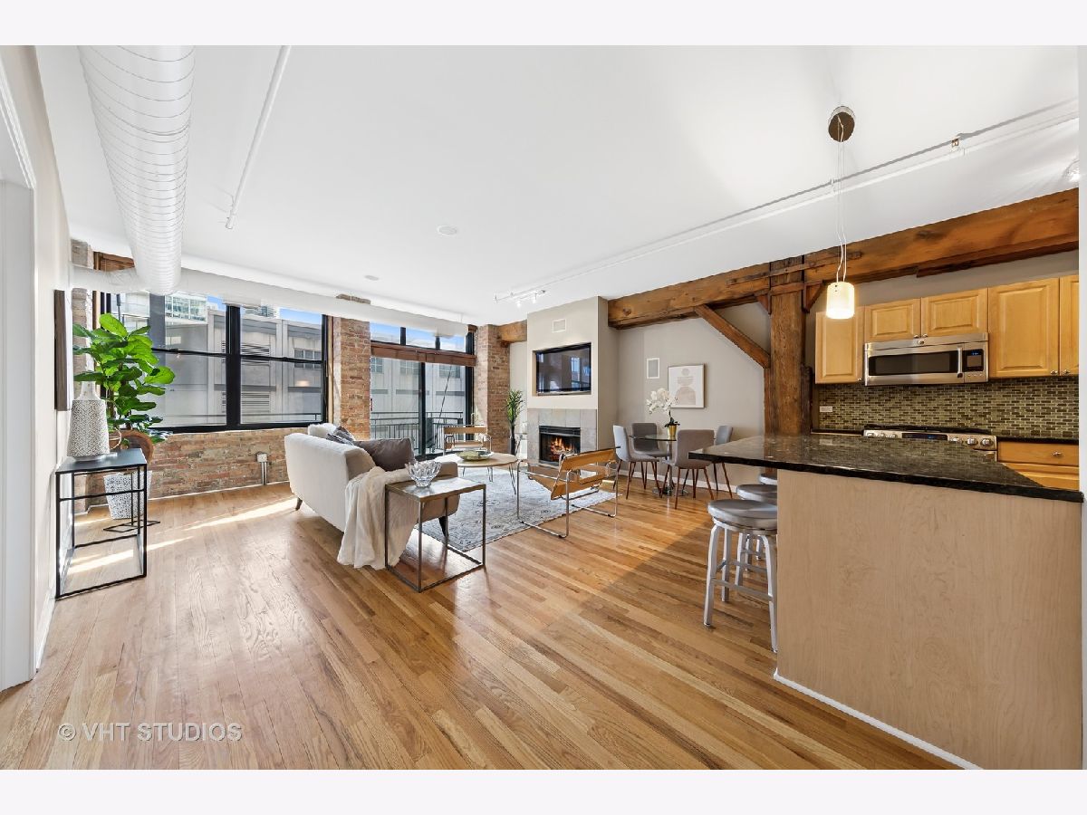 Stunning 2BR/2BA timber loft perfectly situated in the heart of River North. This South facing, spacious floor has a large living room with exposed brick, stunning timber accents, a gas fireplace, and easy access to a spacious balcony! Adjacent to the living room is an open concept kitchen featuring an oversized marble island and bar seating, tile backsplash, and stainless-steel appliances. Spacious primary suite boasting (2) full walls of closets. The primary bathroom features a marble dual vanity, separate standing shower, and a Jacuzzi tub. A generously sized second bedroom is large enough for a bed and full office. Hardwood floors throughout main areas and new carpet in the bedrooms. Potential for an office nook in hallway as well. In-home laundry. Building amenities include 24-hour door staff, fitness center, and incredible skyline views from the common roof deck. Located within close proximity to public transportation, parks, dog park and all of River North's fantastic shops and restaurants. This home offers the perfect blend of neighborhood vibe with city conveniences! Heated garage parking spot available and must be sold with unit. New HVAC in 2024.