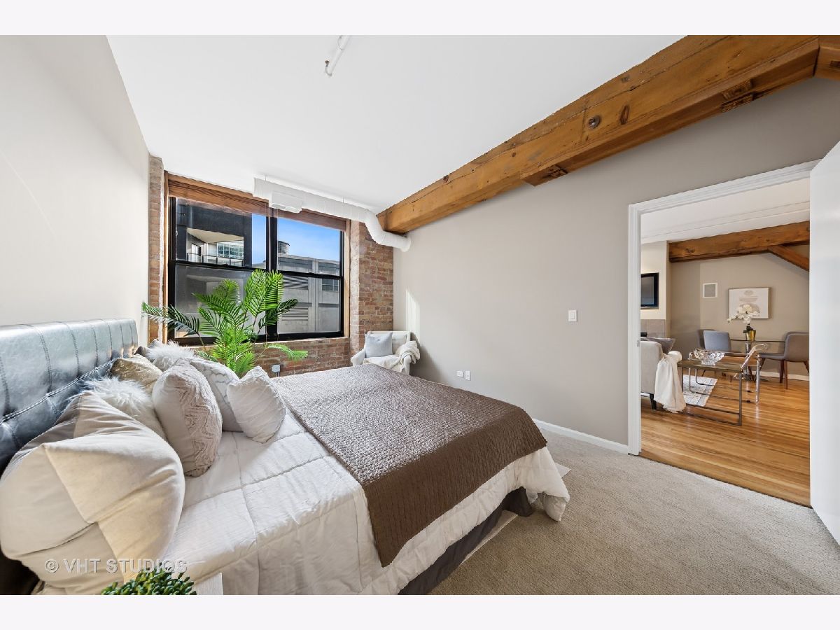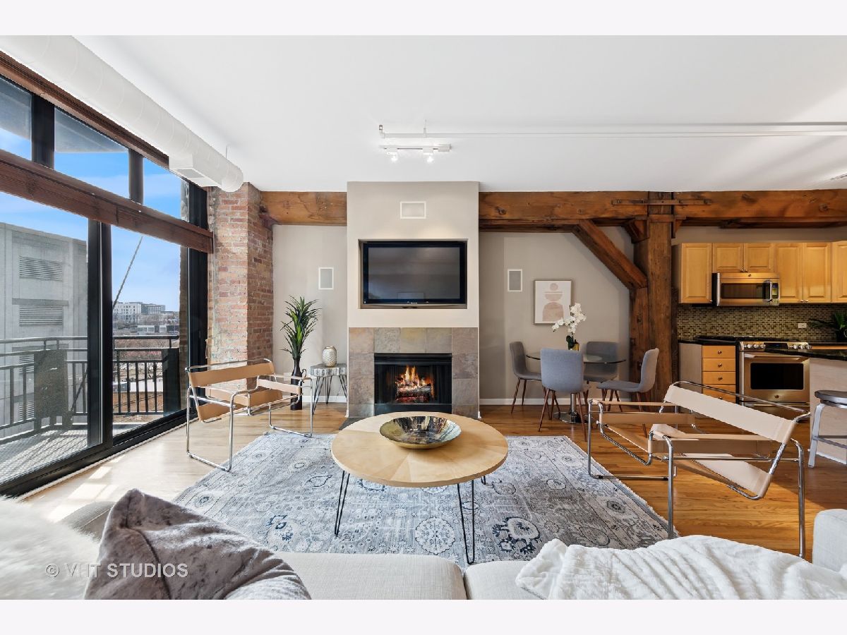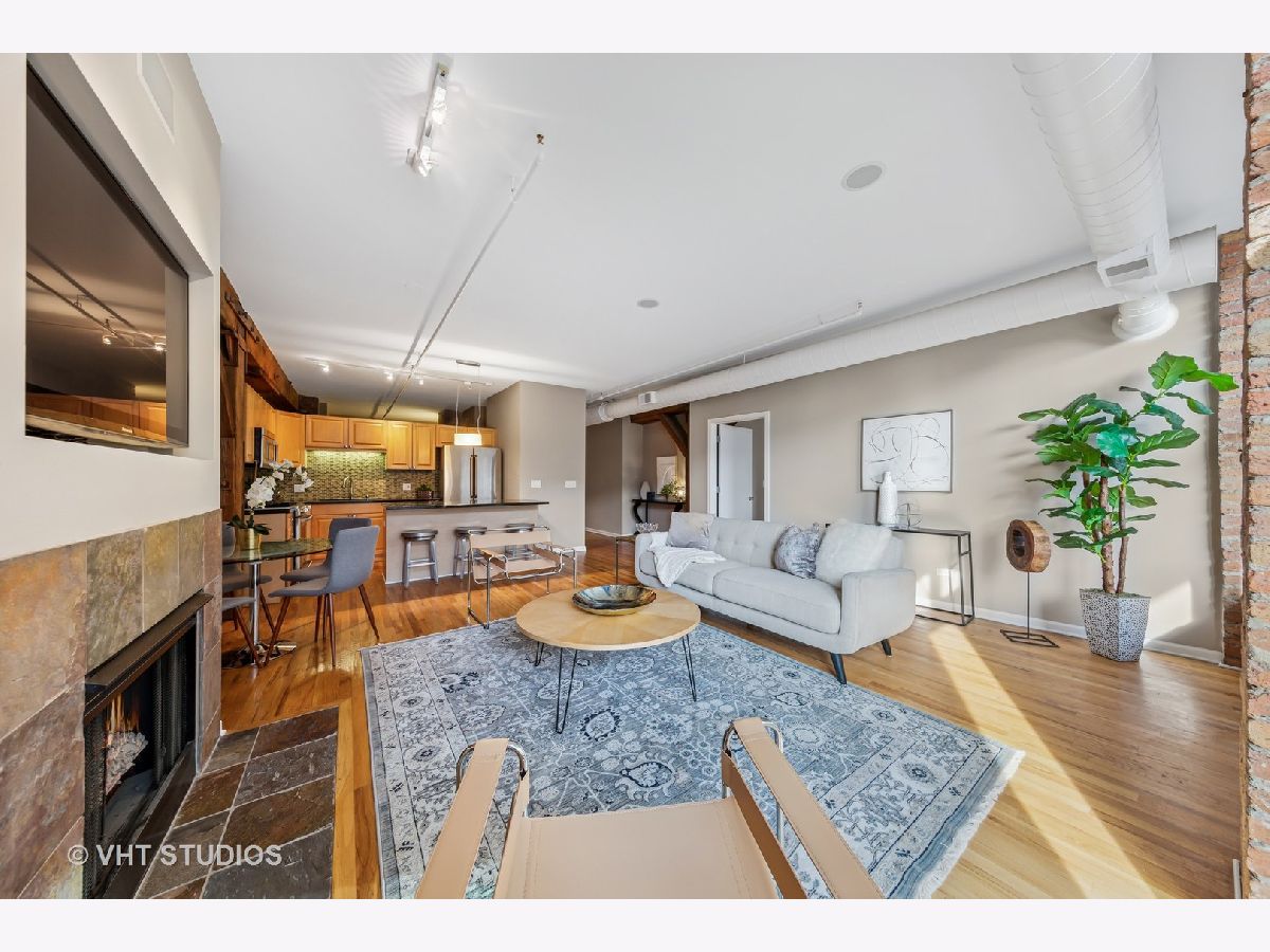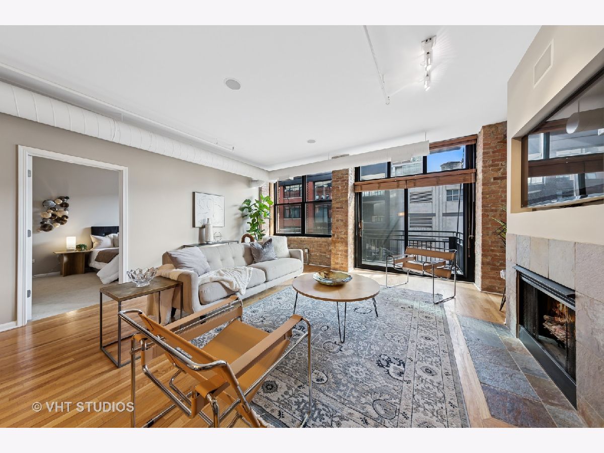 Stunning 2BR/2BA timber loft perfectly situated in the heart of River North. This South facing, spacious floor has a large living room with exposed brick, stunning timber accents, a gas fireplace, and easy access to a spacious balcony! Adjacent to the living room is an open concept kitchen featuring an oversized marble island and bar seating, tile backsplash, and stainless-steel appliances. Spacious primary suite boasting (2) full walls of closets. The primary bathroom features a marble dual vanity, separate standing shower, and a Jacuzzi tub. A generously sized second bedroom is large enough for a bed and full office. Hardwood floors throughout main areas and new carpet in the bedrooms. Potential for an office nook in hallway as well. In-home laundry. Building amenities include 24-hour door staff, fitness center, and incredible skyline views from the common roof deck. Located within close proximity to public transportation, parks, dog park and all of River North's fantastic shops and restaurants. This home offers the perfect blend of neighborhood vibe with city conveniences! Heated garage parking spot available and must be sold with unit. New HVAC in 2024.