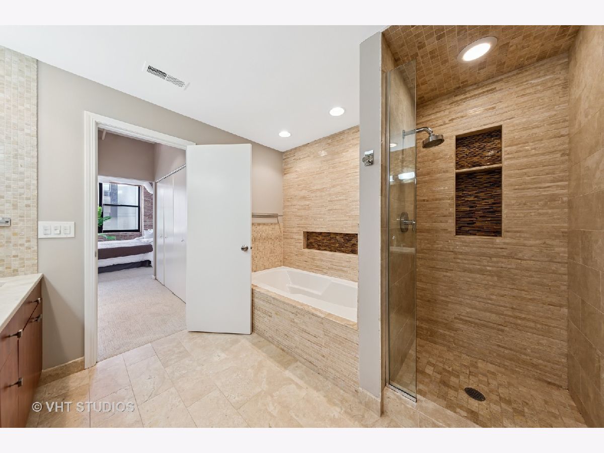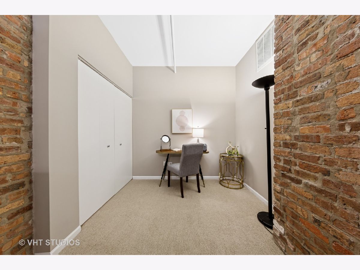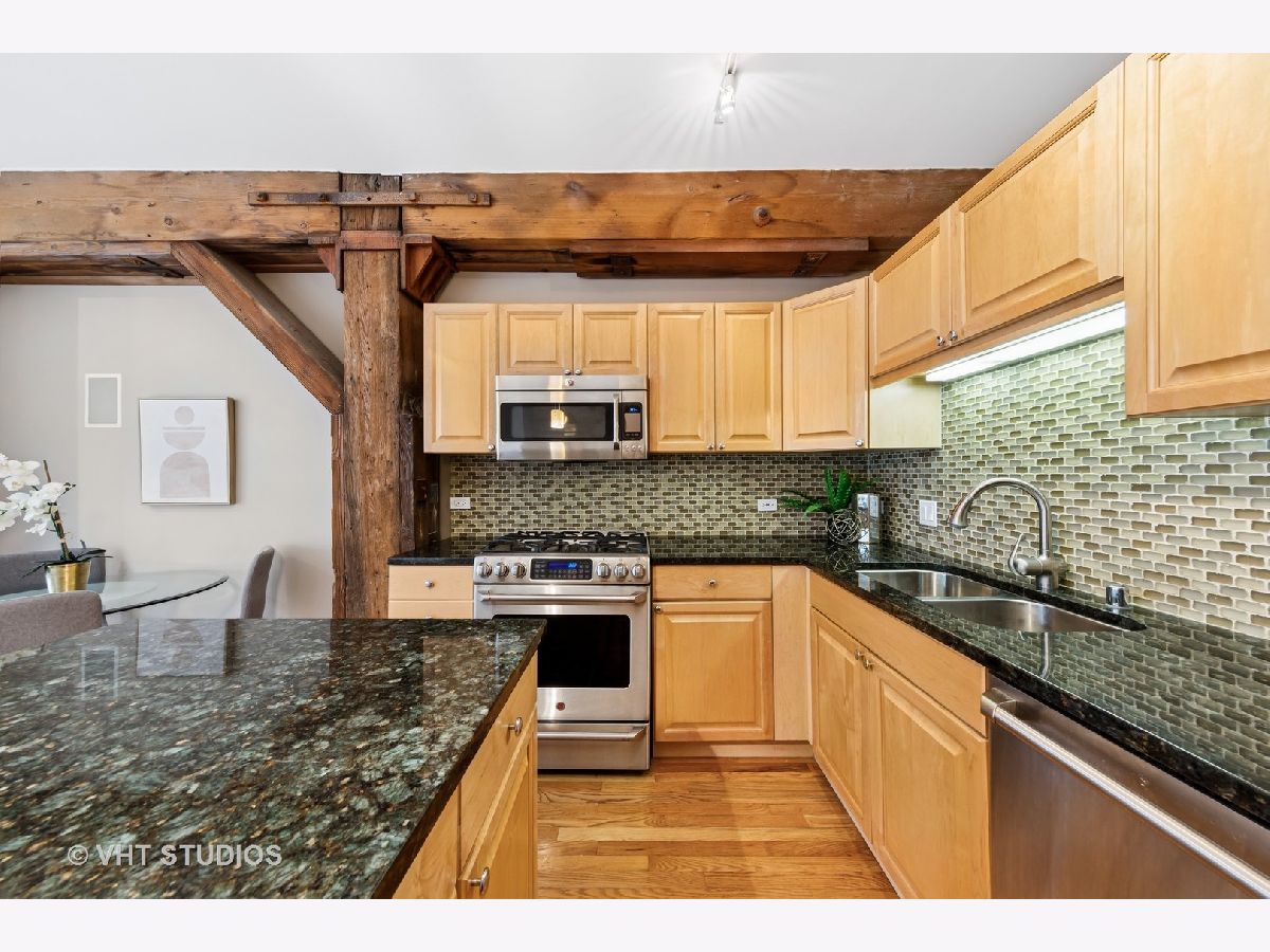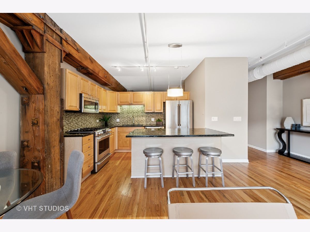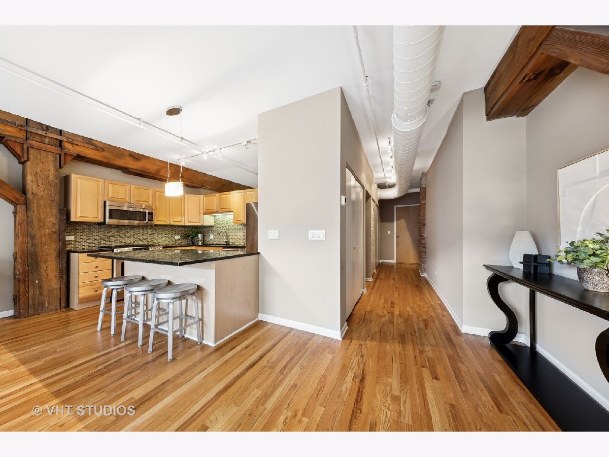 Stunning 2BR/2BA timber loft perfectly situated in the heart of River North. This South facing, spacious floor has a large living room with exposed brick, stunning timber accents, a gas fireplace, and easy access to a spacious balcony! Adjacent to the living room is an open concept kitchen featuring an oversized marble island and bar seating, tile backsplash, and stainless-steel appliances. Spacious primary suite boasting (2) full walls of closets. The primary bathroom features a marble dual vanity, separate standing shower, and a Jacuzzi tub. A generously sized second bedroom is large enough for a bed and full office. Hardwood floors throughout main areas and new carpet in the bedrooms. Potential for an office nook in hallway as well. In-home laundry. Building amenities include 24-hour door staff, fitness center, and incredible skyline views from the common roof deck. Located within close proximity to public transportation, parks, dog park and all of River North's fantastic shops and restaurants. This home offers the perfect blend of neighborhood vibe with city conveniences! Heated garage parking spot available and must be sold with unit. New HVAC in 2024.
