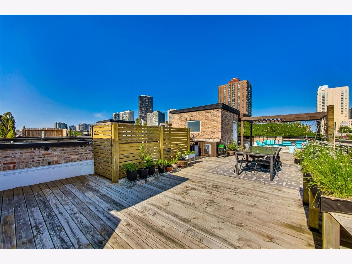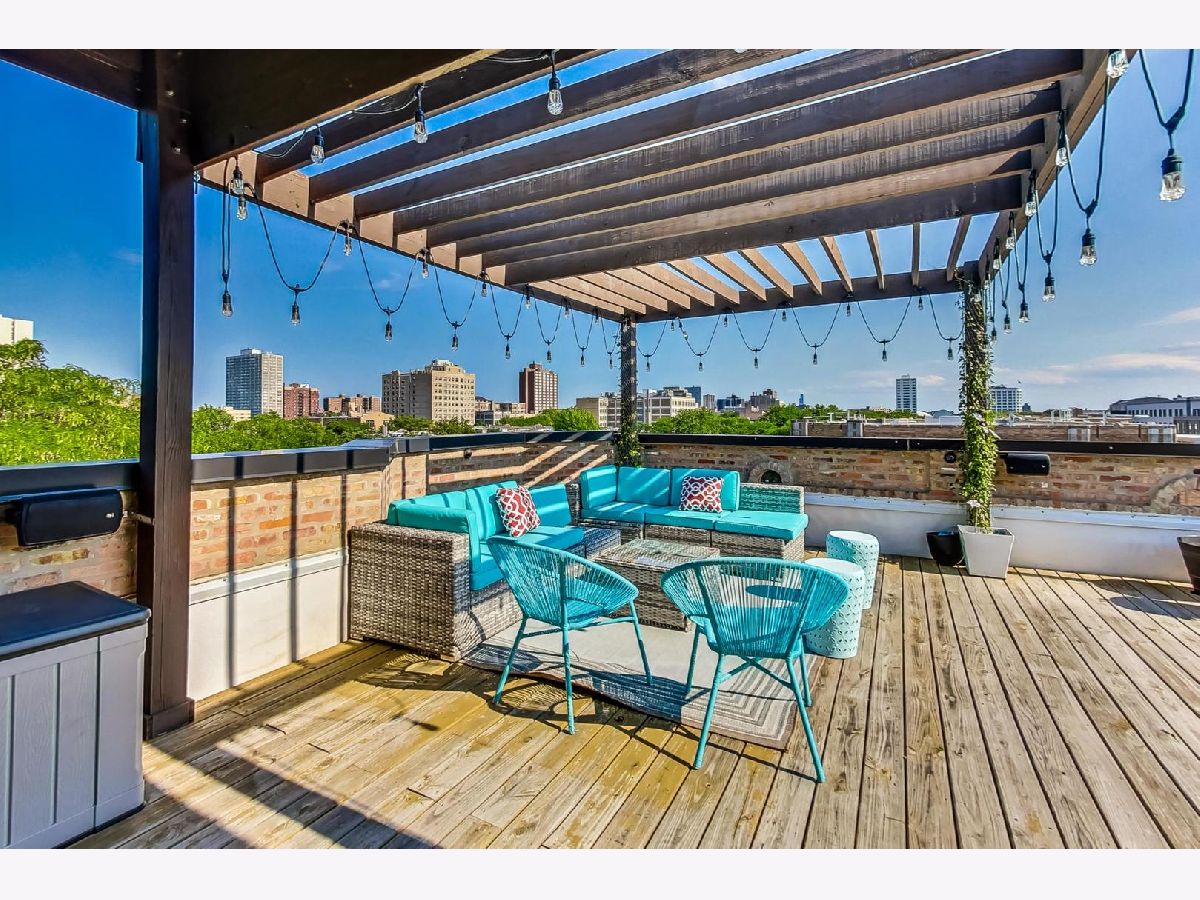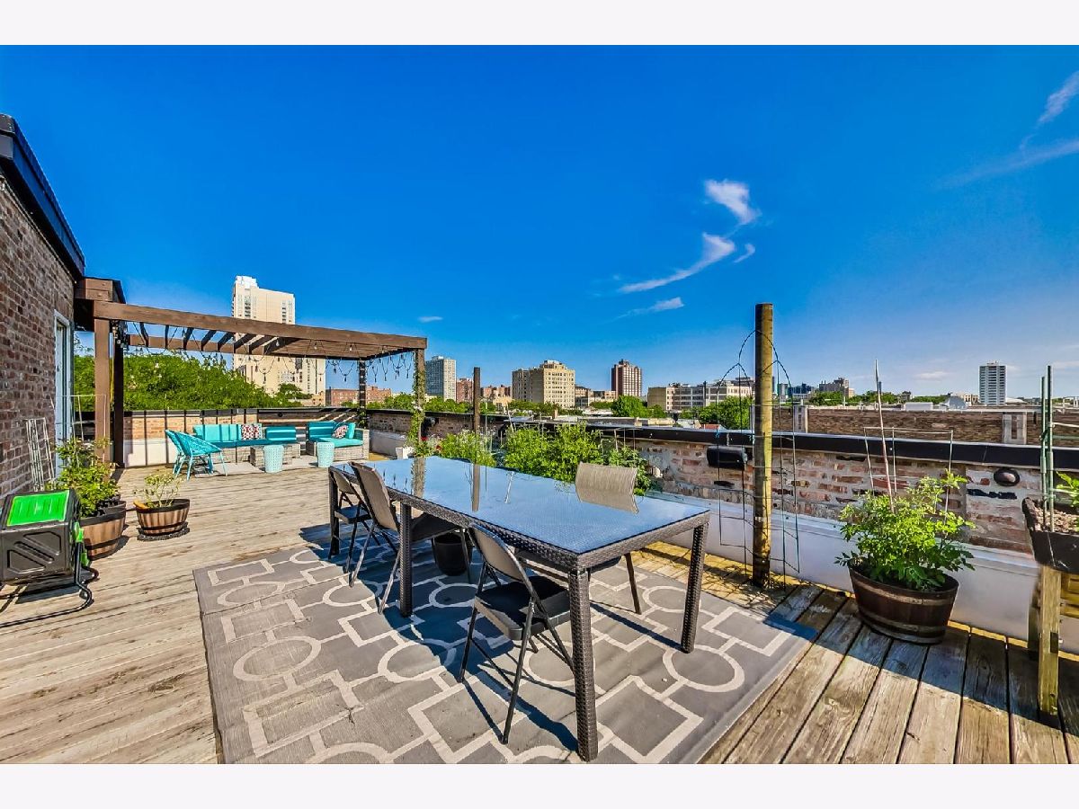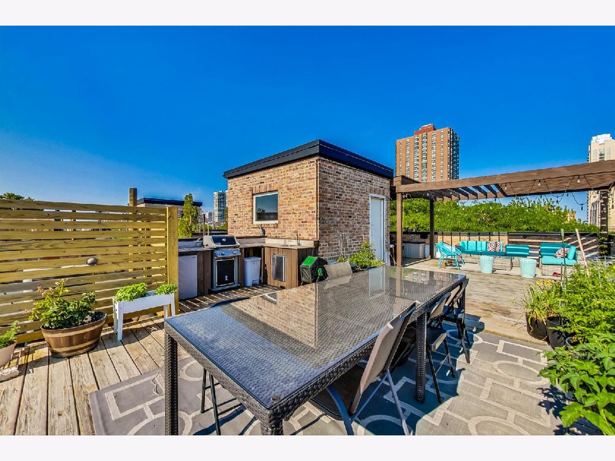 This Edgewater penthouse corner unit is a hidden gem, offering a truly coveted feature in Chicago: 1000 square feet of PRIVATE UNOBSTRUCTED ROOFTOP space. Imagine having your own exclusive outdoor oasis with 360-degree views of the city, perfect for entertaining, relaxing, and gardening. This spacious home includes 2 bedrooms plus an office space and two full baths. The open concept living/dining/kitchen area features oak flooring throughout and stunning high ceilings. The living room is adorned with custom built-ins and wainscoting, and a newly remodeled gas fireplace. The kitchen boasts a large center island with a wine fridge, double bullnose granite countertops, and cherry wood cabinetry. The primary suite offers a walk-in closet and a primary bath with a steam shower. However, the star of this home is the PRIVATE ROOF DECK, which includes a fully equipped outdoor kitchen. This rooftop space is a gardener's paradise, offering full sun, partial sun, and full shade options. Additionally, an outdoor speaker system was installed in 2019, making it an ideal spot for both relaxation and entertainment. One assigned parking spot in a detached garage is included. Recent preventative maintenance improvements to, ensure peace of mind with updates such as a new water heater (2021), new furnace & A/C unit (2020), and a newer roof (2018). Located a short walk from Foster Beach and Andersonville's dining and shopping, and just a 2-minute walk to the Berwyn red line stop. Conveniently close to Jewel, CVS, and Mariano's. Don't miss out on this extraordinary home! Note: This is not an elevator building.