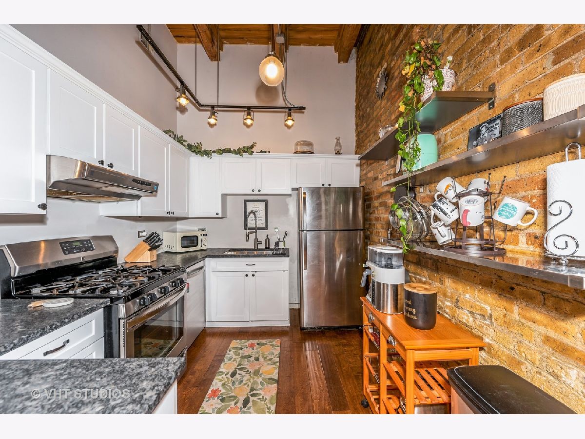 Stunning River West, 2-bed, 1-bath timber loft condo in highly desirable Ada Street Lofts! One bedroom is smaller and best used as office or nursery. Gorgeous all brick, elevator building in PERFECT LOCATION WITH PARKING INCLUDED! Great floor plan with open kitchen, PRIVATE OUTSIDE PATIO, EXPOSED BRICK, 11 FOOT CEILINGS, IN UNIT LAUNDRY, and wood burning FIREPLACE. ROOF DECK WITH AMAZING SKYLINE VIEWS! 4 blocks to Chicago blue line stop, short walk to West Loop/Restaurant Row/Fulton Market and lots of breweries, Eckhart Park 3 blocks away and Mondial, Skinner, and Ohio Street Dog Parks under a mile. INTERNET INCLUDED IN HOA.
