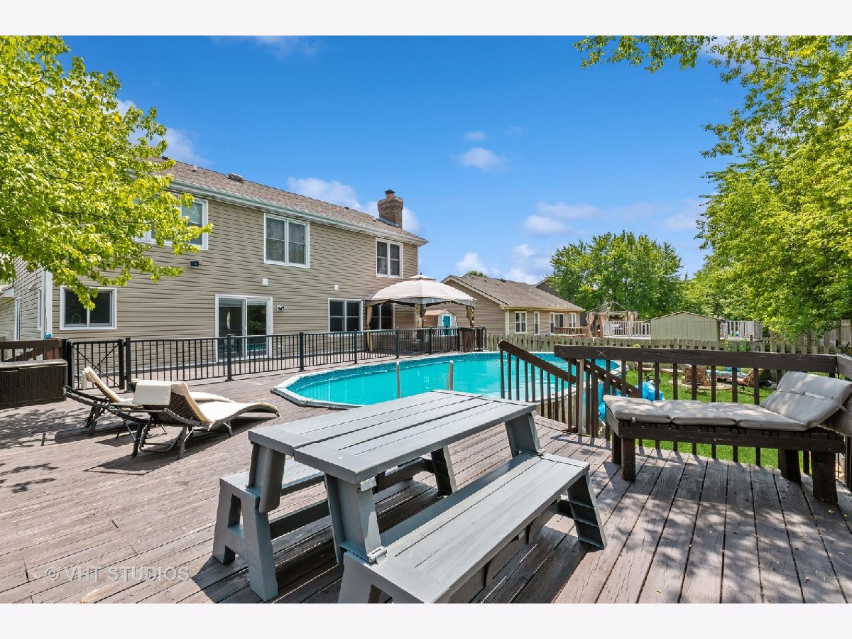 Attention, homebuyers! We invite you to explore this magnificent French Country style residence boasting four bedrooms and two and a half bathrooms. As you enter the home, the two-story foyer is illuminated with natural light and showcases rich hardwood floors that seamlessly flow throughout the main level. The chef's kitchen is sure to impress even the most discerning cooks, boasting 42" updated cabinetry, granite countertops, and top-of-the-line stainless steel appliances. The family room is conveniently located adjacent to the kitchen, with a beautiful brick fireplace that adds a cozy touch. The living room, with its bay window, and separate dining room provide an excellent layout for hosting and entertaining guests. Upstairs, you will find four spacious bedrooms, including the main bedroom, which features a walk-in closet, spa bath soaking tub, separate shower, and double sink. Outside, you can enjoy your very own outdoor oasis, complete with a huge wrap deck, pool with a new liner and heater, and two outdoor entertaining areas with covered gazebos. The fenced yard provides privacy, making it an ideal space for relaxation and recreation. The partially finished basement provides additional living space, with an extra crawl space for storage. Recent updates include the furnace, hot water heater, pool liner, and pool heater, making this home move-in ready. This is a wonderful opportunity to make this house your very own home.
