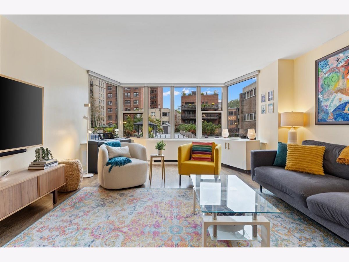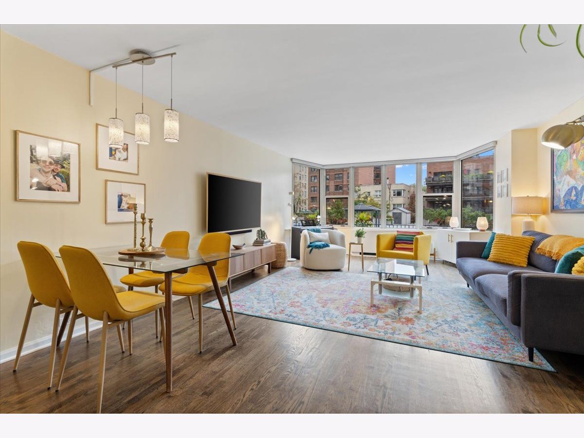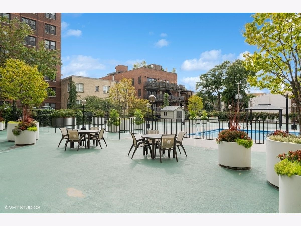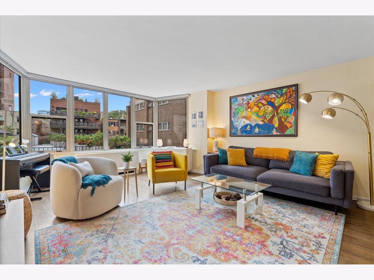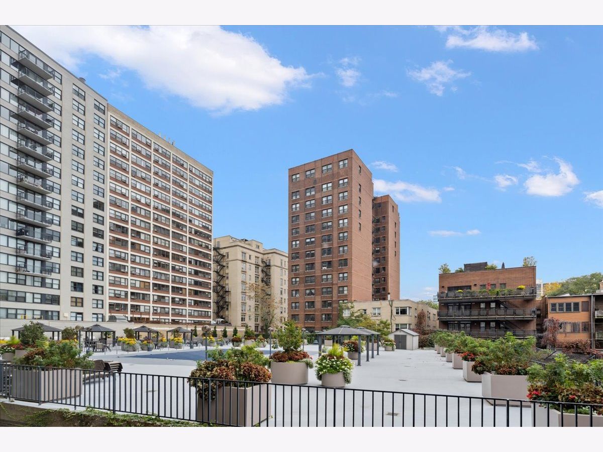 SUN-FILLED TWO-BEDROOM, ONE-BATHROOM CONDO in one of East Lakeview's most desirable full-amenity buildings - 525 W HAWTHORNE. This south-facing home features an inviting open-concept living and dining area framed by lush, landscaped urban views-perfect for relaxing or entertaining. Enjoy hardwood floors throughout the main living area. The striking great room allows for large-scale furniture and a full dining setup. The cheery kitchen offers granite countertops and stainless-steel appliances for those who like to cook. The updated bathroom offers a soaking tub, modern vanity, and contemporary lighting and mirror. The king-sized primary bedroom boasts both a walk-in closet and an additional wall closet, while the queen-sized second bedroom functions beautifully as a guest room or home office. One deeded garage parking space is included in the price. Storage cage on same floor. Residents of 525 W Hawthorne Place enjoy an array of amenities including 24-hour door staff, on-site engineer, outdoor pool and sundeck, fitness center, and package receiving room. Situated in the heart of East Lakeview, you're steps from the lakefront, dining, shopping, and easy transportation options.