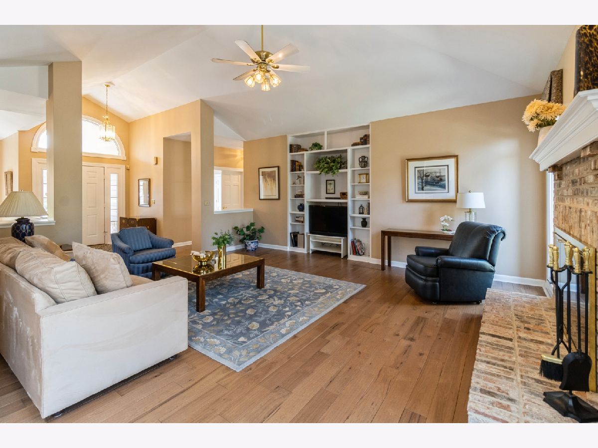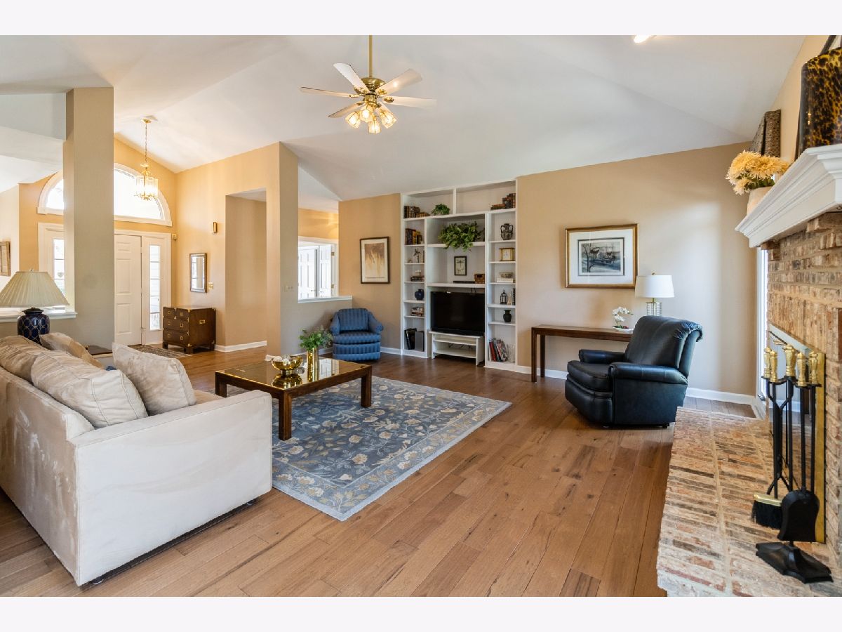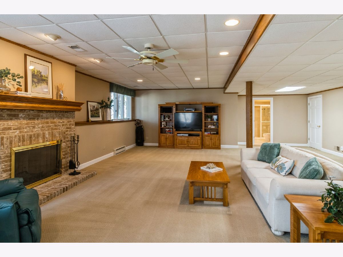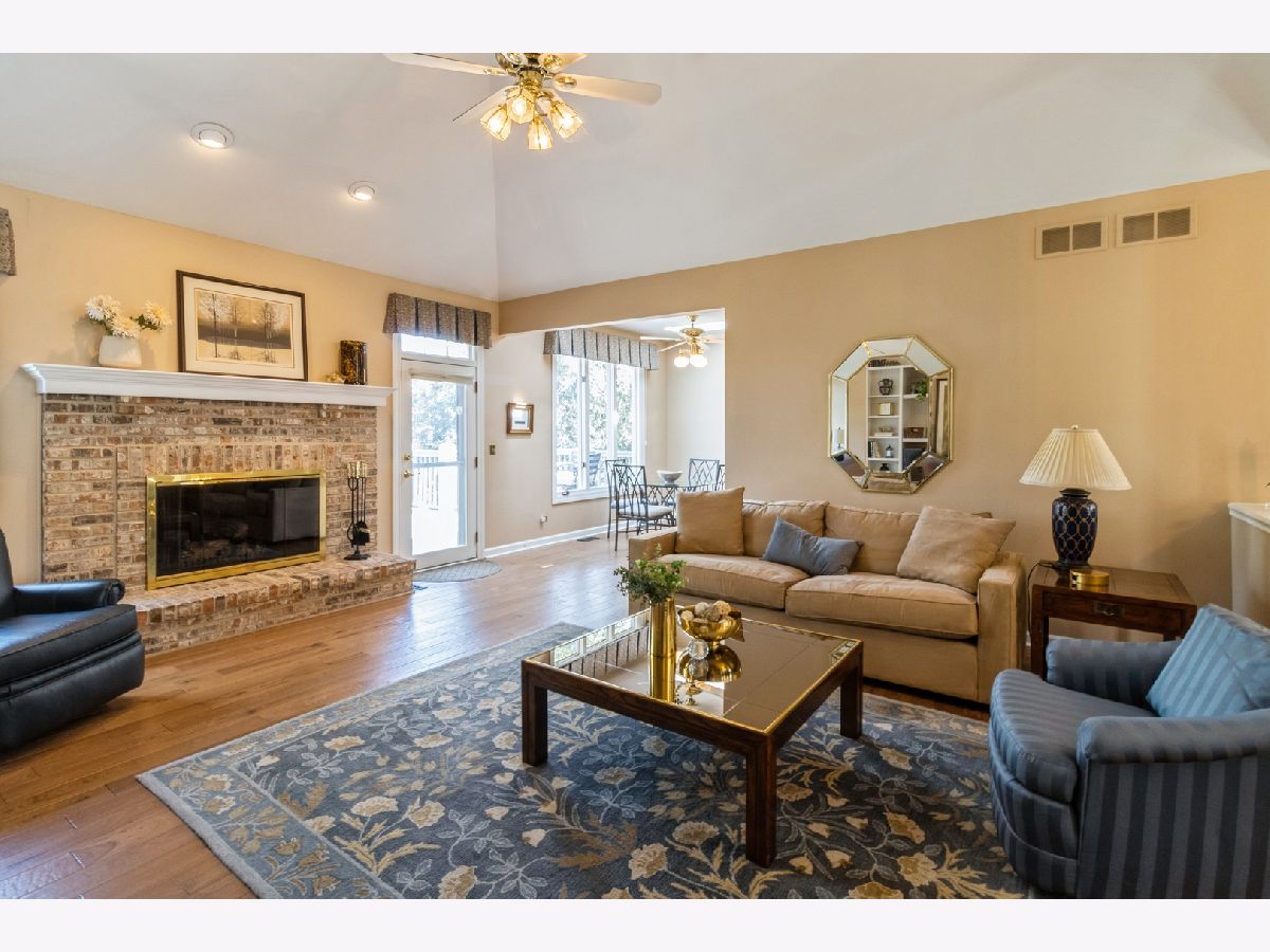Welcome to 530 Vintage Drive in the highly desirable Fairways of Boulder Ridge! This beautifully maintained brick and cedar ranch home features 3 bedrooms plus a finished lower-level 4th bedroom/exercise room, 3 full bathrooms, and a 2.5-car attached garage. Curb appeal shines with professionally landscaped grounds, a brick paver walkway, and a charming covered front porch. HOA includes lawn care and snow removal for low-maintenance living year-round. Step inside to an open-concept layout with engineered hardwood floors and a generous amount of natural light throughout the home. The spacious family room boasts vaulted ceilings, a cozy gas-start fireplace with brick surround, and a built-in media center-perfect for relaxing or entertaining. The large eat-in kitchen is complete with stainless steel appliances, solid surface countertops, a tile backsplash, and rich cabinetry. From the kitchen dining area, traditional door leads to a nicely sized deck-ideal for entertaining or simply enjoying the peaceful privacy of your surroundings. A formal dining room with tray ceiling adds elegance to your gatherings. The oversized first-floor master suite features a tray ceiling, large walk-in closet with additional storage under a custom window seat, and a beautifully renovated master bath with dual molded sinks, granite countertops, custom lighting, and a luxurious dual shower with seating. A second updated full bath and two additional bedrooms-including one currently used as a home office/den with tray ceiling and walk-in closet-complete the main level. Head downstairs to the fully finished lower-level walkout basement, where you'll find an expansive recreation space with a custom wet bar (six barstools included) with included beverage refrigerator, a second gas-start, wood-burning fireplace with a brick accent wall, and oversized sliders that lead to a large concrete patio-perfect for outdoor entertaining. The lower level also includes a finished exercise room that can easily serve as a 4th bedroom, with a third full bath conveniently located just outside the door. Additional highlights include two large storage rooms, updated mechanicals, a water softener, two included basement refrigerators, newer hot water heater, a high-efficiency furnace, and a Carrier humidifier. Loads of mature landscaping adds to the backyard privacy plus additional guest parking close-by. This original-owner home has been meticulously cared for and is move-in ready-don't miss your opportunity to live in one of Lake in the Hills' most desirable gated communities!