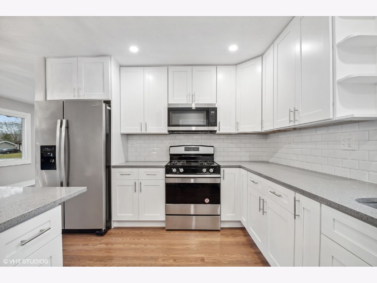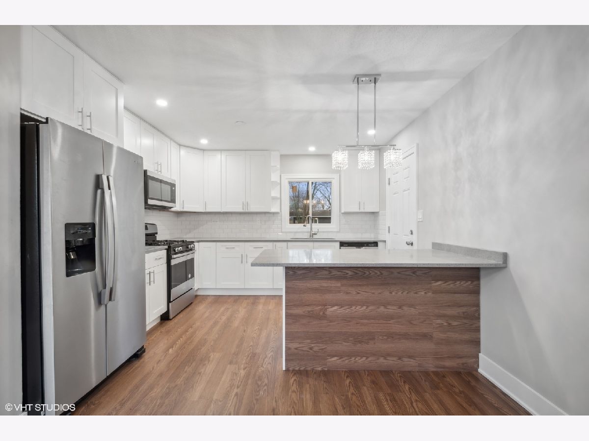 FULLY REHABBED HOUSE in desirable subdivision! Walk into spacious open floorplan with dark hardwood floors, recessed lights, and living room walkout. Large dining area with combo chef's kitchen featuring high end stainless-steel appliances, white shaker cabinets, luxury countertops, tiled backsplash, and custom built island/breakfast bar. Massive lower level family room with storage, half bath, and laundry. Upstairs with three generous sized bedrooms and elegant bathroom with new tilework and finishes. All new windows and doors throughout. Huge corner lot with concrete patio, attached garage, driveway, and enormous fenced backyard. Walk to park and clubhouse. Bartlett School District! West of County Farm Road and minutes away from metra, shopping and I-390 express way.