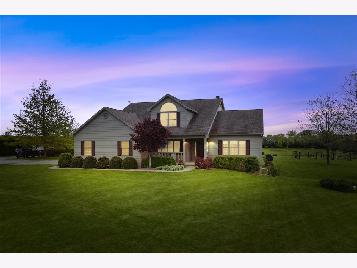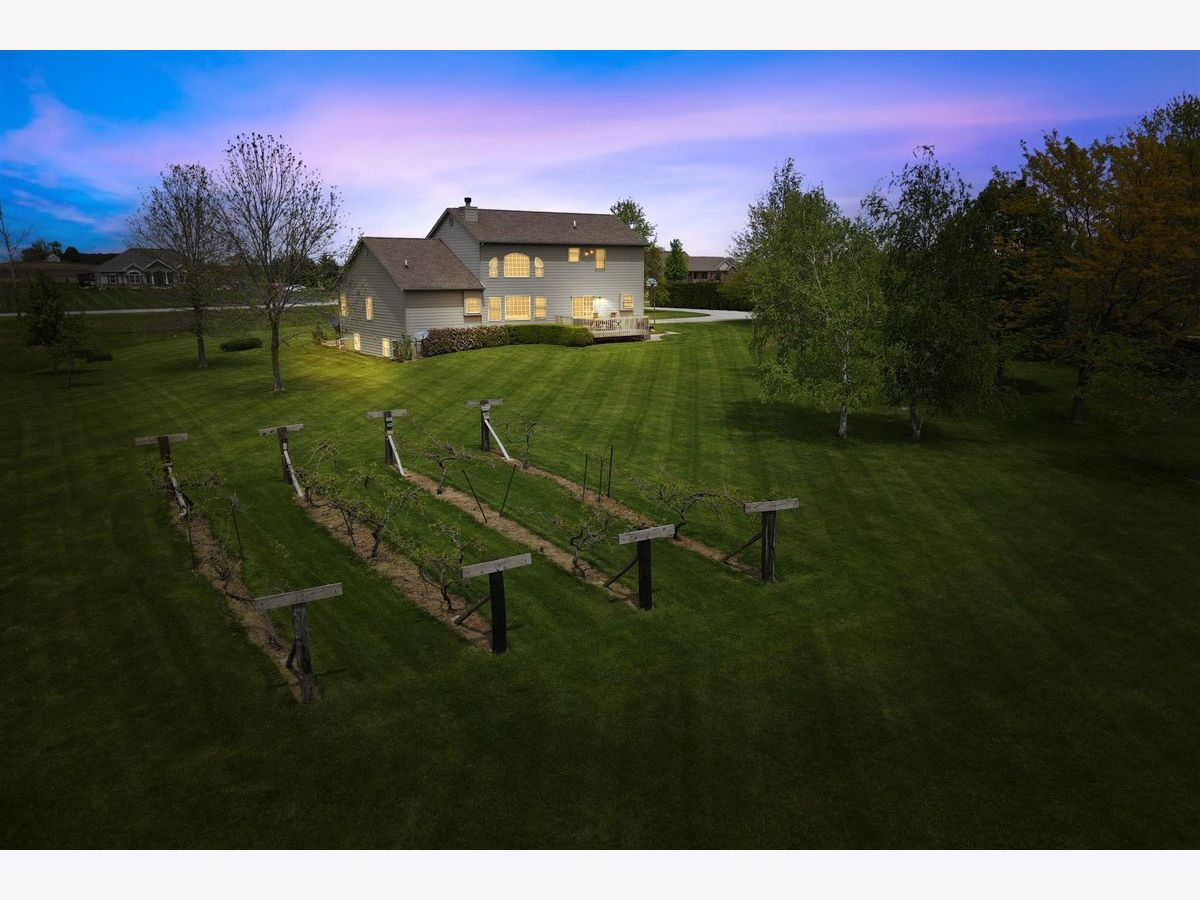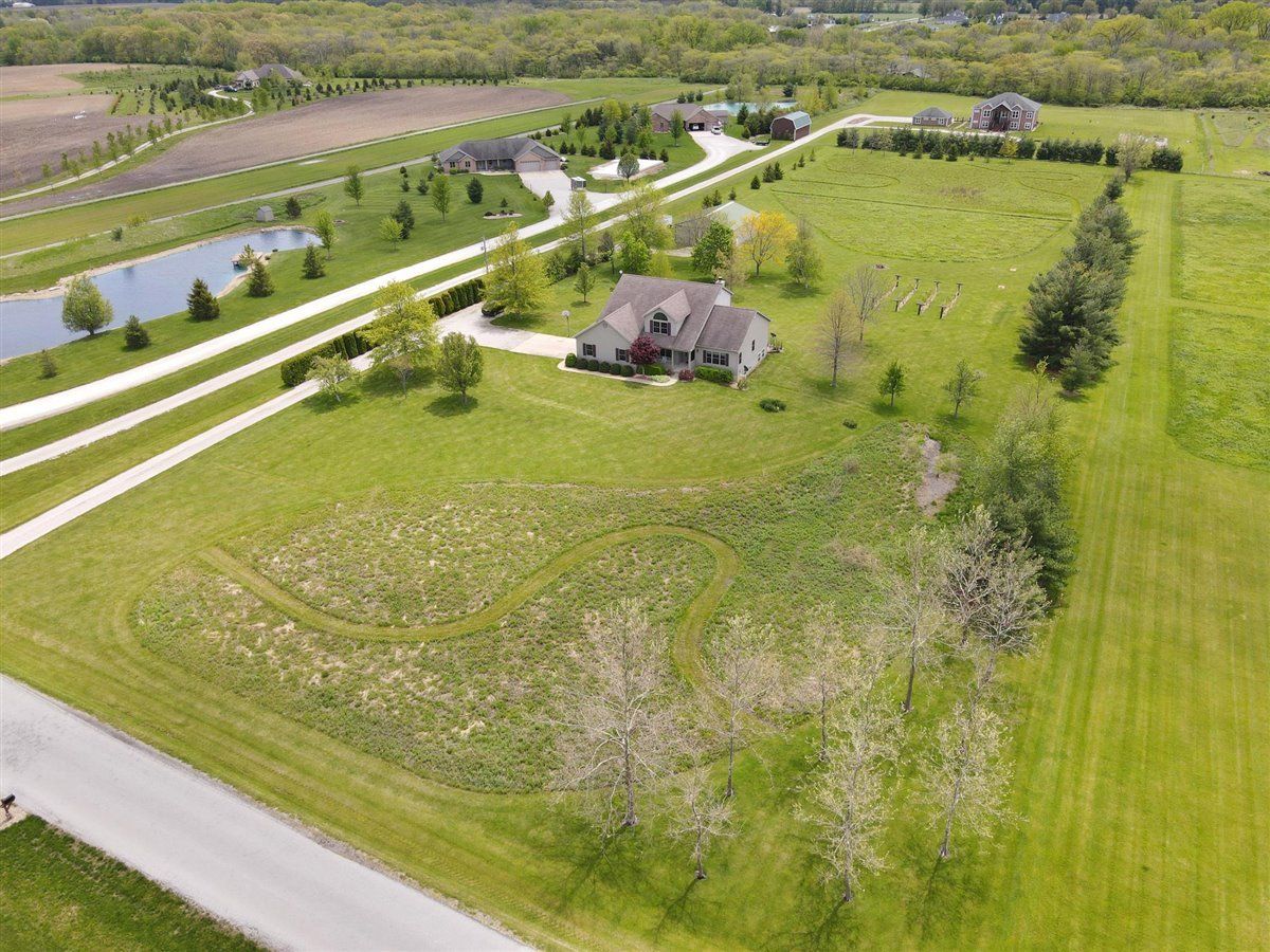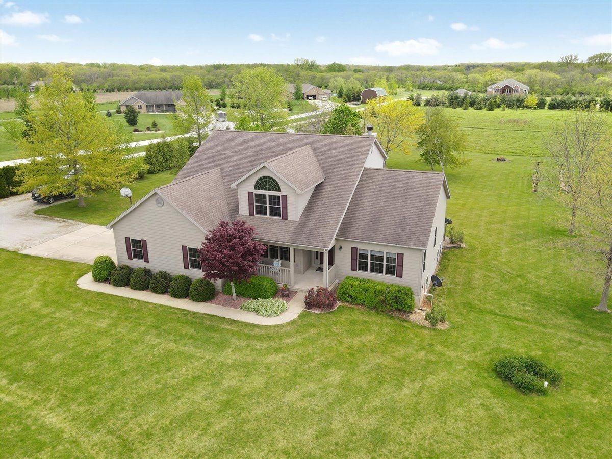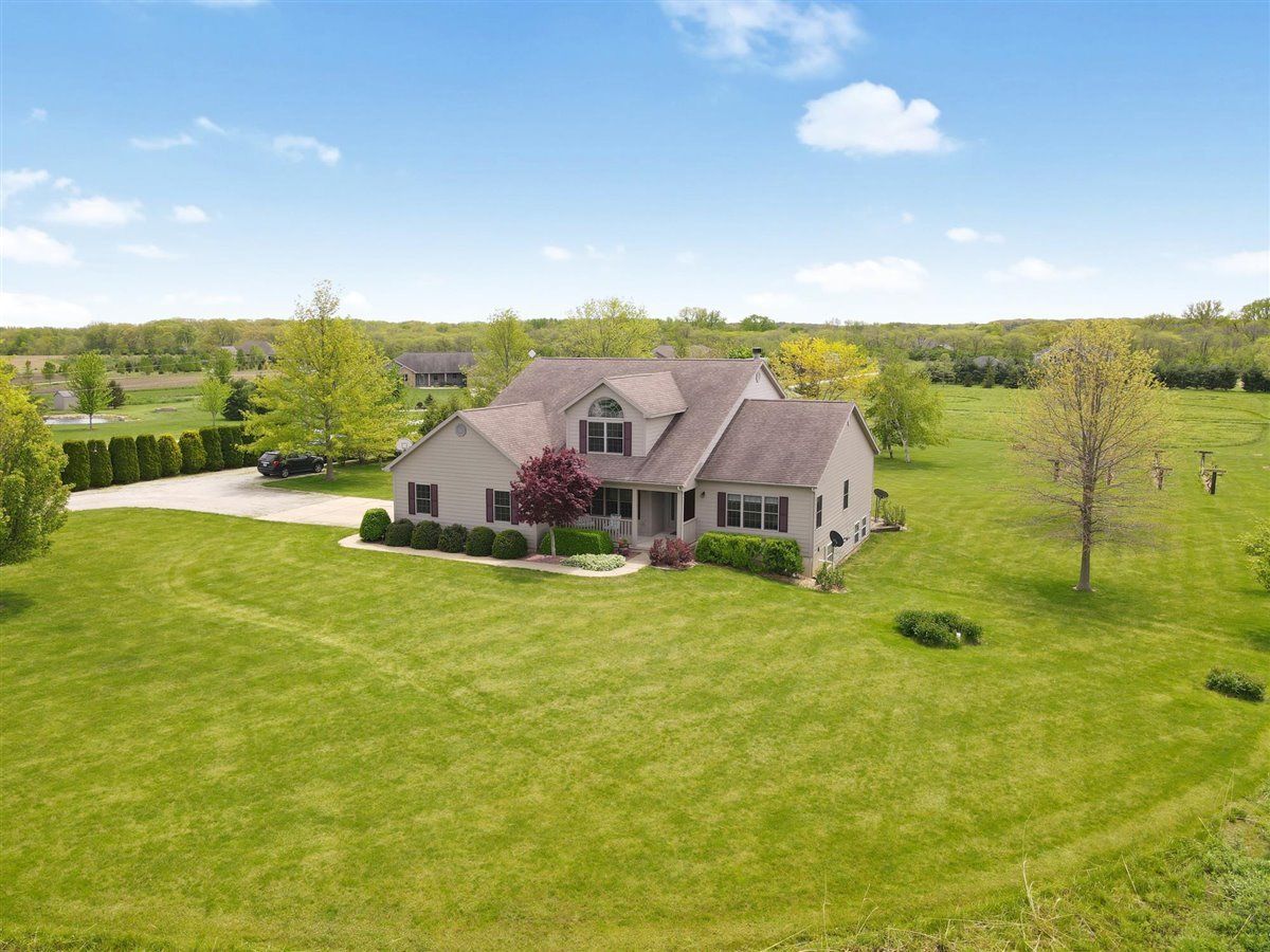 Welcome to your new home on 5 acres in the Mahomet countryside! This 5 bedroom 4.5 bath two story home on a partially finished basement has had one owner since it was built in 2001. It has Andersen windows throughout except for the basement, geothermal heating, and fiber cement siding. As you walk in and see the hardwood floors you will also see a two story tall living room with plenty of natural light and a gas fireplace. The kitchen has hickory cabinets, Samsung appliances, quartz countertops, and tile backsplash. The master bedroom is on the main level and the master bath has a whirlpool tub and separate shower. The second level has a hallway full bath and three bedrooms that all have walk-in closets. One is an in-law suite. The basement has an extra large rec/family room, a bedroom with an egress window, a flex room, full bath, and a wet bar. The house sits on a 5 acre lot that has a line of arborvitaes to the east, some fruit trees throughout, established wine grapes, and nearly 2 acres of restored native prairie with trails. There is also a large metal shed with power to store the riding mower and extra vehicles.