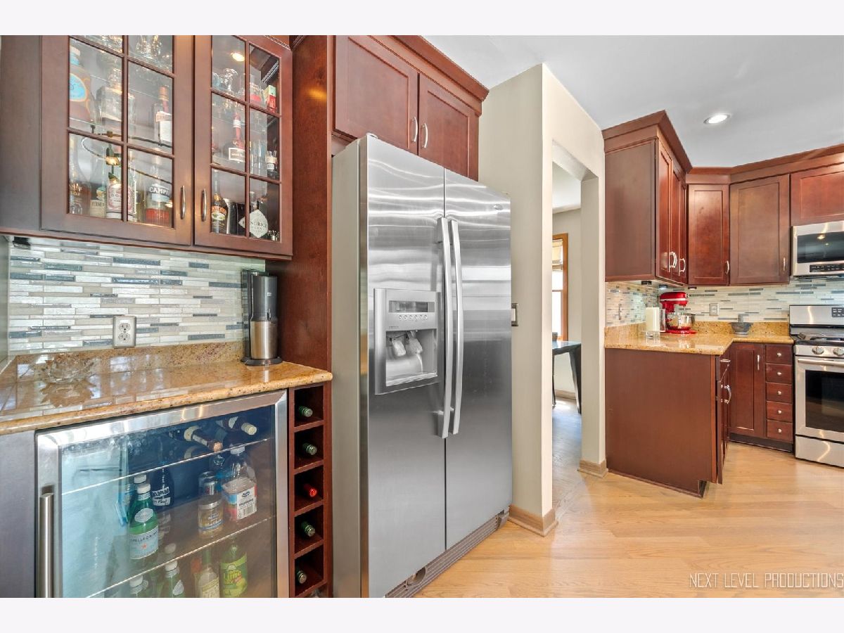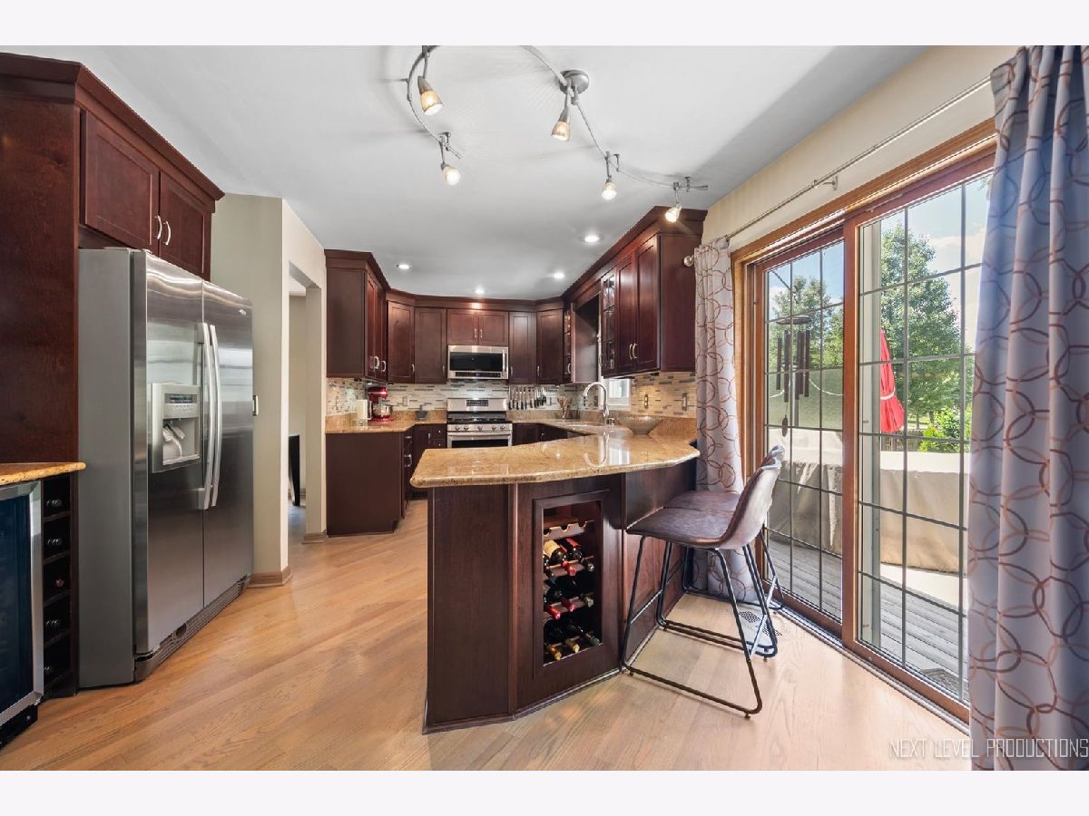 Sleek sophistication describes this totally updated home...and it is on an exceptionally beautiful, landscaped privacy fenced lot with expansive deck and brick paved patio!! An impressive stone walkway leads to the covered porch and triple glass pane front door! Light oak floors can be found throughout the main level. The L-shaped living/dining room can accommodate a large crowd for gatherings and holidays. The renovated granite kitchen is stunning and features 42" custom cabinets, glass tile backsplash, stainless steel appliances, expanded granite breakfast bar counter, wine refrigerator...and slider leading out to the gorgeous private yard!! The cozy family room has a fireplace with brick surround and a wood mantle. Primary bedroom suite with engineered hardwood floors, big wall closet and private bath with updated vanity and shower/tub. Bedroom two with overhead light fixture and bedroom three with built-in Murphy bed!! Full hall bath with updated vanity and shower/tub...bonus 2nd floor laundry room and 14x13 walk-in closet with built-ins!! Nicely finished basement with large rec room and lots of storage. Enjoy every season in your scenic private fenced yard with mature trees, deck, paver patio and awesome privacy screen. Two car garage with newer overhead door. This home is immaculate and is in true move-in condition!