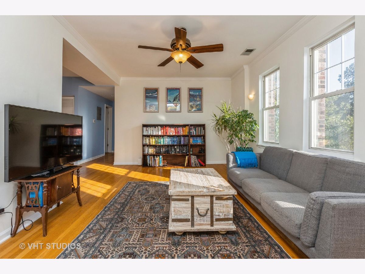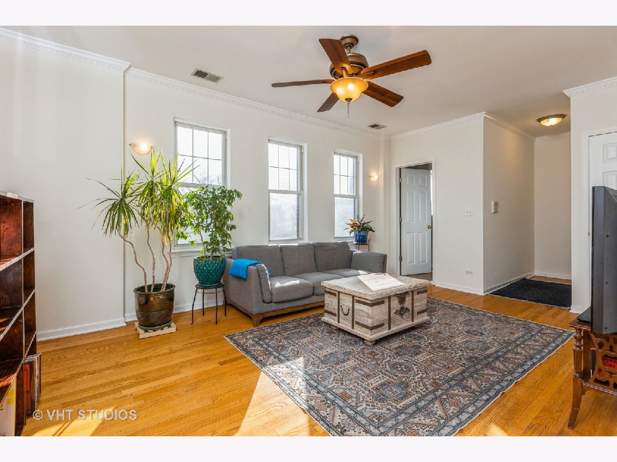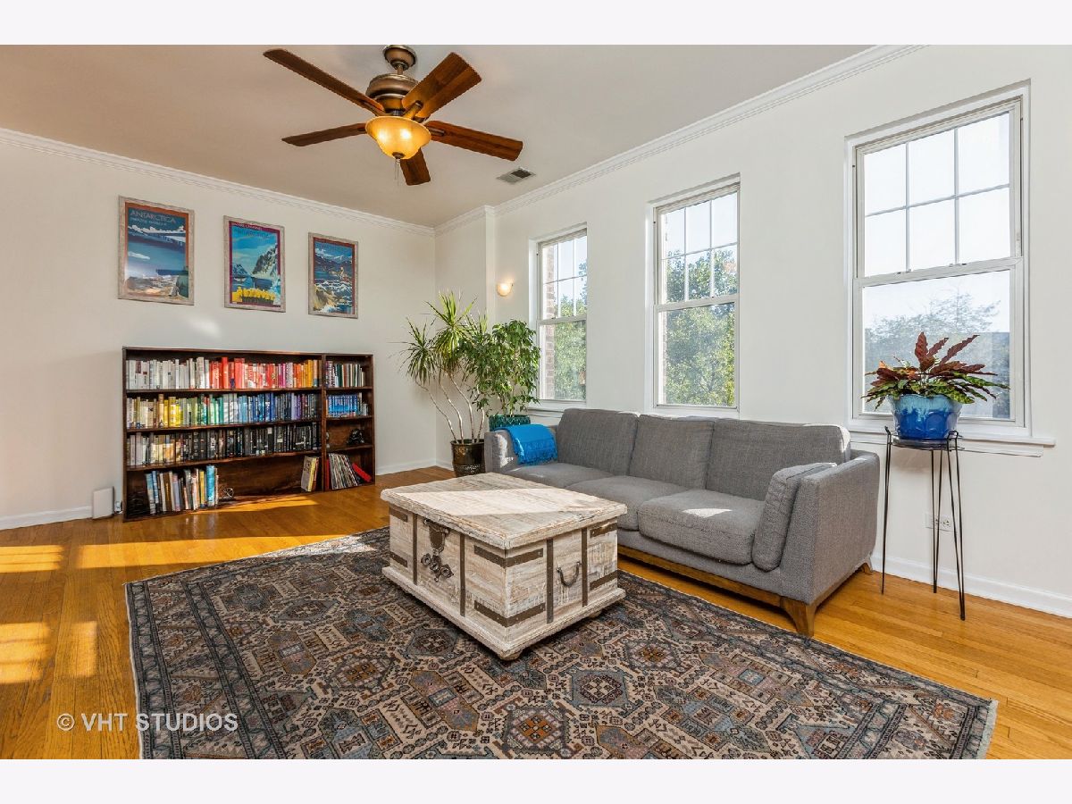 This sunny top-floor two bedroom, two full bathroom oasis is situated in lovely Lincoln Square neighborhood with tree top views. The open concept floor plan is quite special for entertaining with one bathroom nestled off the living space. The generous kitchen features ample counter space for cooking and baking, a proper pantry and breakfast bar with a workspace. The dining room offers space for a proper table! The unit boasts hardwood floors throughout, crown molding, in-unit laundry, central A/C and a newer roof. Located within walking distance of several beautiful parks and green spaces, Winnemac Park at River Park (pool, sports courts, and kayaking along the Chicago River). Enjoy Lincoln Square's amazing restaurants, charming bars,Welles Park, and the Old Town School of Folk Music. Easy access to public transportation, with Lincoln and Western bus routes just one block away, making commuting a breeze. Should you choose to drive, one exterior assigned parking space is included in the price.
