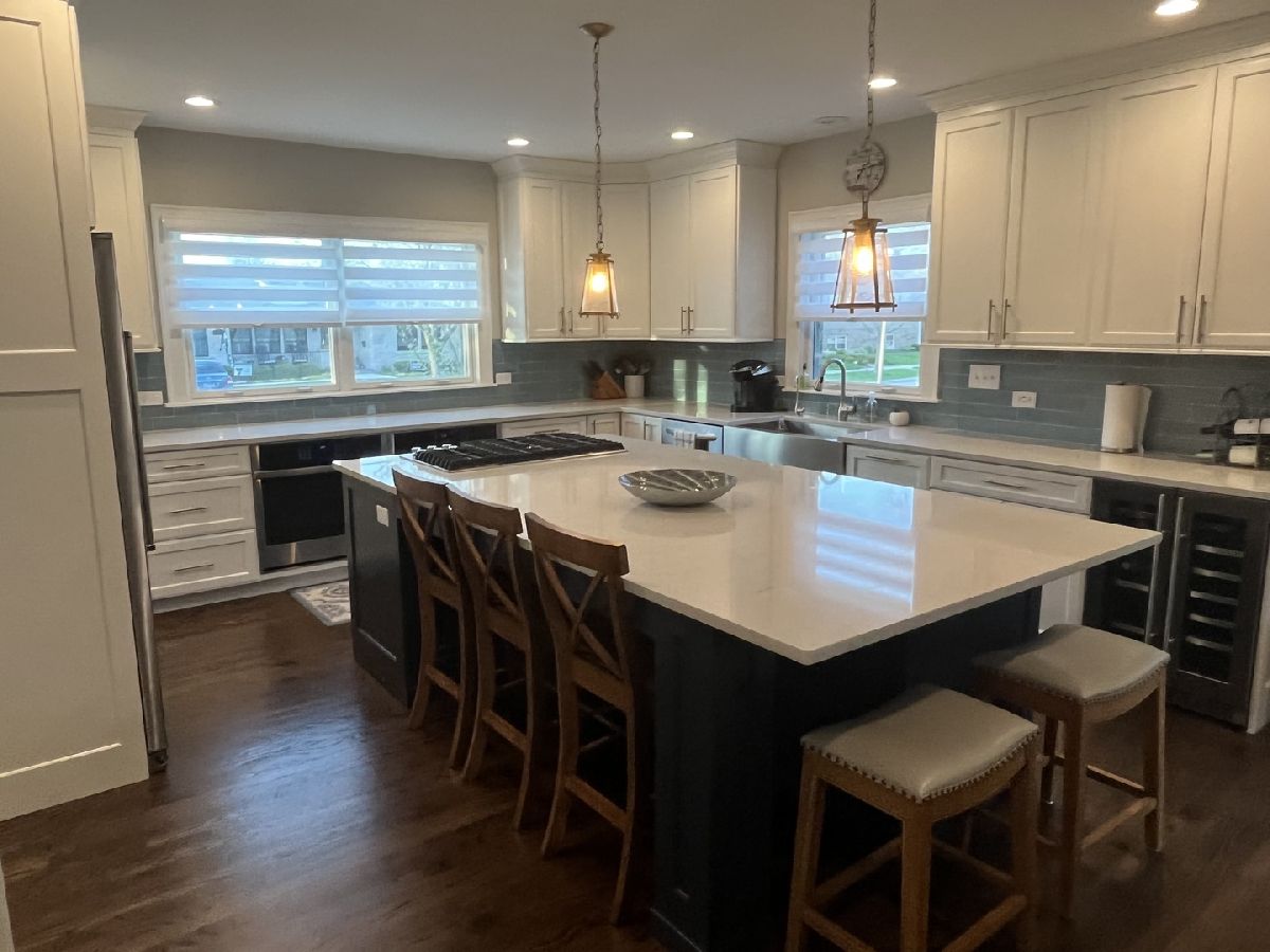 Updated family home 2 blocks from new Lincoln School. 4 bedrooms/3.1 baths with over 3,000 sf of living space. Brand new updated white kitchen with huge island with seating for 5, double oven, 5 burner stovetop, quartz counters, and tile backsplash. Kitchen opens to bright family room with fireplace. 1st floor office. Full bath & 4th bedroom on first floor. 4th bedroom can also be used as 2nd office. Large Dining Room and Sitting Room round out first floor with newly finished hardwood floors and paint. 2nd floor features huge primary bedroom with large walk in closet and deluxe bath with steam shower. 2 additional 2nd floor bedrooms with full bath. Convenient 2nd floor laundry. Finished walkout basement contains wet bar and beverage fridge. Large storage/workout room in basement. Fully fenced yard steps to Spring Rd bars/restaurants and prairie path. Upgrades include: HVAC for first floor, hot water heater, kitchen, 1st floor full bath, refinished hardwood and paint (walls, trim, doors), hardwood extended to stairs leading to 2nd floor and upstairs hallway, light fixtures on first floor, canned lighting, window coverings, closet organizers in front hall and primary suite, built-in's, sump and battery backup, 6 ft fence, landscaping.