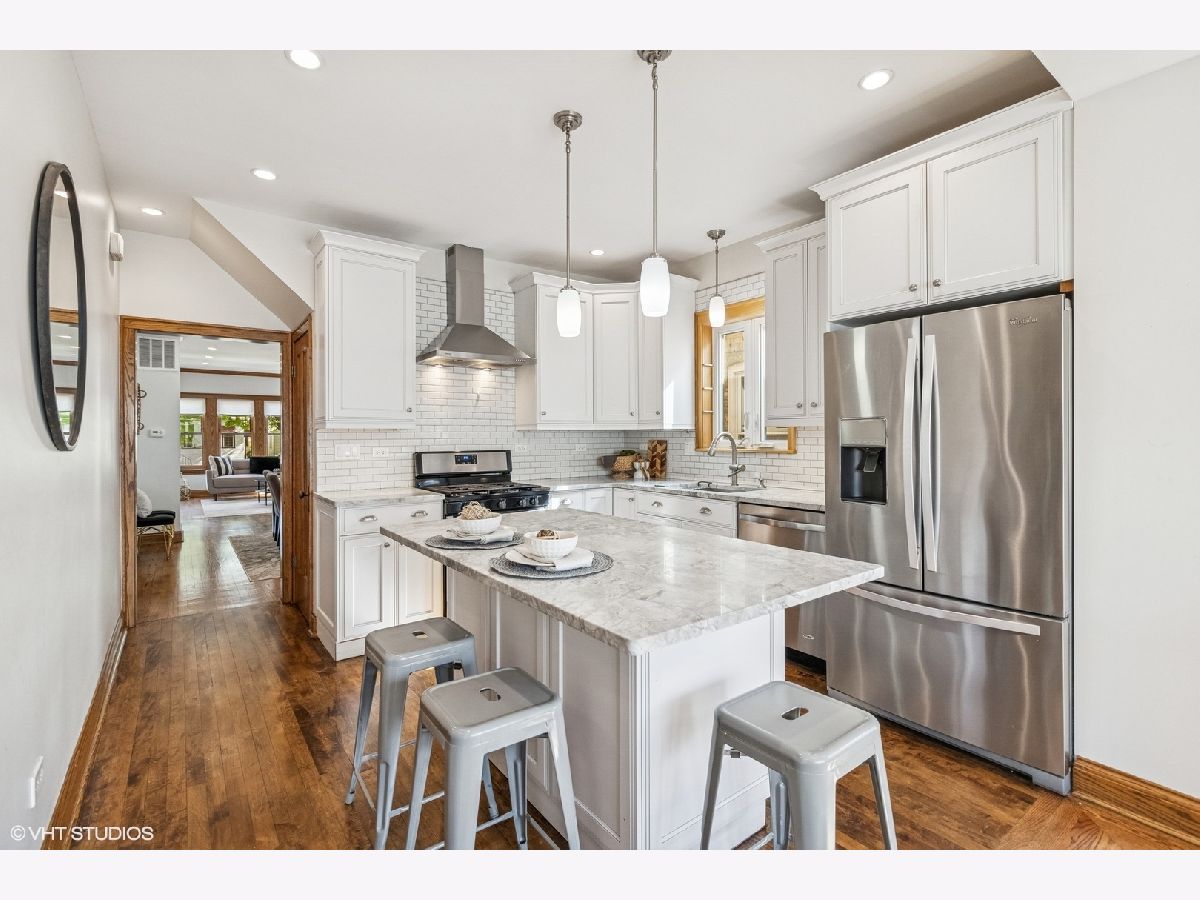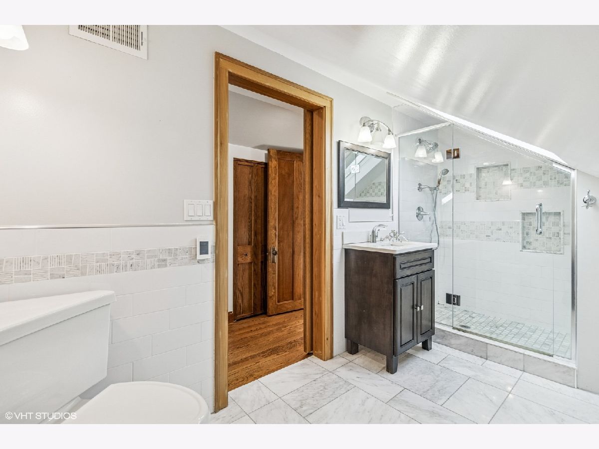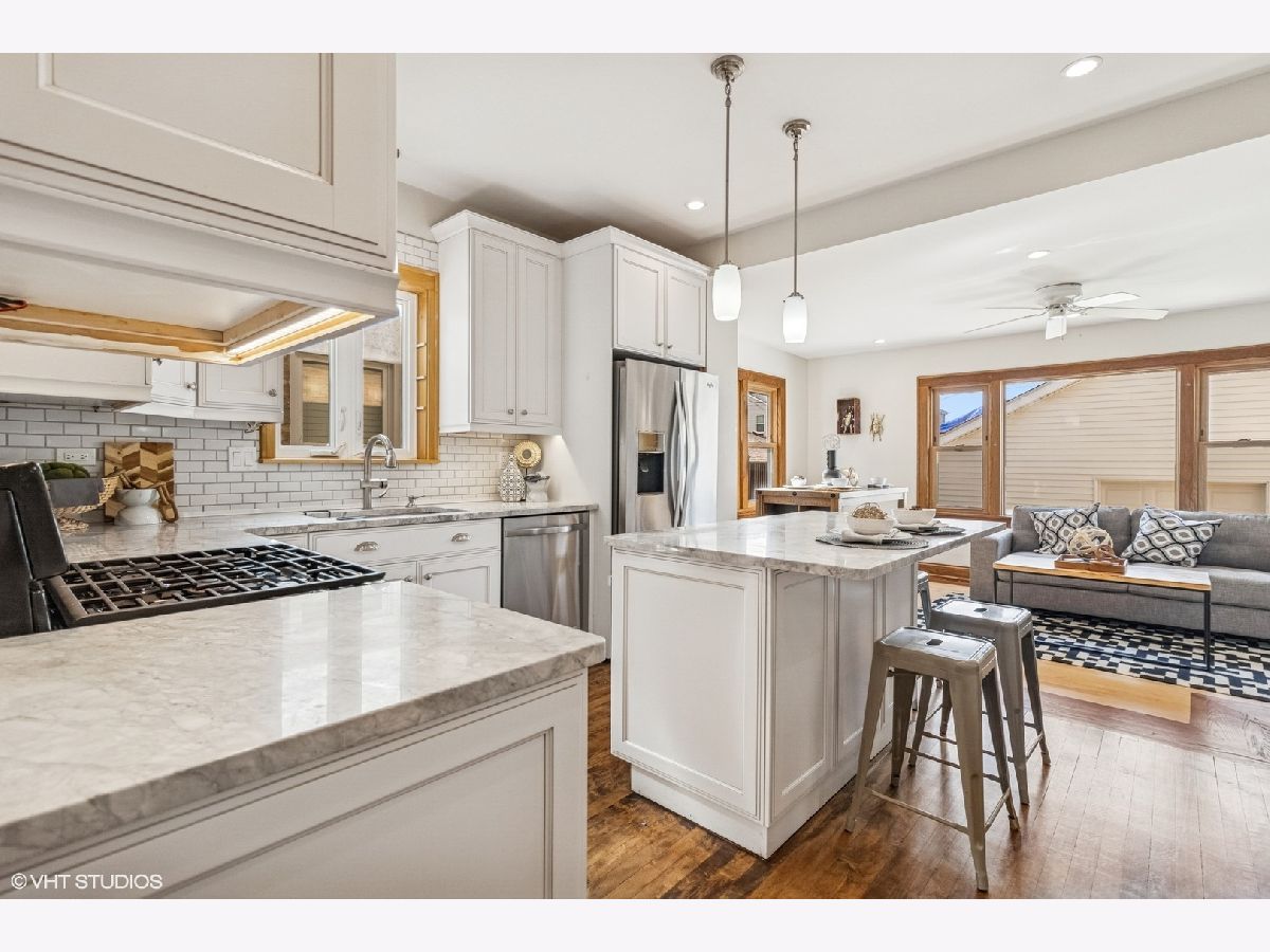 Bright and spacious bungalow in the heart of Portage Park. Just a few blocks to the park, this move-in ready, freshly painted 5-bedroom, 3-bathroom home showcases the timeless craftsmanship characteristic of classic Chicago bungalows while offering modern updates throughout. | Step inside to discover an open concept living and dining room flowing seamlessly together. The first floor features two bedrooms and a remodeled bathroom with marble tile and heated floors. The updated kitchen boasts white cabinetry, marble countertops, stainless steel appliances, and a rare walk-in pantry. An enclosed porch off the kitchen serves as a family room. | Upstairs, find an elegant ensuite bedroom with marble tiled bath and heated floors, an additional bedroom and separate reading nook round out the second floor. All closets are customized with the Elfa storage system, maximizing your storage space. | The fully finished basement houses a complete one-bedroom apartment with separate entrance-perfect as an in-law suite. A large laundry room and office area complete the lower level. Walk out to the inviting back yard, complemented by a newer garage, built in 2019, featuring a convenient party door. | Other key features include meticulously hand-stained oak woodwork throughout, elegant wood inlay flooring in the family room, and convenient dual-zone air conditioning system for customizable comfort. | This home represents the perfect blend of historic Chicago craftsmanship with thoughtfully executed modern conveniences, creating a space that's both character-rich and completely move-in ready. Portage Park offers a welcoming community atmosphere with tree-lined streets and easy access to restaurants, shops, and the expansive park itself. Listing Agent related to Seller.