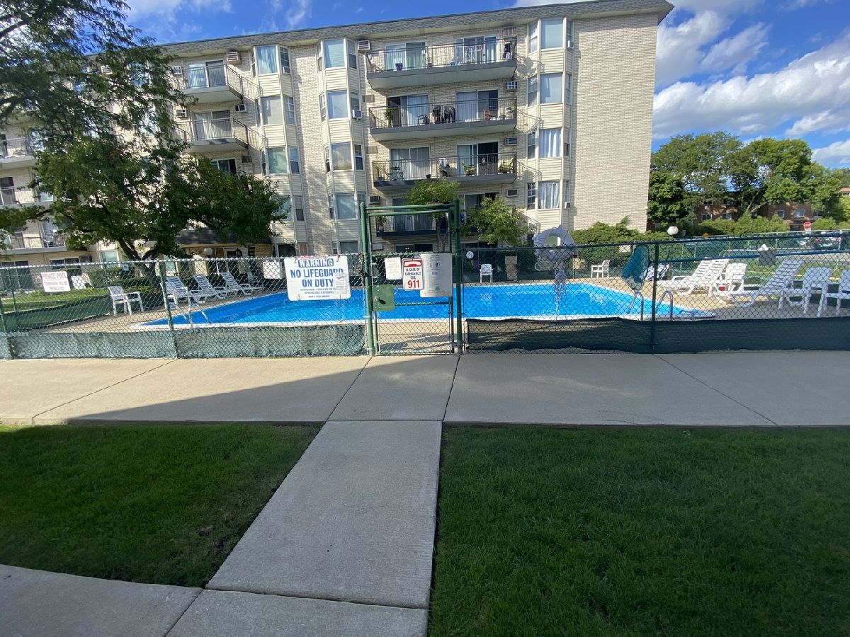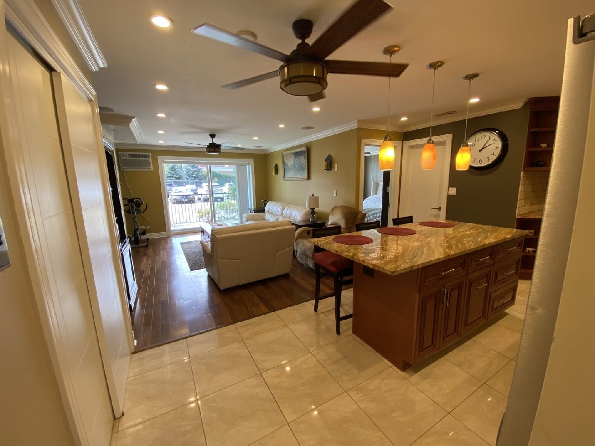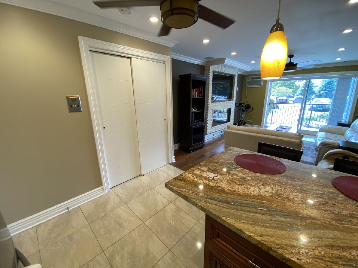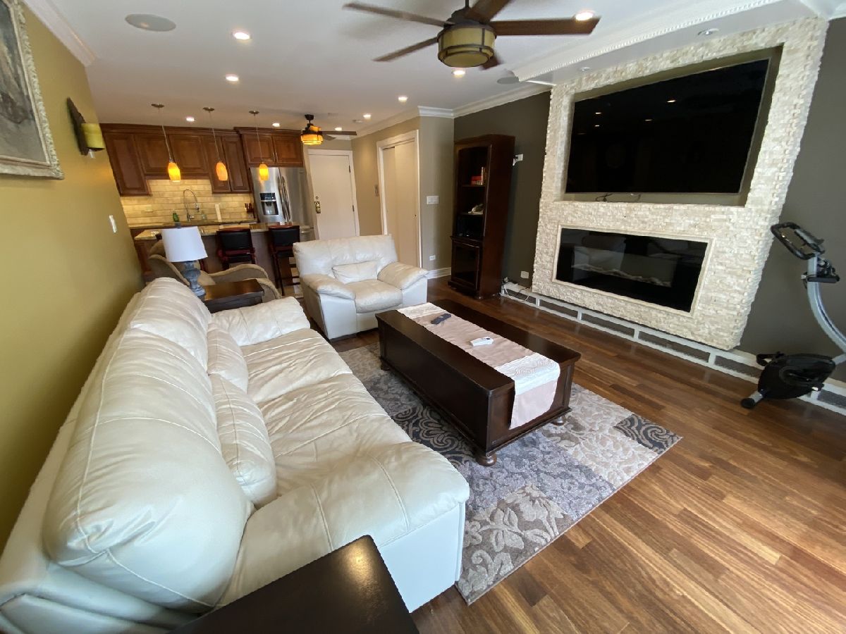 This is a beautifully updated large 1 Bedroom 1 Bath condo with a spacious walkout patio. Open floor plan with large Living Room with Hardwood Floors, a floor to ceiling stone fireplace with space for a 65" diagonal flat screen TV above the fireplace. Ceiling speakers. Can lighting throughout. Combo Kitchen / Dining room has large Granite Island (79" x 37.5") that doubles as Dining Area with 12" deep Counter seating, extra cabinet storage and convenient power outlet for portable appliances. Beautiful tall 2-tone wood cabinets, with matching molding crown to ceiling that has a nice rope detail. Stainless Steel appliances, Granite countertops, and unique beveled stone backsplash. Updated European Bathroom with Kohler professional shower system, glass door, and tile finishes. Spacious Master Bedroom with Bay Window and closet shelving. Large Pantry. Coin Operated Laundry Room with Seating Area steps down the hall. Extra Storage Cage around the corner. Deeded Indoor Heated Garage Parking Space accessible by Elevator to Basement. Assessments include Heat, Cable, Intercom, and Outdoor Pool. Located close to shopping, parks, restaurants, and highway.
