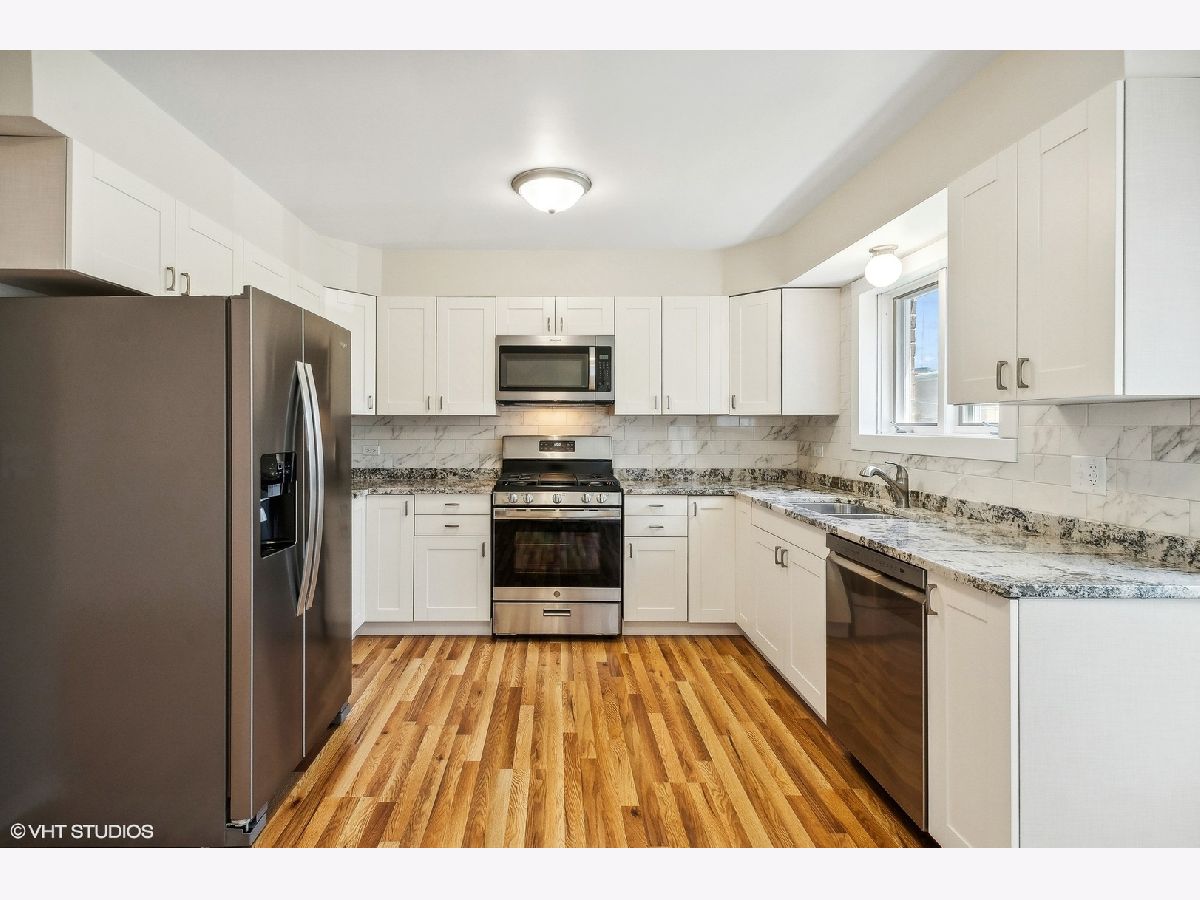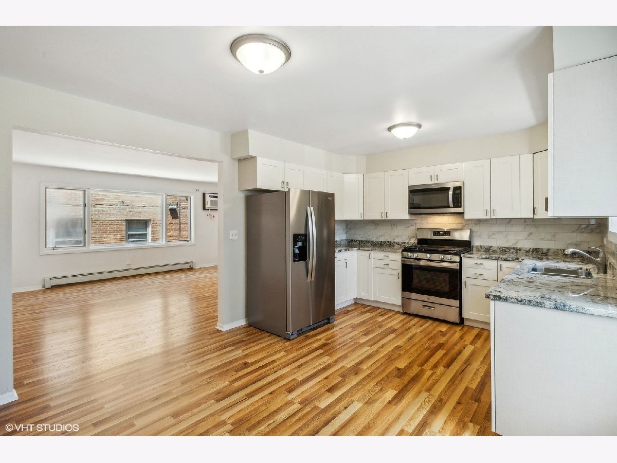 Recently renovated, beautiful 2nd floor 2-bedroom, 1-bathroom condo in Jefferson Park featuring a brand new white kitchen with brand new: cabinets, granite countertops, backsplash, stainless steel appliances and sink. Generous room size with space for a dining table or island and stools. Large open living room with brand new flooring throughout. Brand new wall AC in living room, new neutral paint, recently updated bathroom. Generous closet space in the unit and spacious storage locker. Unit includes 1 assigned parking space. Onsite laundry room for building. Association fees cover heating, water, gas, parking, insurance, landscaping, trash/recycling collection, and snow removal. Conveniently located near transportation, Blue Line and Metra, parks, restaurants, shops, and highways. Sold As-Is - Multiple offers received - Highest and Best by June 16th at noon