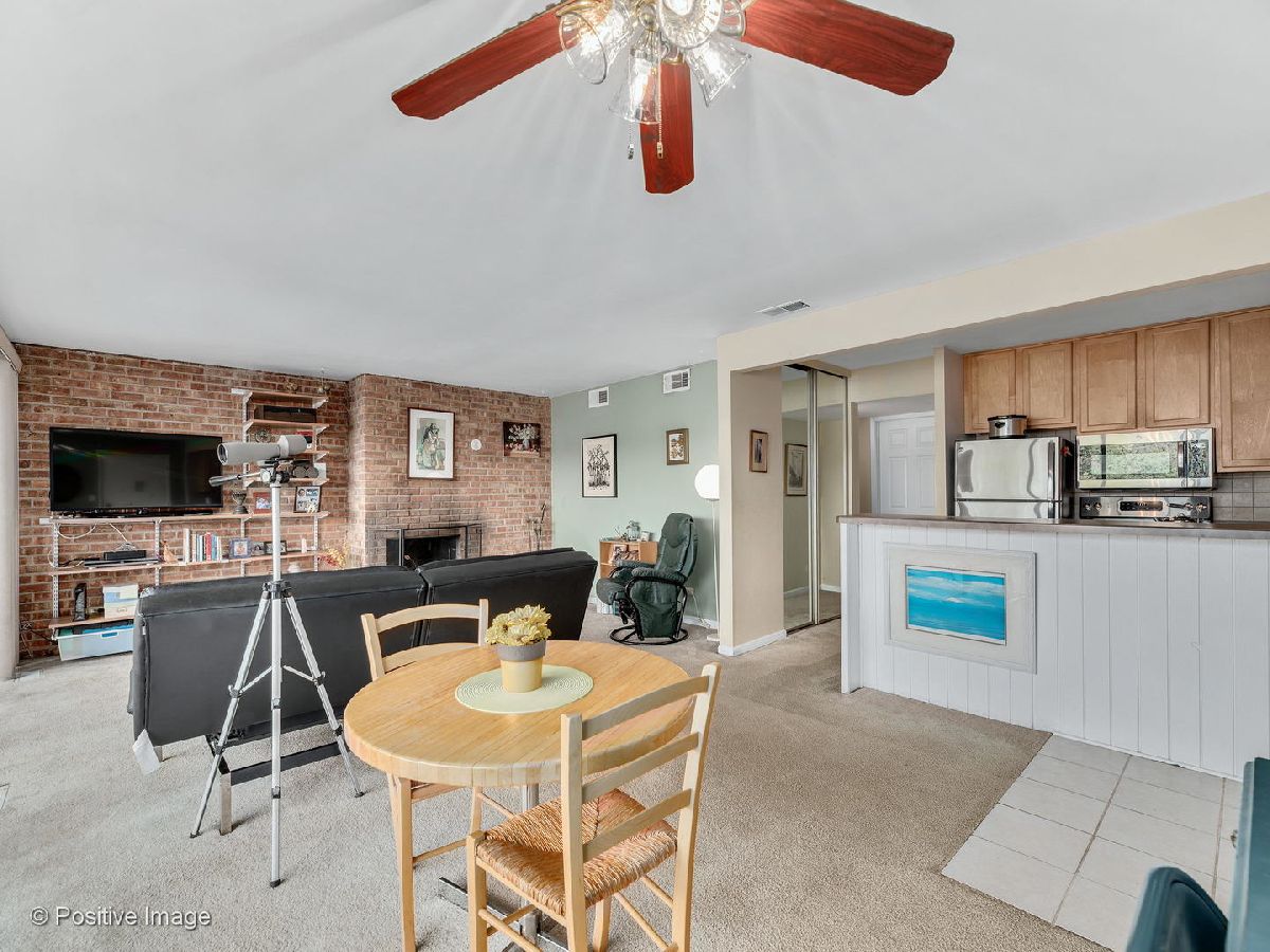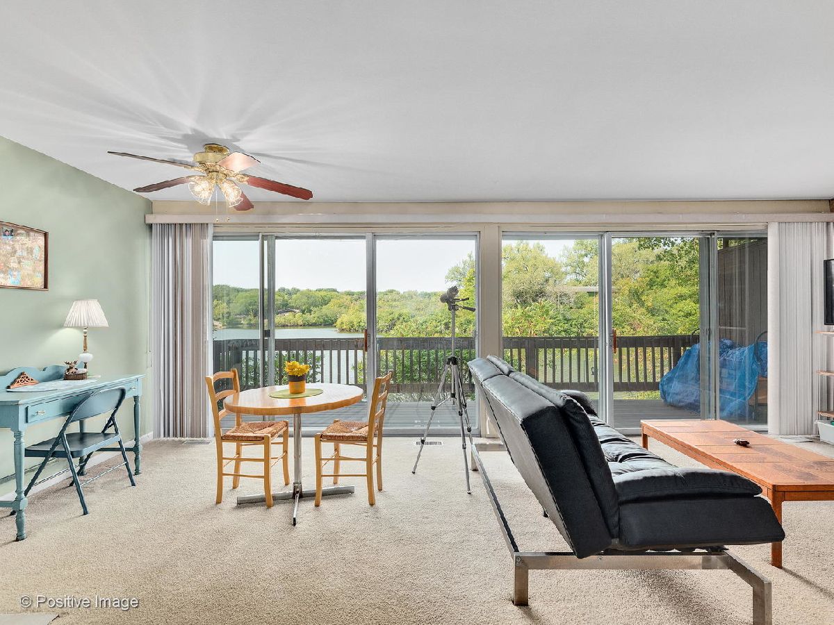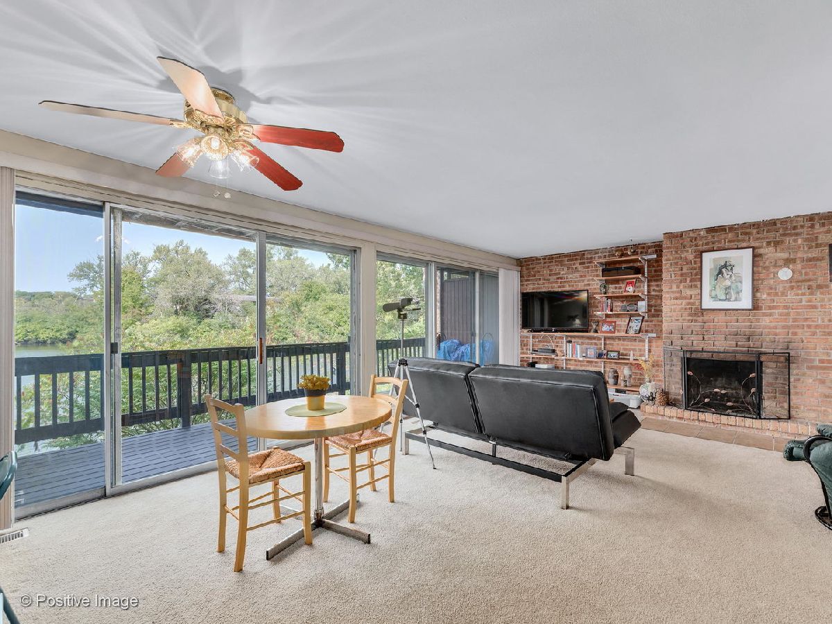 Lovely first floor unit with private entry will welcome you in with the amazing immediate views of the glorious greenery and lake as you look out your full wall of windows/doors in the living room where the showcase fireplace and brick wall will compete for attention. Stainless appliances in the kitchen with decorator lighting and plenty of cabinets and counters overlooking the dining area. Good size bedrooms and closets with washer/dryer in unit make this home the one. Parking spot 80-5 right in front.Fish from your deck or enjoy the Four Lakes lifestyle with four pools, workout facilities, volleyball courts, tennis courts, boat rentals, walking paths, skiing/snowboarding, restaurant & bar, and convenience store and Easy access to I355 and I88. Impress yourself with this great find! This unit would also work well for those with limited mobility.