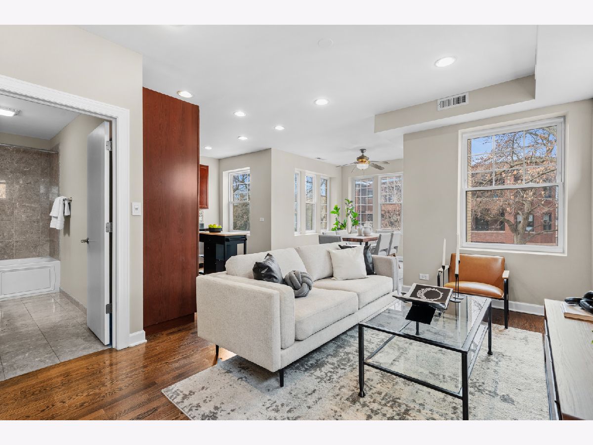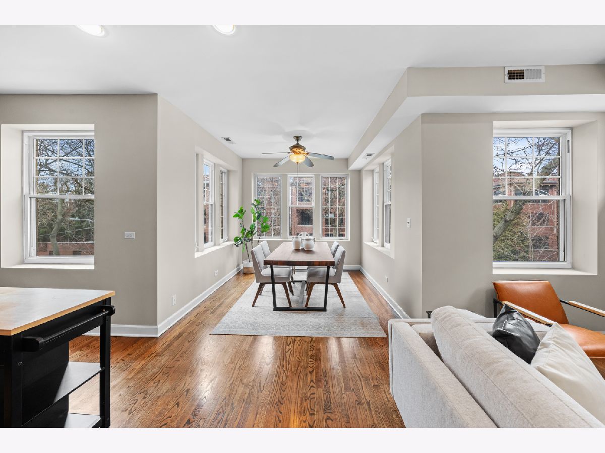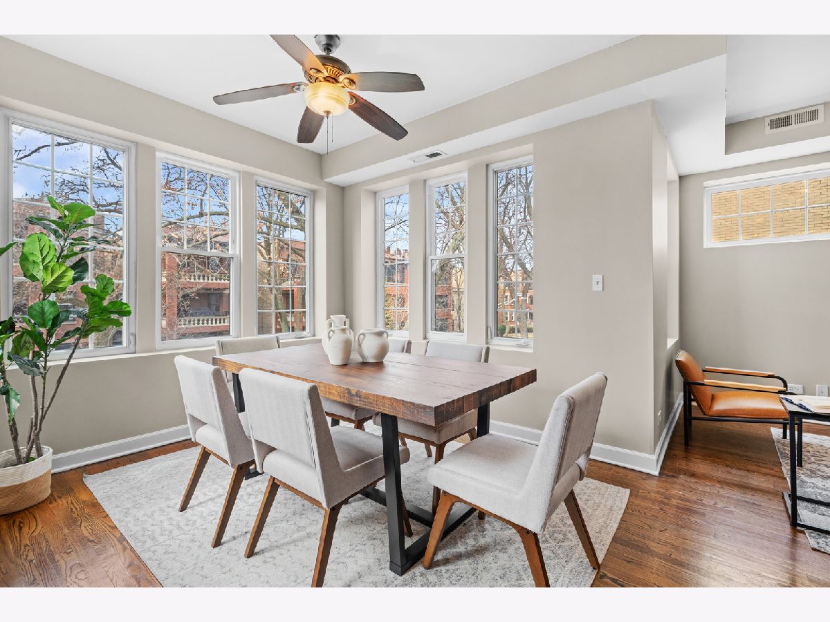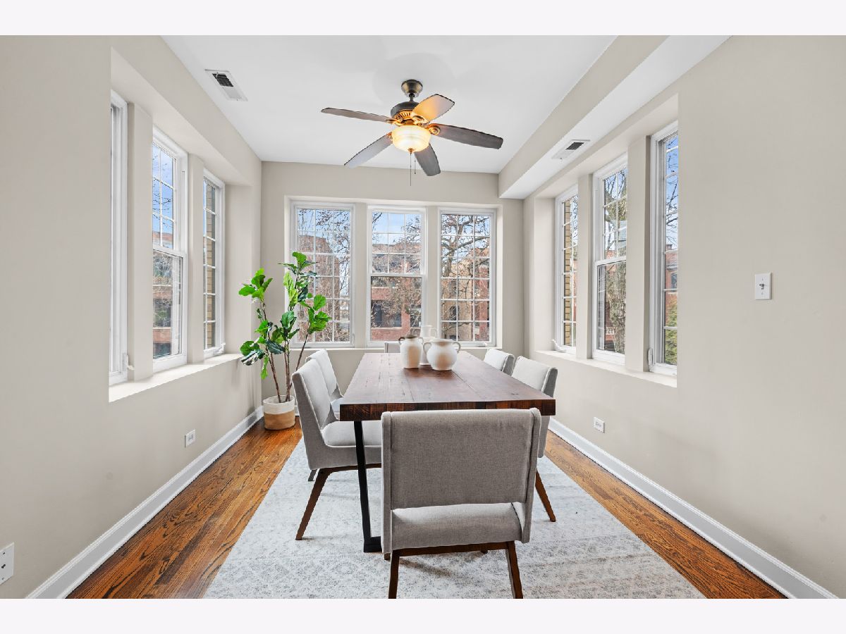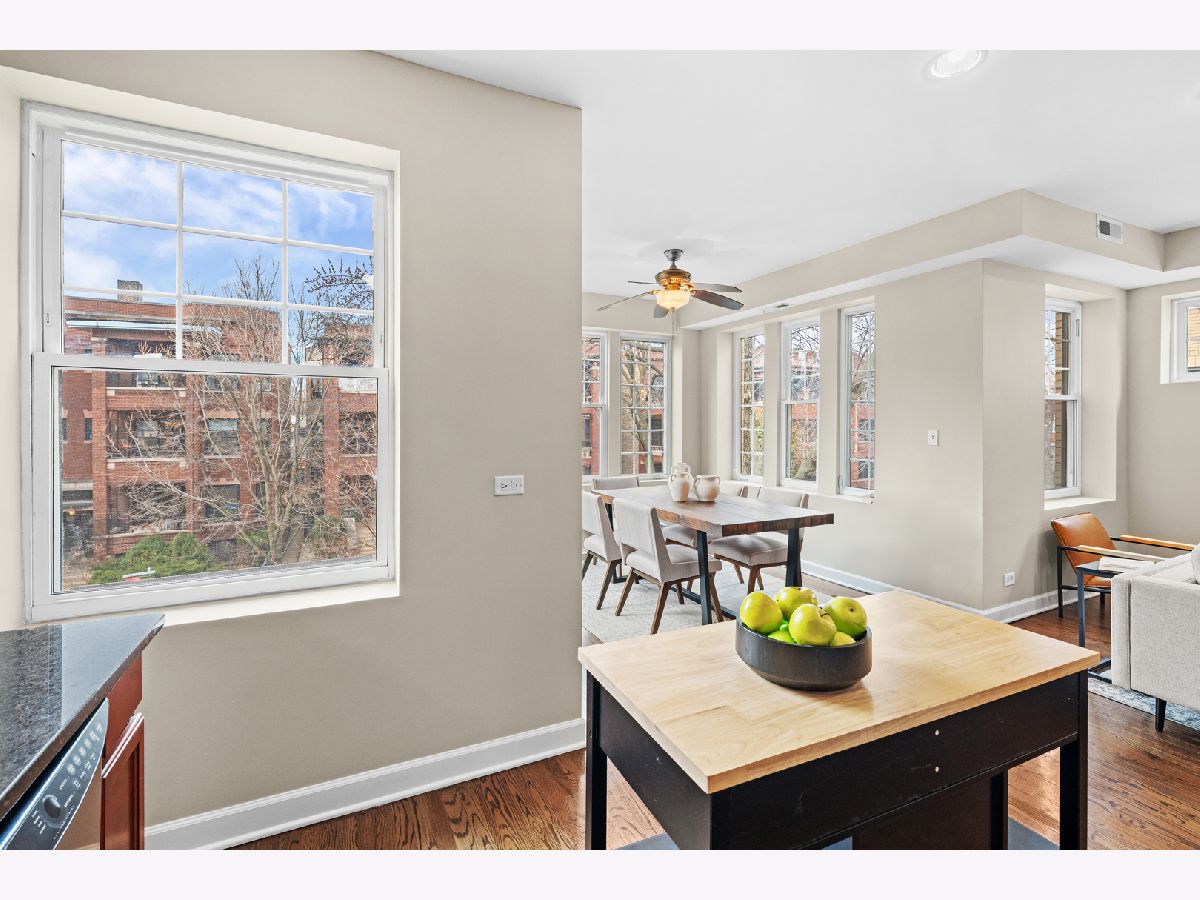 Filled with light and move-in ready, this high 2nd floor Andersonville 2 bedroom 2 bath is located on a quiet, one-way, tree-lined street - a short walk to the Bryn Mawr train or hot spots on Clark Street. Wrap around windows face the summer/fall lush green treetops in this front end-unit position in the beautiful vintage courtyard building. The spacious sunroom with windows on 3 sides is perfect as dining room or large home office and is open to the living room and kitchen. Stainless steel appliances, granite counters, shaker cabinets including a floor-to-ceiling pantry cabinet complete the chef's kitchen. The primary bedroom has two organized closets, hardwood floors, and attached marble bathroom with glass shower. The second bedroom also fits a full bed with space for desk to work from home. Outdoor space for a grill and bistro table & chairs. Walnut stained hardwood floors & brand new paint throughout (2026). Brand new furnace (2026), microwave (2024), central air (2012), in-unit W/D, extra storage and bike room in basement, common hot water heater (new 2024) and professionally managed. Desirable prime Andersonville location near many Clark Street charming local shops and restaurants, train and bus transit, the lakefront, Hollywood Beach, parks, Gethsemane, Andersonville Farmer's Market & street festivals, and historic Lakewood-Balmoral & Bryn Mawr Districts. Strong reserves, investor/renter friendly, and pet friendly.