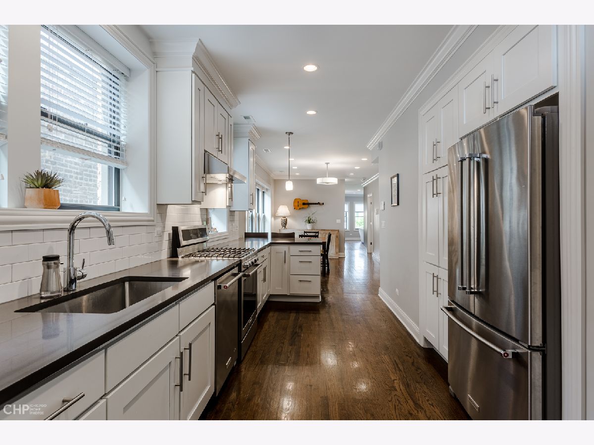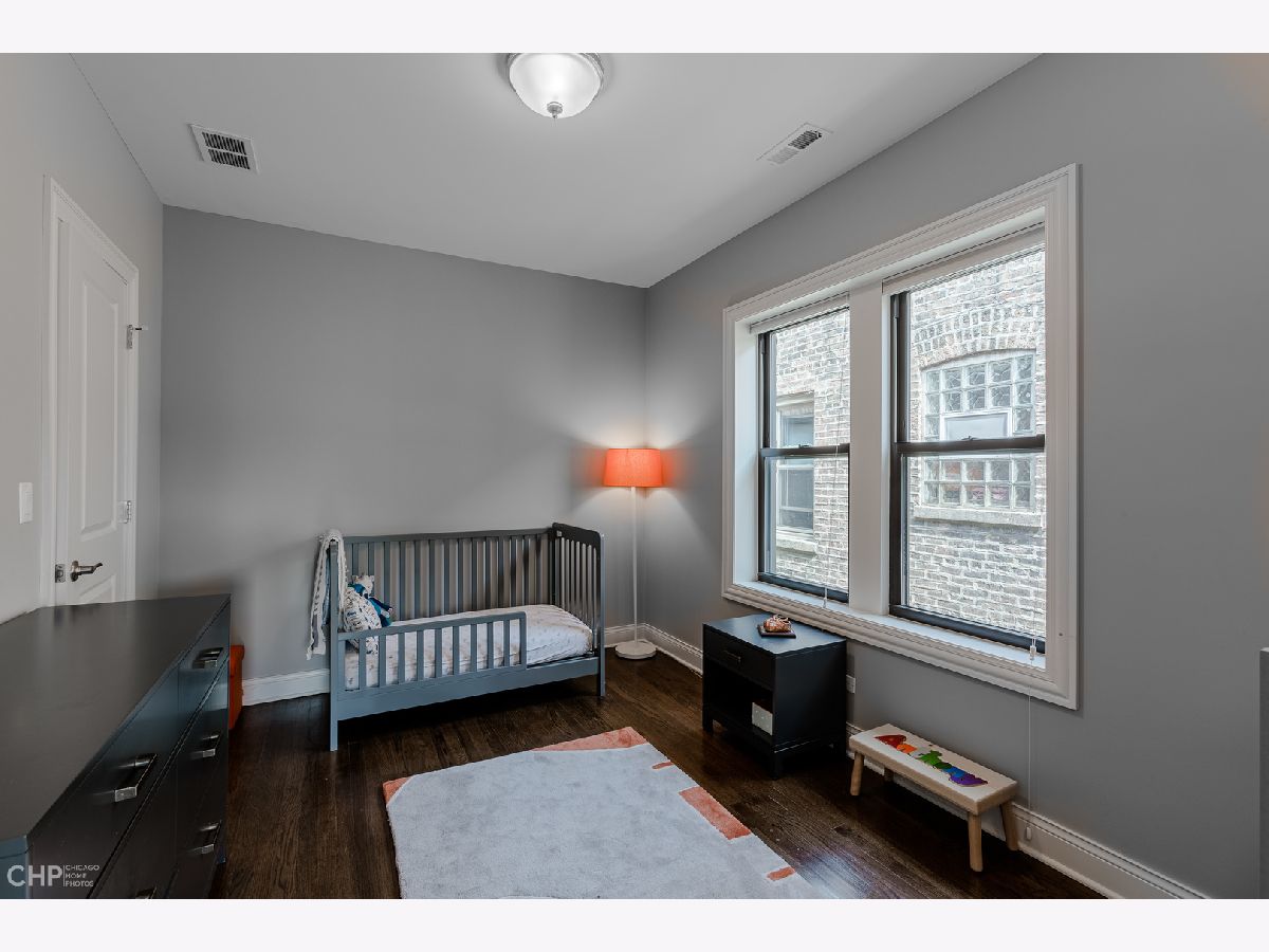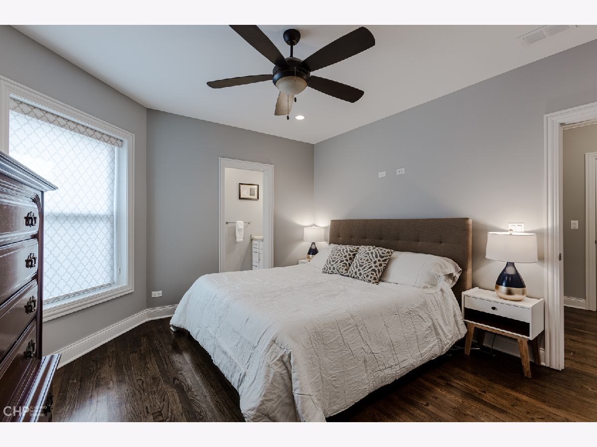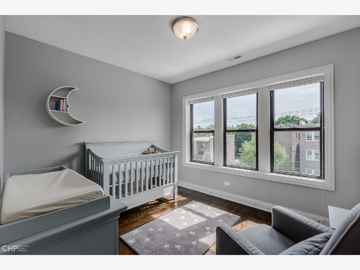 Top-Floor model-quality full modern rehab of a beautiful pre-war building in the heart of North Park! New plumbing, water service, electric, central heat/air, in-unit laundry, sound insulation between units, commercial-grade windows. .. everything! Spacious living room, bathed in light from dramatic west-facing bay windows. Expansive modern kitchen w/ an abundance of custom cabinetry, stylish quartz counters w/ breakfast bar + luxury stainless steel appliances. Huge separate dining room, open to the kitchen for entertaining. Rich hardwood flooring throughout every room (no carpet)! Large master suite and two more nice-sized bedrooms w/ excellent closet space. Plenty of room for a home office. Two full designer bathrooms w/ custom tile. Massive additional private storage room and a full, clean unfinished basement for more common storage. Garage parking spot included in the price! Healthy, well-maintained building w/ solid reserves in great location: quiet one-way street in North Park, close to North Park University, NEIU, Northside College Prep, Hollywood Park, Legion Park and the Nature Center + many restaurants + bars along Bryn Mawr and Foster.