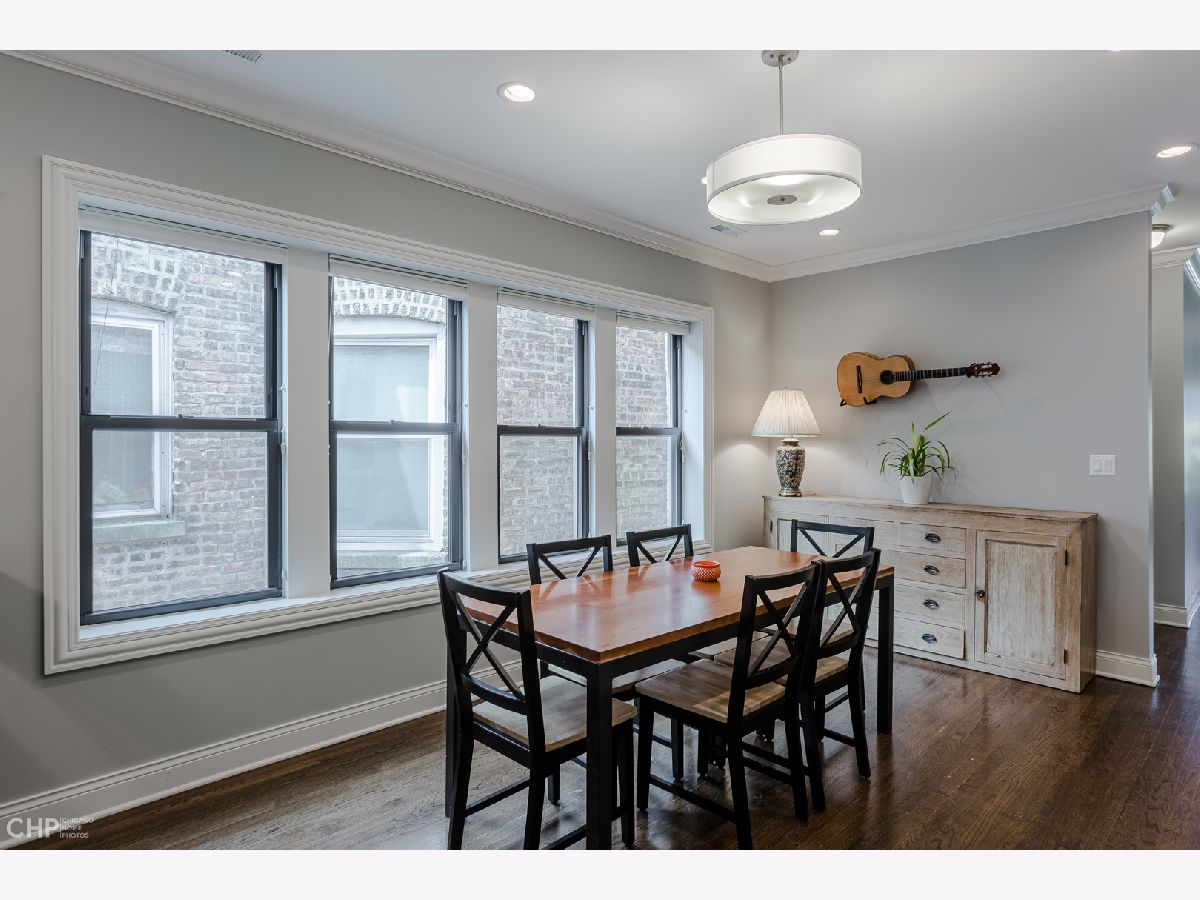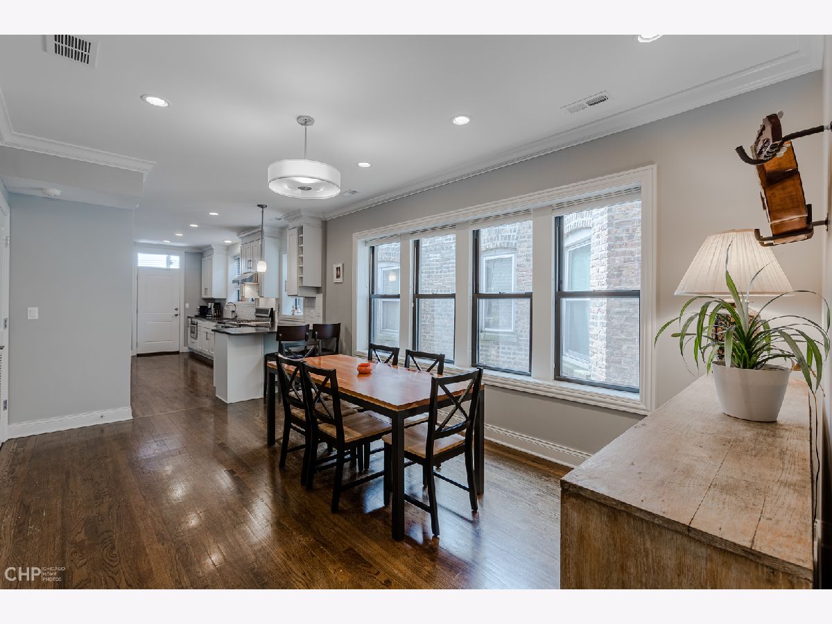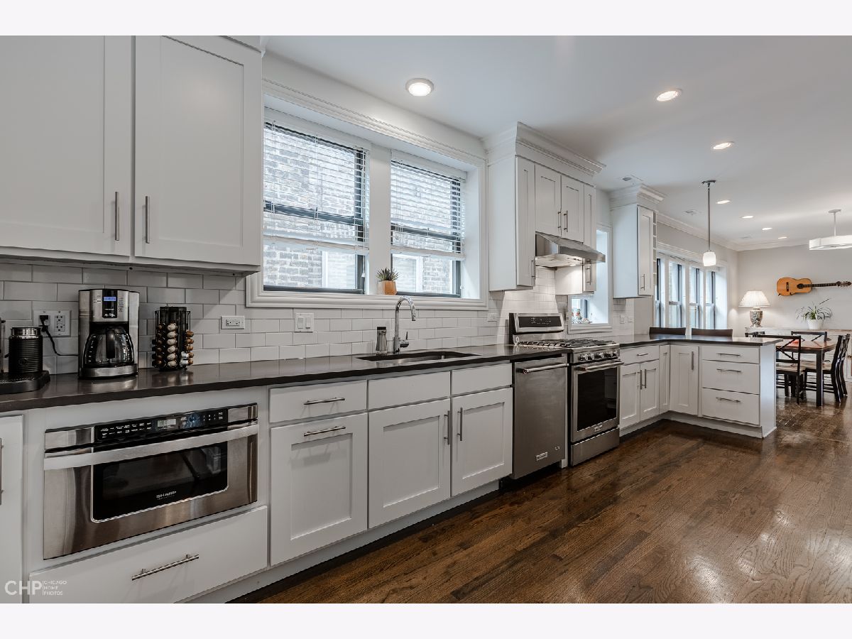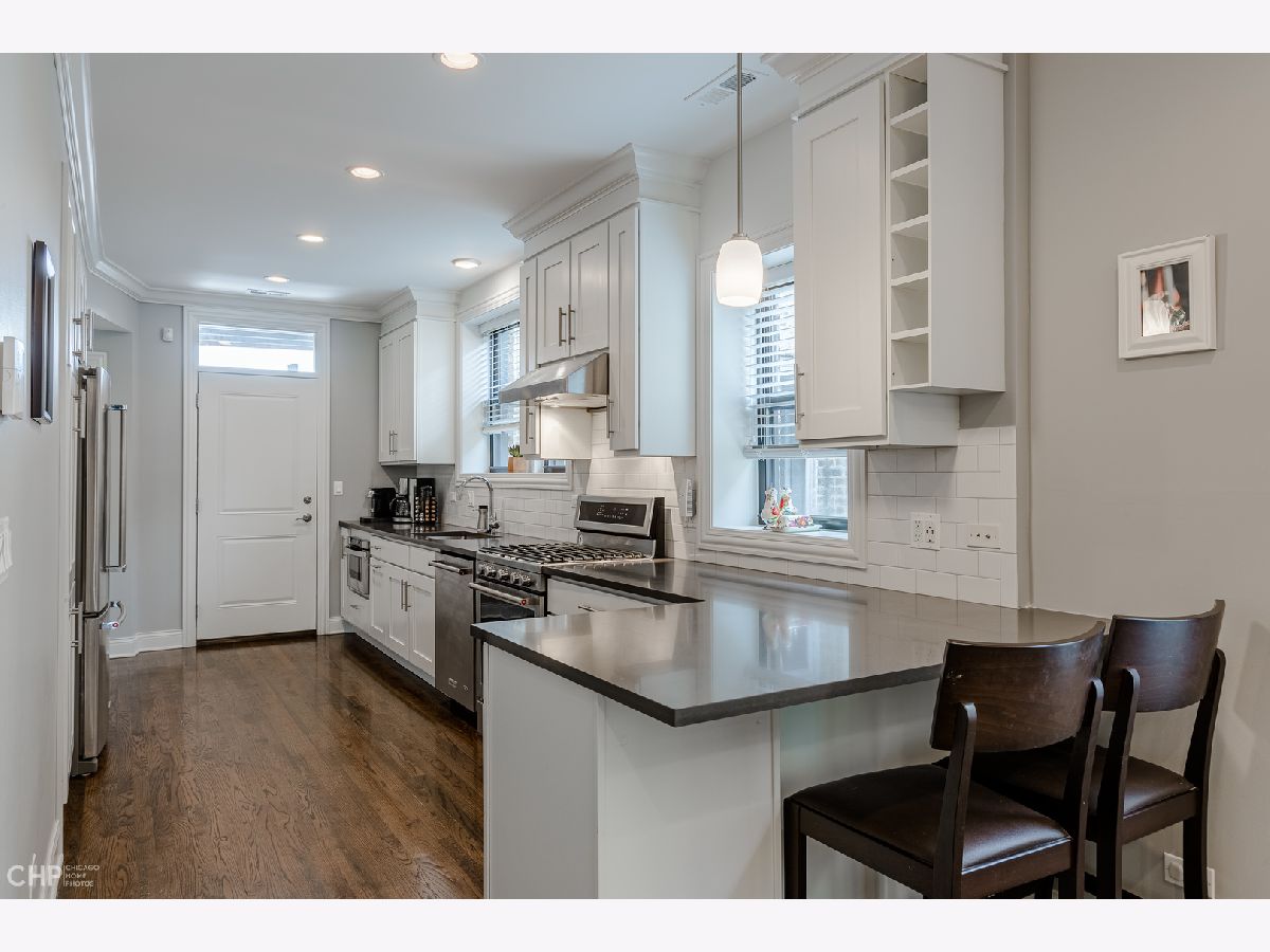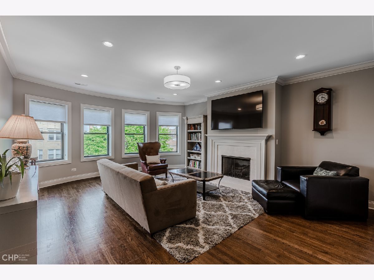 Top-Floor model-quality full modern rehab of a beautiful pre-war building in the heart of North Park! New plumbing, water service, electric, central heat/air, in-unit laundry, sound insulation between units, commercial-grade windows. .. everything! Spacious living room, bathed in light from dramatic west-facing bay windows. Expansive modern kitchen w/ an abundance of custom cabinetry, stylish quartz counters w/ breakfast bar + luxury stainless steel appliances. Huge separate dining room, open to the kitchen for entertaining. Rich hardwood flooring throughout every room (no carpet)! Large master suite and two more nice-sized bedrooms w/ excellent closet space. Plenty of room for a home office. Two full designer bathrooms w/ custom tile. Massive additional private storage room and a full, clean unfinished basement for more common storage. Garage parking spot included in the price! Healthy, well-maintained building w/ solid reserves in great location: quiet one-way street in North Park, close to North Park University, NEIU, Northside College Prep, Hollywood Park, Legion Park and the Nature Center + many restaurants + bars along Bryn Mawr and Foster.