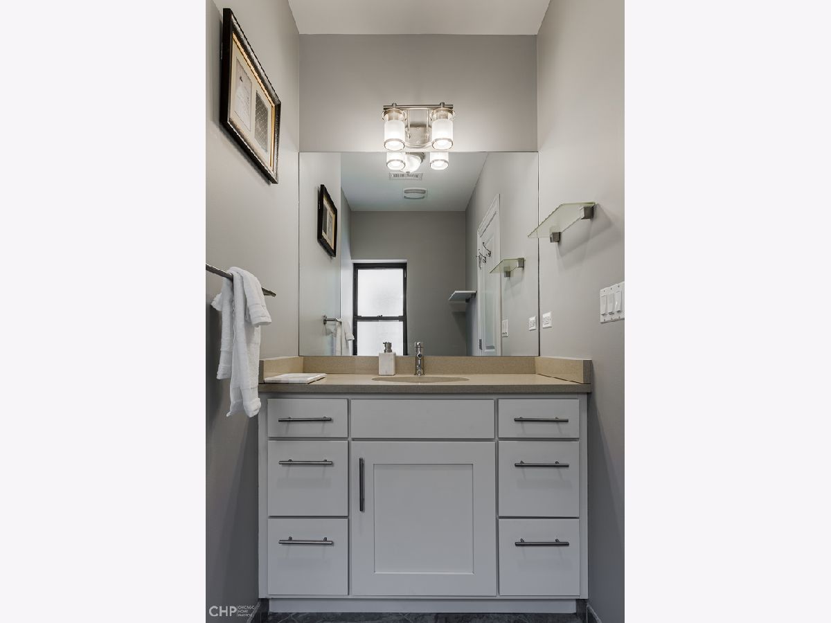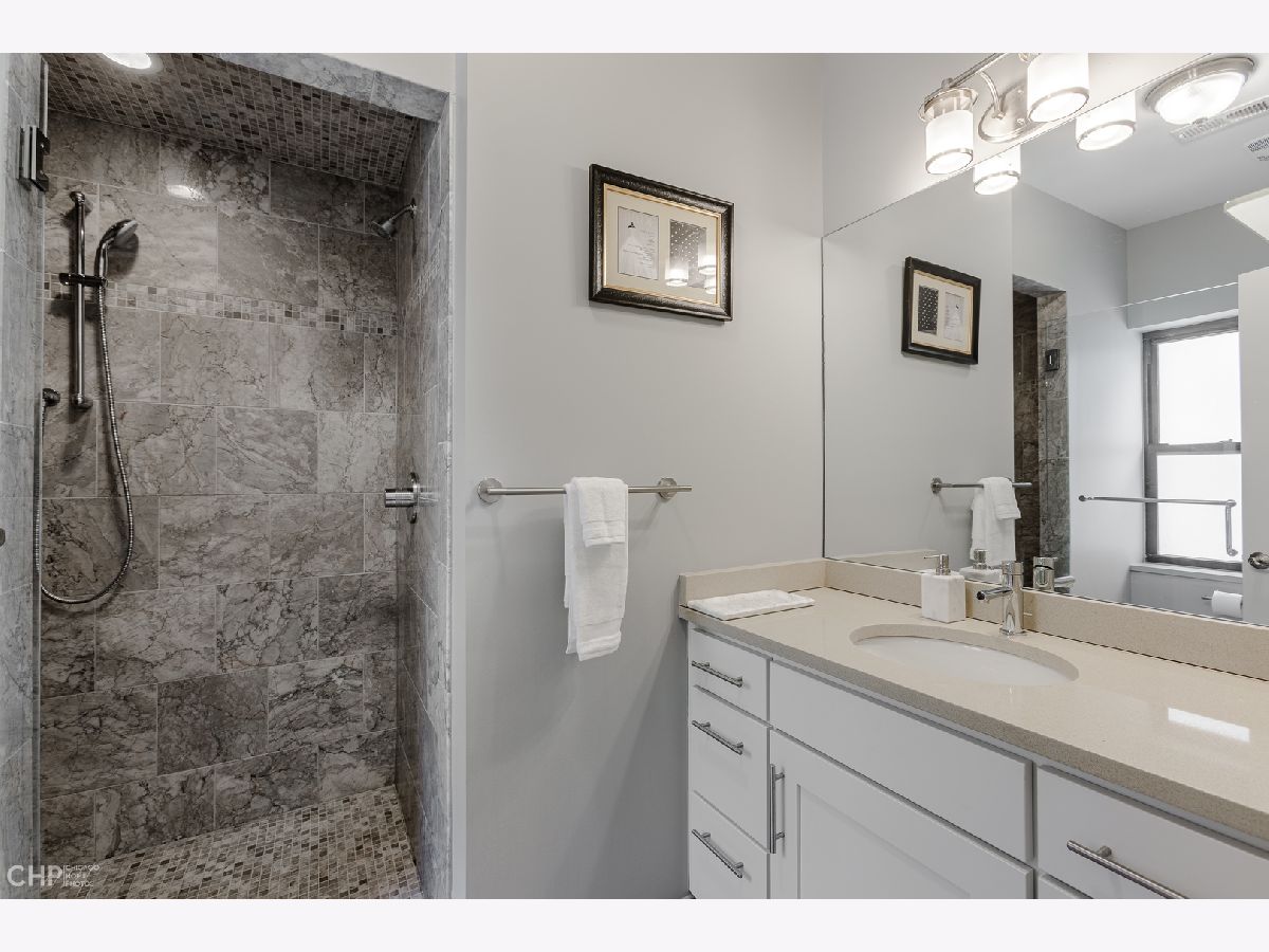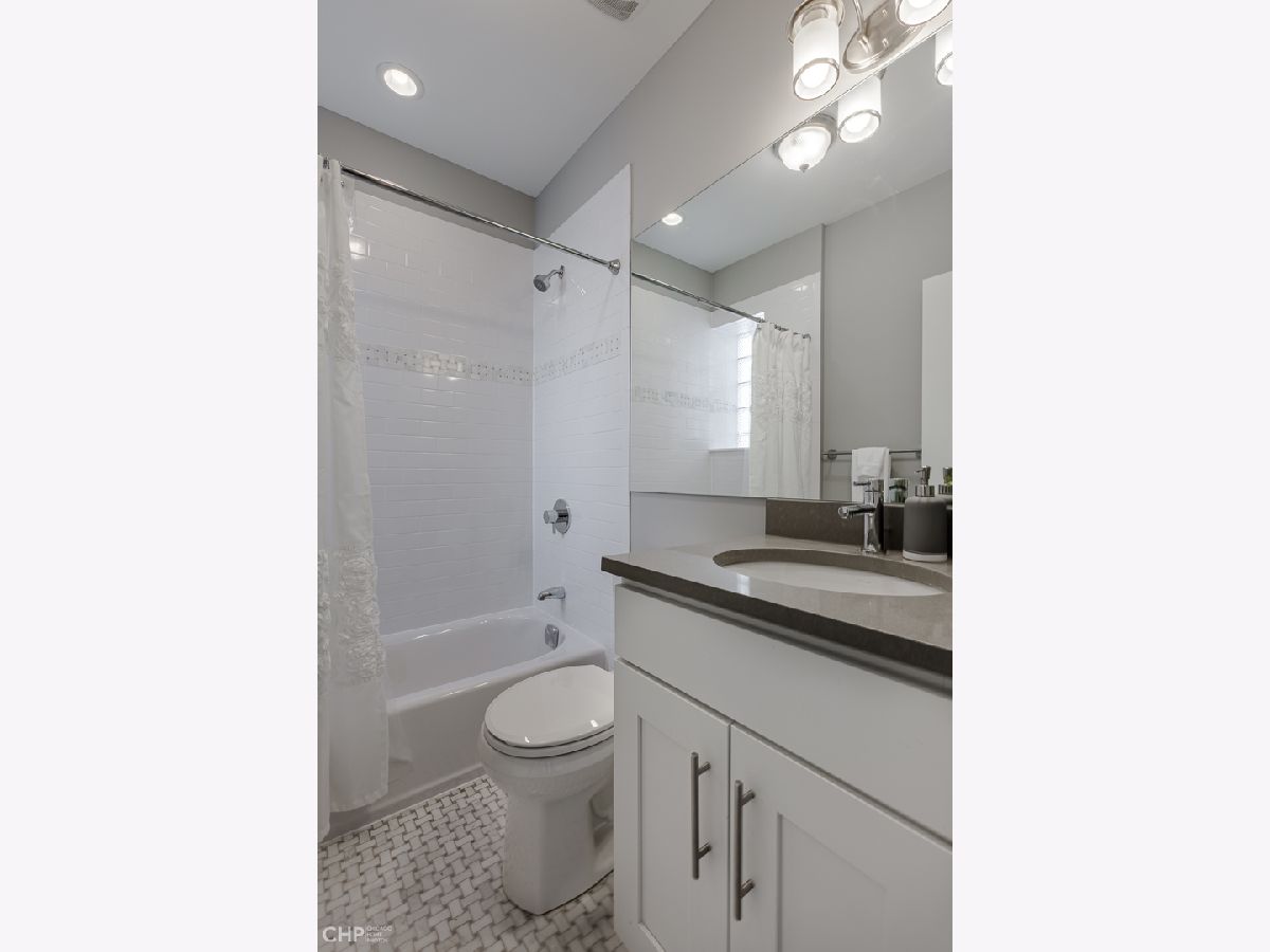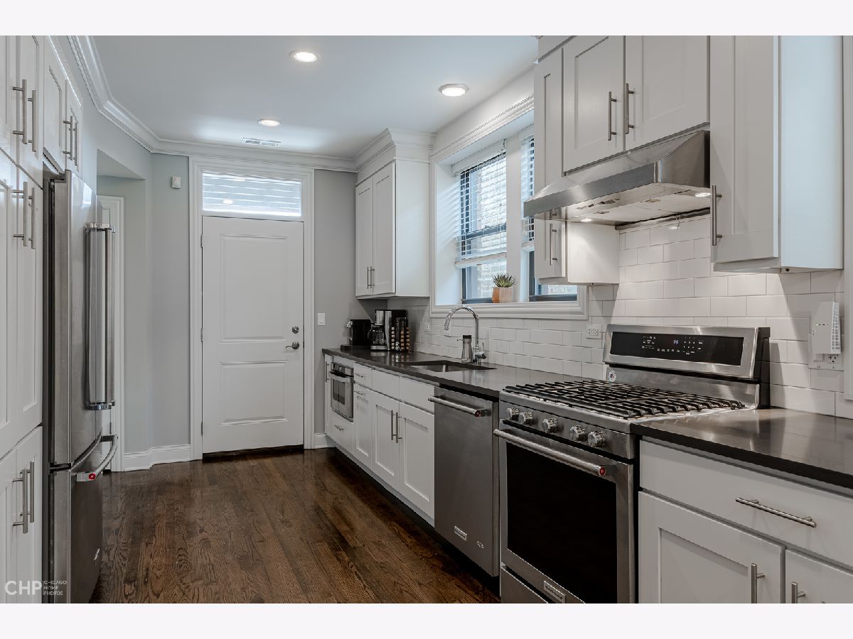 Top-Floor model-quality full modern rehab of a beautiful pre-war building in the heart of North Park! New plumbing, water service, electric, central heat/air, in-unit laundry, sound insulation between units, commercial-grade windows. .. everything! Spacious living room, bathed in light from dramatic west-facing bay windows. Expansive modern kitchen w/ an abundance of custom cabinetry, stylish quartz counters w/ breakfast bar + luxury stainless steel appliances. Huge separate dining room, open to the kitchen for entertaining. Rich hardwood flooring throughout every room (no carpet)! Large master suite and two more nice-sized bedrooms w/ excellent closet space. Plenty of room for a home office. Two full designer bathrooms w/ custom tile. Massive additional private storage room and a full, clean unfinished basement for more common storage. Garage parking spot included in the price! Healthy, well-maintained building w/ solid reserves in great location: quiet one-way street in North Park, close to North Park University, NEIU, Northside College Prep, Hollywood Park, Legion Park and the Nature Center + many restaurants + bars along Bryn Mawr and Foster.