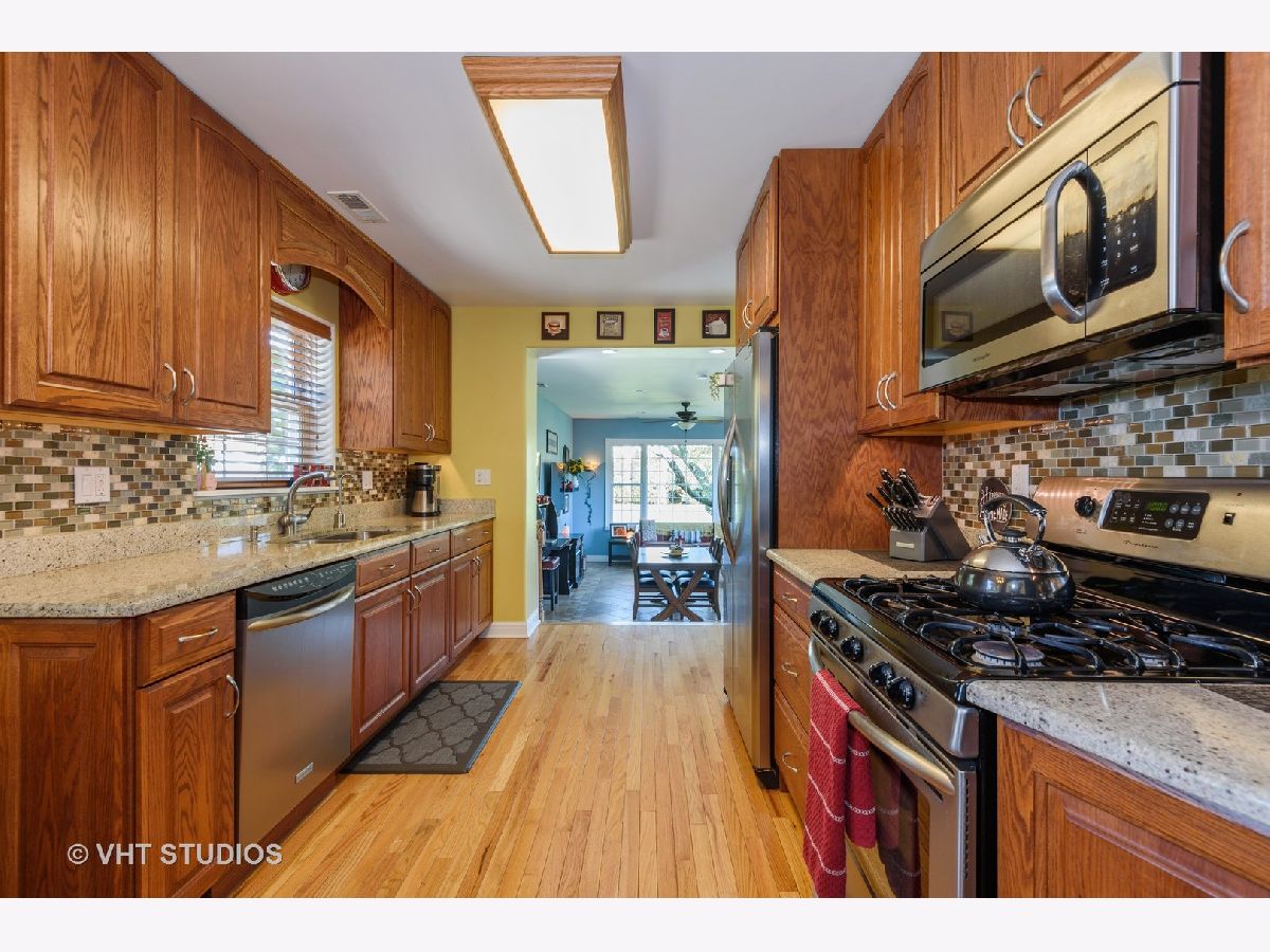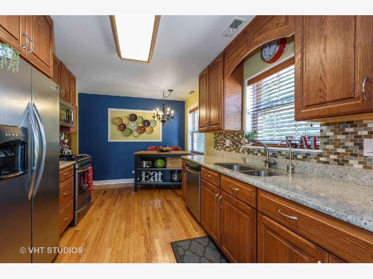 Indian Woods custom built brick ranch offers a rare 1/3 acre lot in the city. A family room with 10' ceilings and 2 walls of windows overlook the yard with space to build the backyard oasis of your dreams. The living room features a gas fireplace with custom built in cabinetry and wall mirror. Hardwood floors on the main level, ceramic tile in the family room with radiant heat. New oak trim and doors on the main level. The newer kitchen features solid oak cabinets with cherry wood stain, granite countertops, a mosaic backsplash & stainless appliances. The main floor bath is updated with a double vanity and whirlpool tub. The attic has a pull down staircase & offers plenty of storage, a whole house fan & a gas forced air furnace, as an auxiliary heat source. The home has hot water baseboard heat & central air. The basement features a retro style rec room with a 2nd fireplace, wet bar, 4th bedroom, office,full bath & laundry/kitchen. Updates include newer copper plumbing, 200 amp electric service, new windows on the main level & basement, new exterior doors in the family room, tuck pointing, fascia & soffits. A side drive and 2 car brick garage provide parking. Enjoy the bike path in the adjacent forest preserves. Metra & shopping are close by.