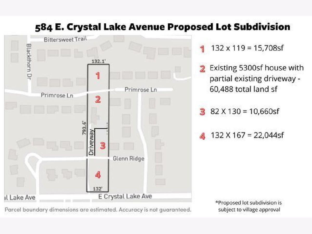 Welcome to 584 E. Crystal Lake Avenue - a truly one-of-a-kind custom built home lovingly lived in and cared for by the original owners and builder. This unique 2.5 acre property is in a prime location less than 1 mile from down town Crystal Lake & Metra and boasts over 5300sf plus a basement and 3 car garage!!! You'll enjoy this beautiful country setting from inside with beautiful views out your vaulted ceilings and 2 story windows, or sit outside on your huge 36x36 private deck while enjoying a swim in your heated pool!!! This home features a 1st floor master bedroom with a GORGEOUS brand new master bath and huge walk-in closet. Other updates include: New DW, MW, Fridge, Washer, Dryer, Furnace, Roof, Carpet; hardwood floors refinished; interior of home painted; deck stained; chimney exterior tuck pointed and finished; and newer water heater. Control your temperature with zoned Heat & Air. Upstairs 2nd bedroom has been roughed in for bathroom. The floor plan is so versatile it can be adjusted for anyone's needs including a small downstairs office, upstairs loft and a 33'x23' rec room just waiting for your finishing touches. Dining Room can be used as family room or a fam/dining room combo. Property can be sub-divided (see proposed lot subdivision in photos and attached) or maintained as is for privacy. See the feature list with more details under additional information. PLEASE DO NOT DRIVE OR WALK PROPERTY WITHOUT AN APPOINTMENT. NOTE: google map directions are incorrect. Take 31 North of 14 to Crystal Lake Avenue turn West to 1st mail box/drive way West of Terra Cotta/Pingree; Turn North. (Across from the church). Listing agent related to sellers.