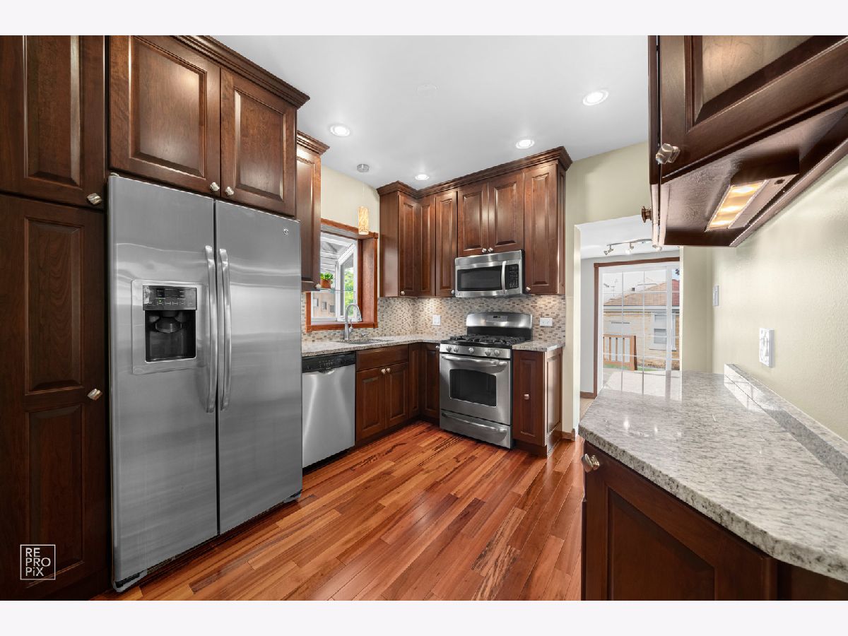 Come see this beautiful Chicago brick bungalow that features 4 above grade bedrooms, 3 full baths, and a bonus room in the finished basement that can be used as a 5th bedroom or home office. There is plenty of space for a growing family or multigenerational living. The main floor is spacious and has hardwood floors throughout. It includes a formal dining room and an extra dining area off the kitchen which overlooks the large deck and backyard. This stunning kitchen is fully updated including Amish custom cabinets, granite countertops, garden window, and plenty of cabinet space. The home has been freshly painted with brand new carpet in the upstairs bedrooms. 2 car brick garage with EEO. Great location - close to all public transit and 15 minutes away from O'Hare and downtown.
