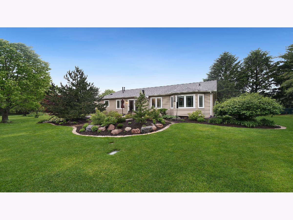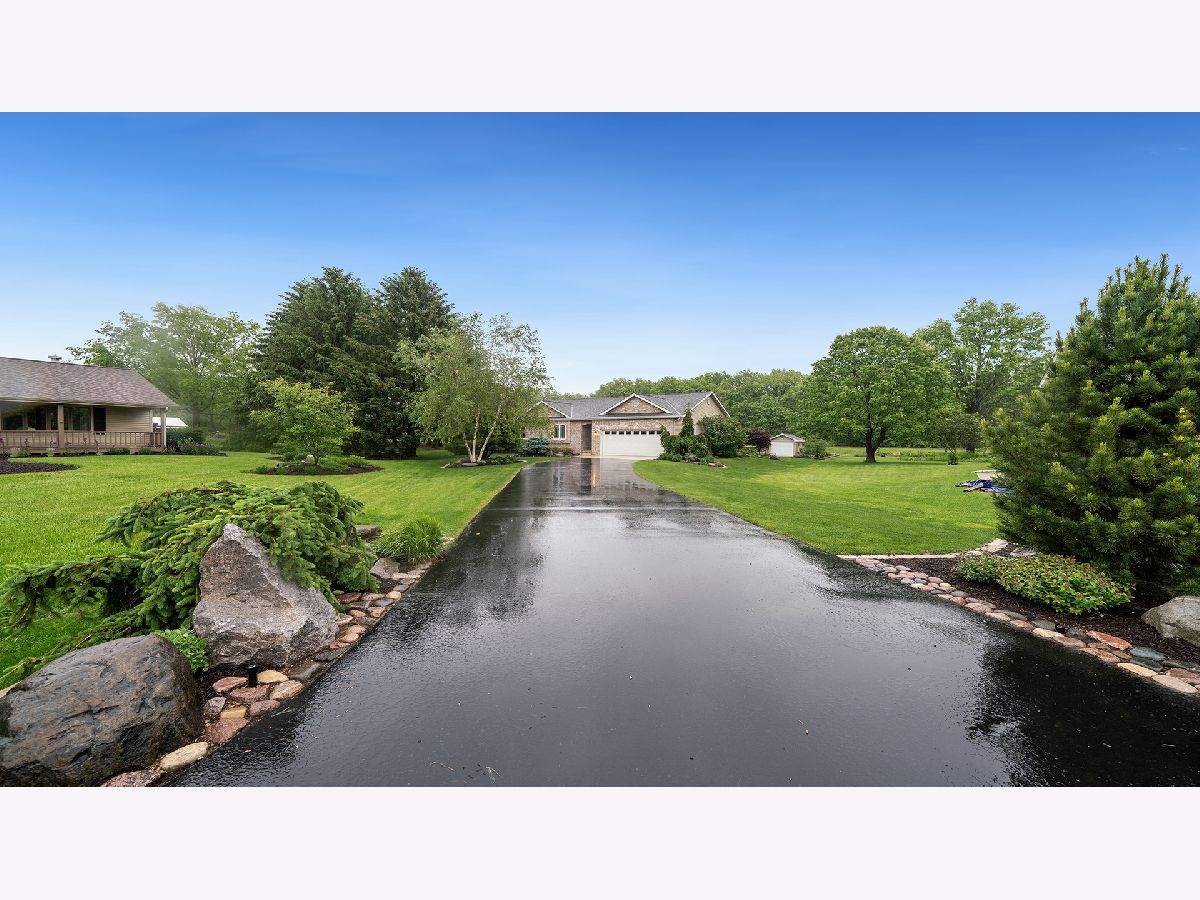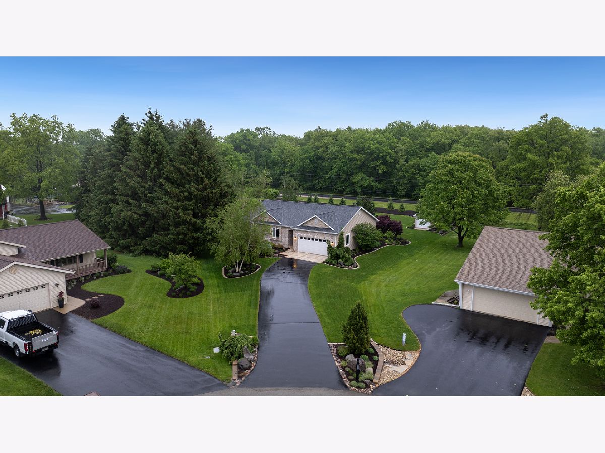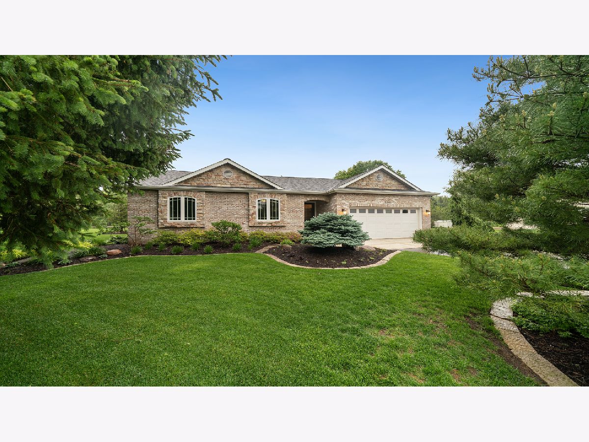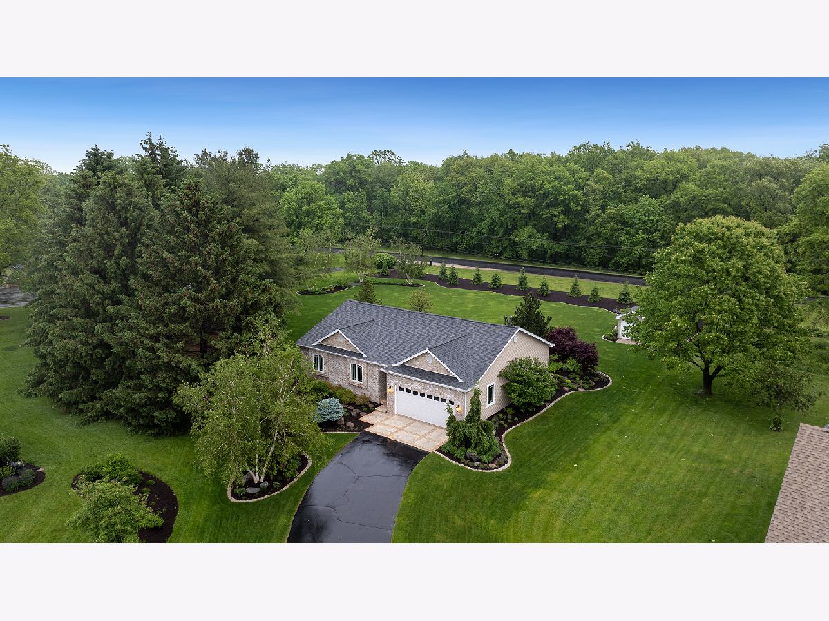 This stunning all-brick ranch home is beautifully landscaped and features a gorgeous entry with a stamped concrete front walk. Inside, the open-concept living area boasts vaulted ceilings and rich hardwood floors throughout. The living room is filled with natural light from large windows and centers around a striking floor-to-ceiling stone gas fireplace. The kitchen offers custom cabinetry, a subway tile backsplash, stainless steel appliances, and space for a generously sized dining table. Doors from the dining area lead to a custom patio with a serene water feature and a beautifully manicured backyard. A shed with electricity and an overhead garage door opener provides added utility. The main floor includes three bedrooms and two full bathrooms, including a spacious primary suite with tray ceiling, large windows overlooking the backyard, and a private bath with a walk-in shower. First-floor laundry adds convenience. The finished lower level offers a large family room with a gas fireplace, a movie room, an additional room perfect as a fourth bedroom or office, and a full bathroom. Additional features include a heated 2-car attached garage with epoxy floors, RO system to the kitchen sink, roof replaced in 2018, furnace and AC from 2019, water heater from 2022, and septic pumped in May 2023. Windows are approximately 10 years old, and the kitchen was renovated in 2013. This home is within walking distance to Espenscheid Forest Preserve.