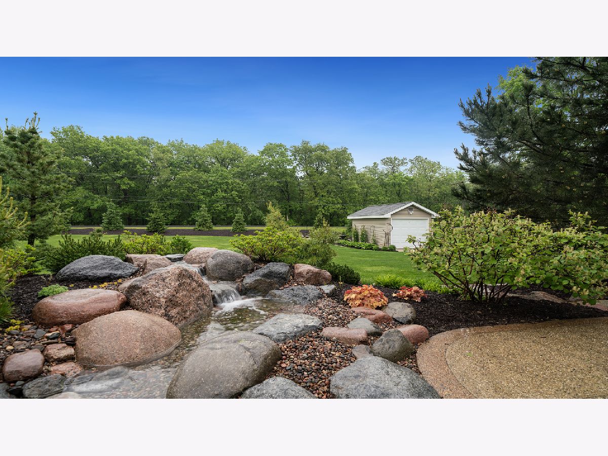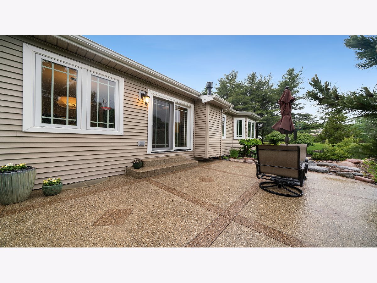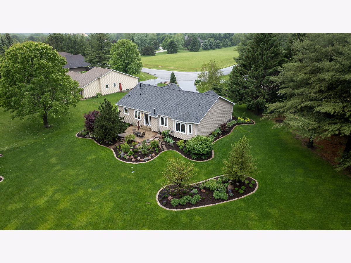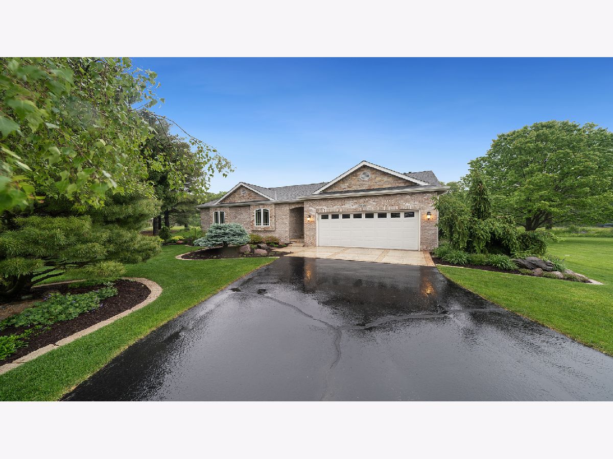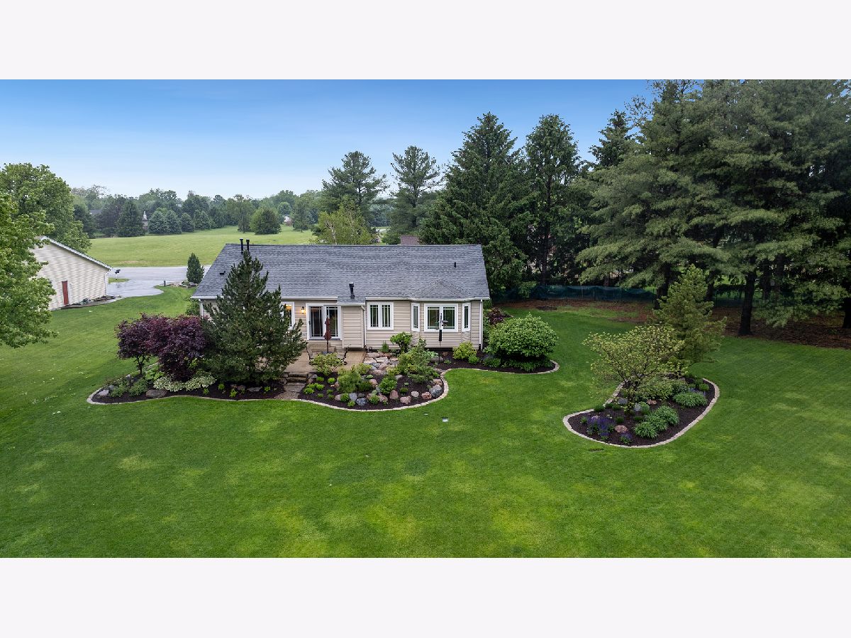This stunning all-brick ranch home is beautifully landscaped and features a gorgeous entry with a stamped concrete front walk. Inside, the open-concept living area boasts vaulted ceilings and rich hardwood floors throughout. The living room is filled with natural light from large windows and centers around a striking floor-to-ceiling stone gas fireplace. The kitchen offers custom cabinetry, a subway tile backsplash, stainless steel appliances, and space for a generously sized dining table. Doors from the dining area lead to a custom patio with a serene water feature and a beautifully manicured backyard. A shed with electricity and an overhead garage door opener provides added utility. The main floor includes three bedrooms and two full bathrooms, including a spacious primary suite with tray ceiling, large windows overlooking the backyard, and a private bath with a walk-in shower. First-floor laundry adds convenience. The finished lower level offers a large family room with a gas fireplace, a movie room, an additional room perfect as a fourth bedroom or office, and a full bathroom. Additional features include a heated 2-car attached garage with epoxy floors, RO system to the kitchen sink, roof replaced in 2018, furnace and AC from 2019, water heater from 2022, and septic pumped in May 2023. Windows are approximately 10 years old, and the kitchen was renovated in 2013. This home is within walking distance to Espenscheid Forest Preserve.