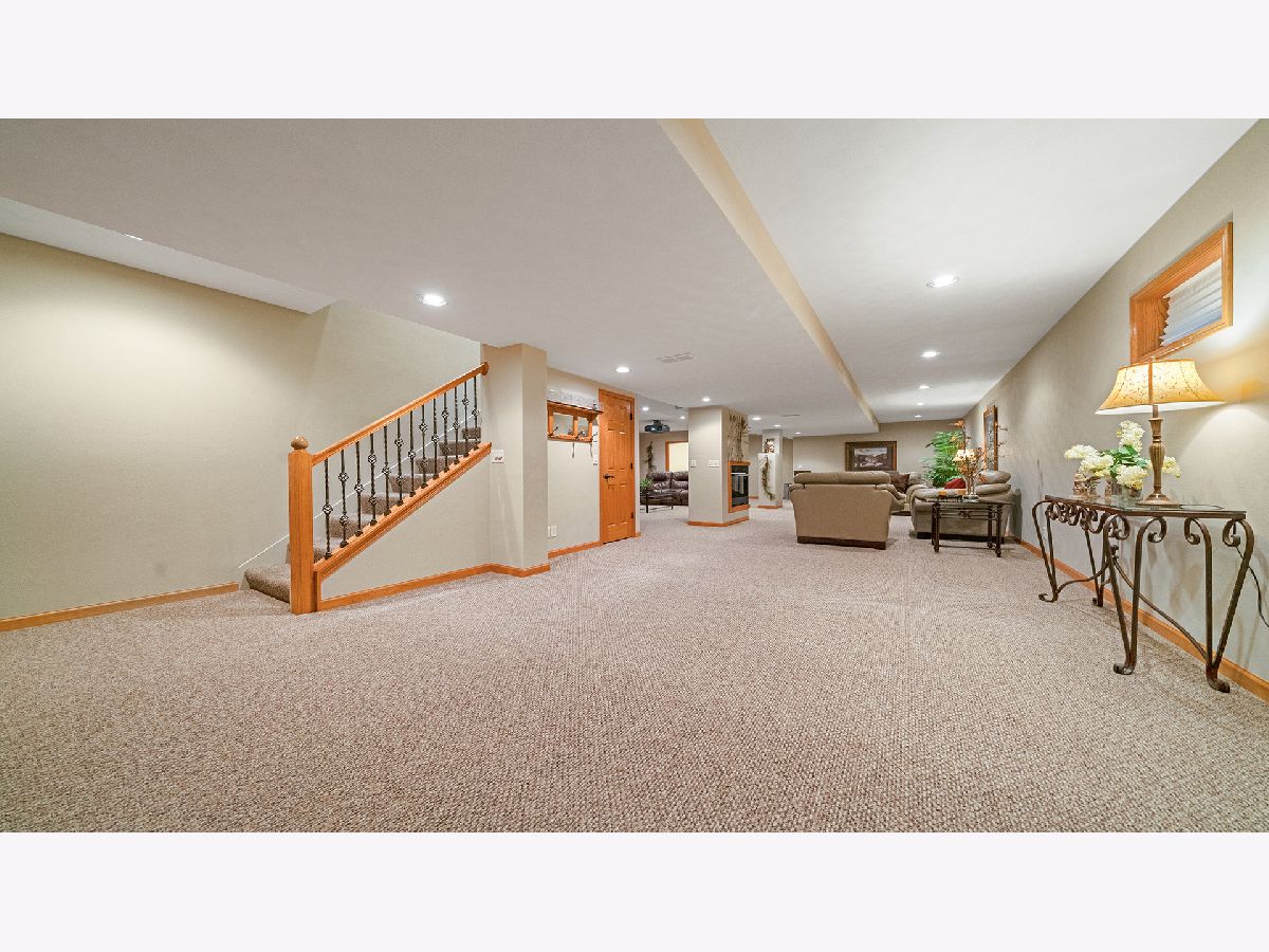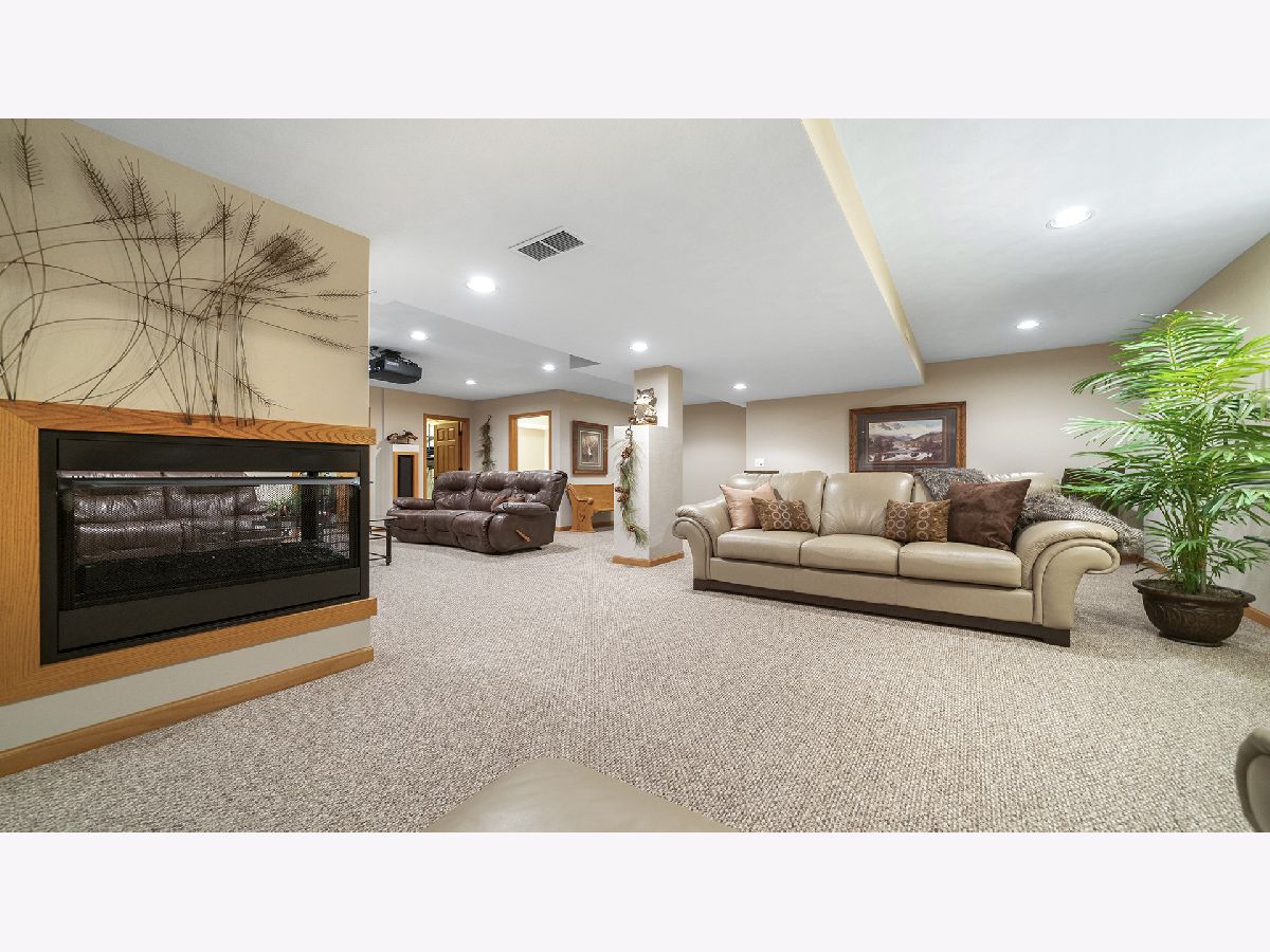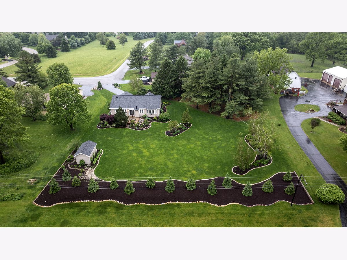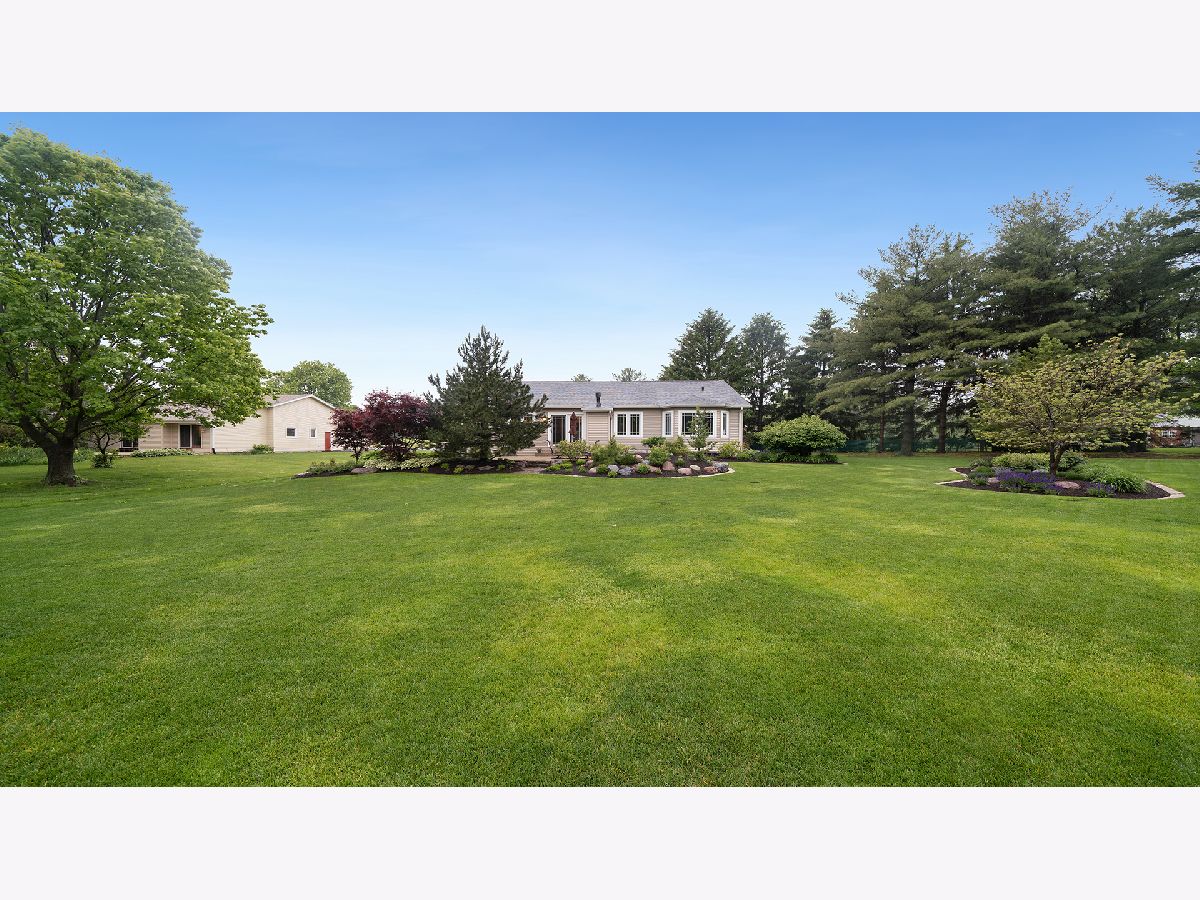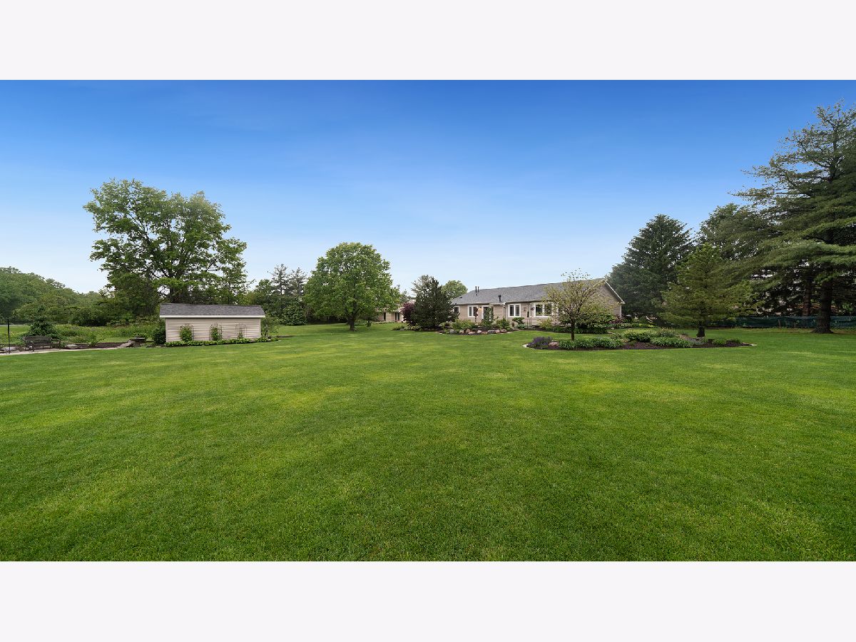 This stunning all-brick ranch home is beautifully landscaped and features a gorgeous entry with a stamped concrete front walk. Inside, the open-concept living area boasts vaulted ceilings and rich hardwood floors throughout. The living room is filled with natural light from large windows and centers around a striking floor-to-ceiling stone gas fireplace. The kitchen offers custom cabinetry, a subway tile backsplash, stainless steel appliances, and space for a generously sized dining table. Doors from the dining area lead to a custom patio with a serene water feature and a beautifully manicured backyard. A shed with electricity and an overhead garage door opener provides added utility. The main floor includes three bedrooms and two full bathrooms, including a spacious primary suite with tray ceiling, large windows overlooking the backyard, and a private bath with a walk-in shower. First-floor laundry adds convenience. The finished lower level offers a large family room with a gas fireplace, a movie room, an additional room perfect as a fourth bedroom or office, and a full bathroom. Additional features include a heated 2-car attached garage with epoxy floors, RO system to the kitchen sink, roof replaced in 2018, furnace and AC from 2019, water heater from 2022, and septic pumped in May 2023. Windows are approximately 10 years old, and the kitchen was renovated in 2013. This home is within walking distance to Espenscheid Forest Preserve.