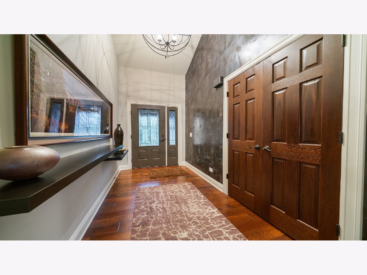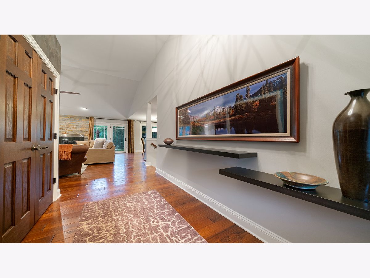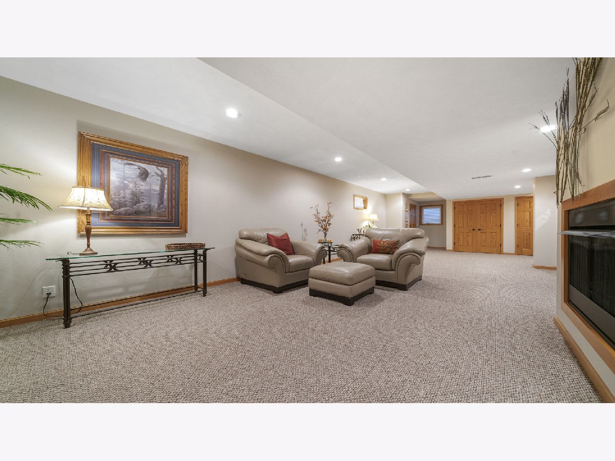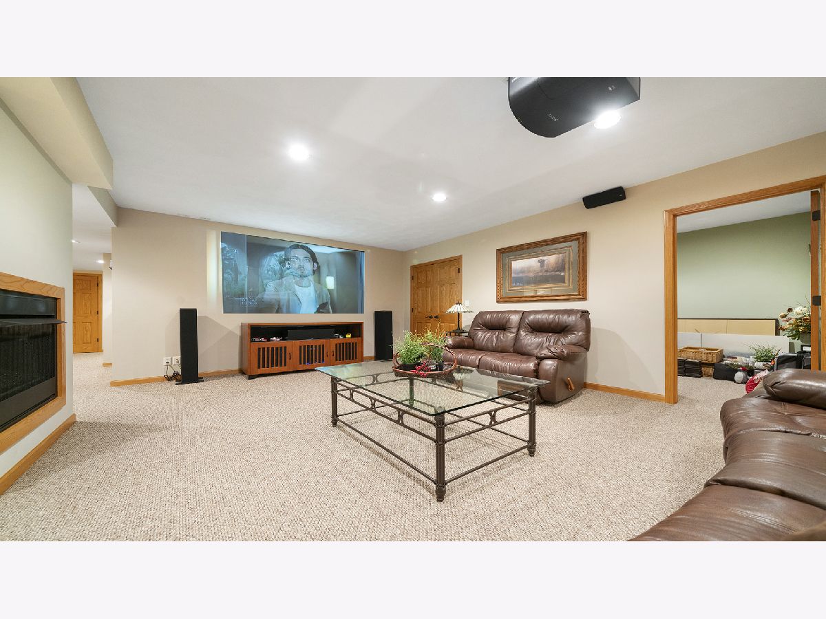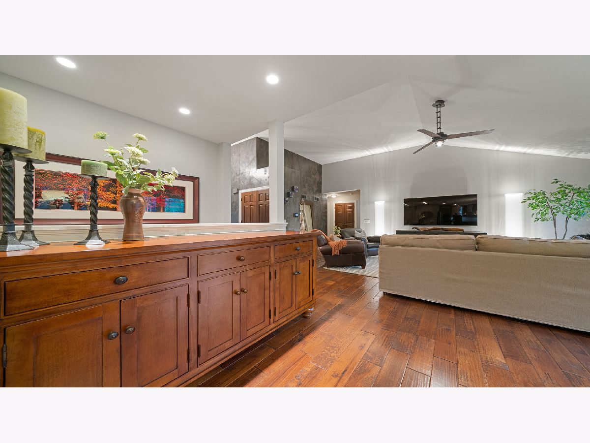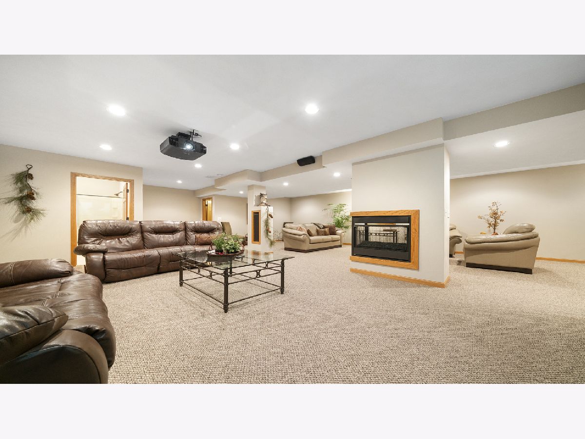 This stunning all-brick ranch home is beautifully landscaped and features a gorgeous entry with a stamped concrete front walk. Inside, the open-concept living area boasts vaulted ceilings and rich hardwood floors throughout. The living room is filled with natural light from large windows and centers around a striking floor-to-ceiling stone gas fireplace. The kitchen offers custom cabinetry, a subway tile backsplash, stainless steel appliances, and space for a generously sized dining table. Doors from the dining area lead to a custom patio with a serene water feature and a beautifully manicured backyard. A shed with electricity and an overhead garage door opener provides added utility. The main floor includes three bedrooms and two full bathrooms, including a spacious primary suite with tray ceiling, large windows overlooking the backyard, and a private bath with a walk-in shower. First-floor laundry adds convenience. The finished lower level offers a large family room with a gas fireplace, a movie room, an additional room perfect as a fourth bedroom or office, and a full bathroom. Additional features include a heated 2-car attached garage with epoxy floors, RO system to the kitchen sink, roof replaced in 2018, furnace and AC from 2019, water heater from 2022, and septic pumped in May 2023. Windows are approximately 10 years old, and the kitchen was renovated in 2013. This home is within walking distance to Espenscheid Forest Preserve.