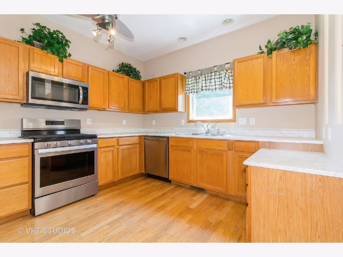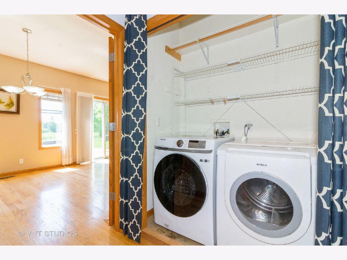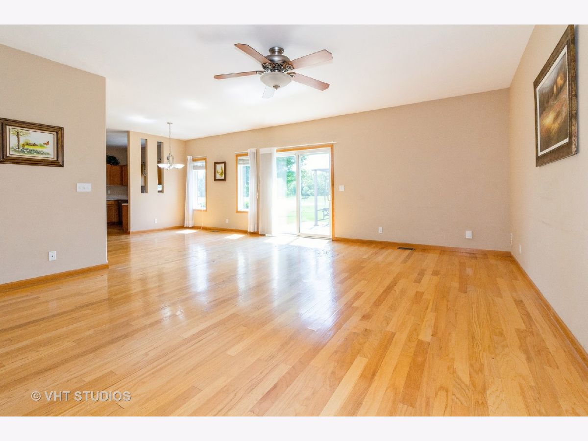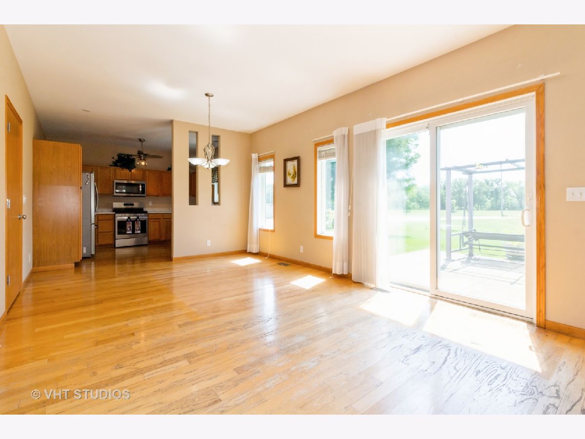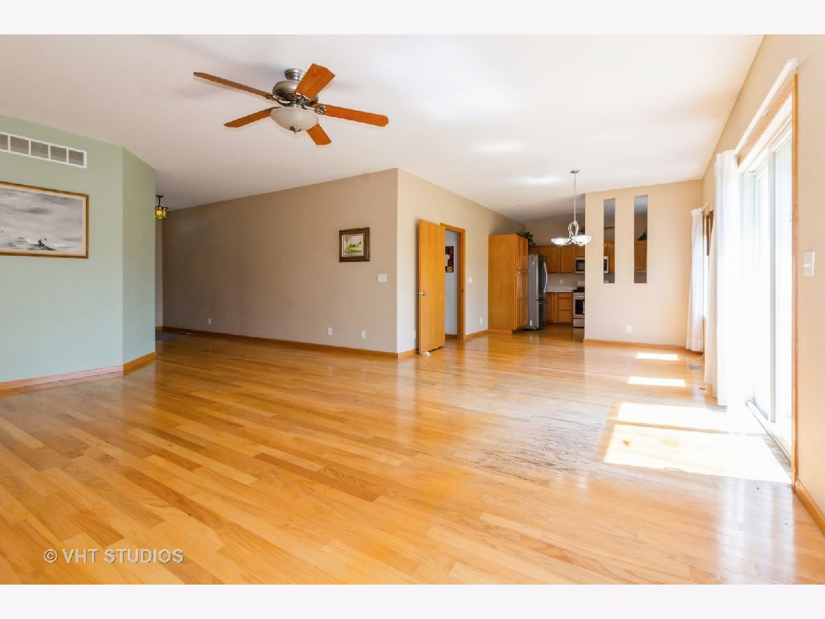 MULTIPLE OFFERS - Highest and best by noon on Monday 7/22. This wonderful 3 bed, 2 full bath ranch home is stair/step free making it an easily accessible home for everyone! This well maintained home features hardwood floors and rounded bullnose corners. Kitchen offers newer stainless steel appliances, pantry cabinet with pull out drawers, ample cabinet and counter space and sink window overlooking the tranquil backyard. Separate eating area off the kitchen. Spacious living room with ceiling fan and sliding glass doors to the cement patio. Hall bath with ceramic tile floors and tub/shower combo. Third bedroom is carpeted. Spacious primary bedroom with large walk in closet and ensuite that has a large shower with seat and grab bars. All 3 bedrooms have ceiling fans and nice sized closets. Washer and Dryer located off the garage. Washer is only 1 year old. NEW A/C in 2023! Home sits on a large corner lot and there are no neighbors behind you! You'll enjoy the peaceful and serene views of the pond (great for fishing) and nature from the 14x14 cement patio. Located in the popular Riverbend subdivision this home is close to the walking/bike path, Russell Woods Forest Preserve and downtown shops and dining.
