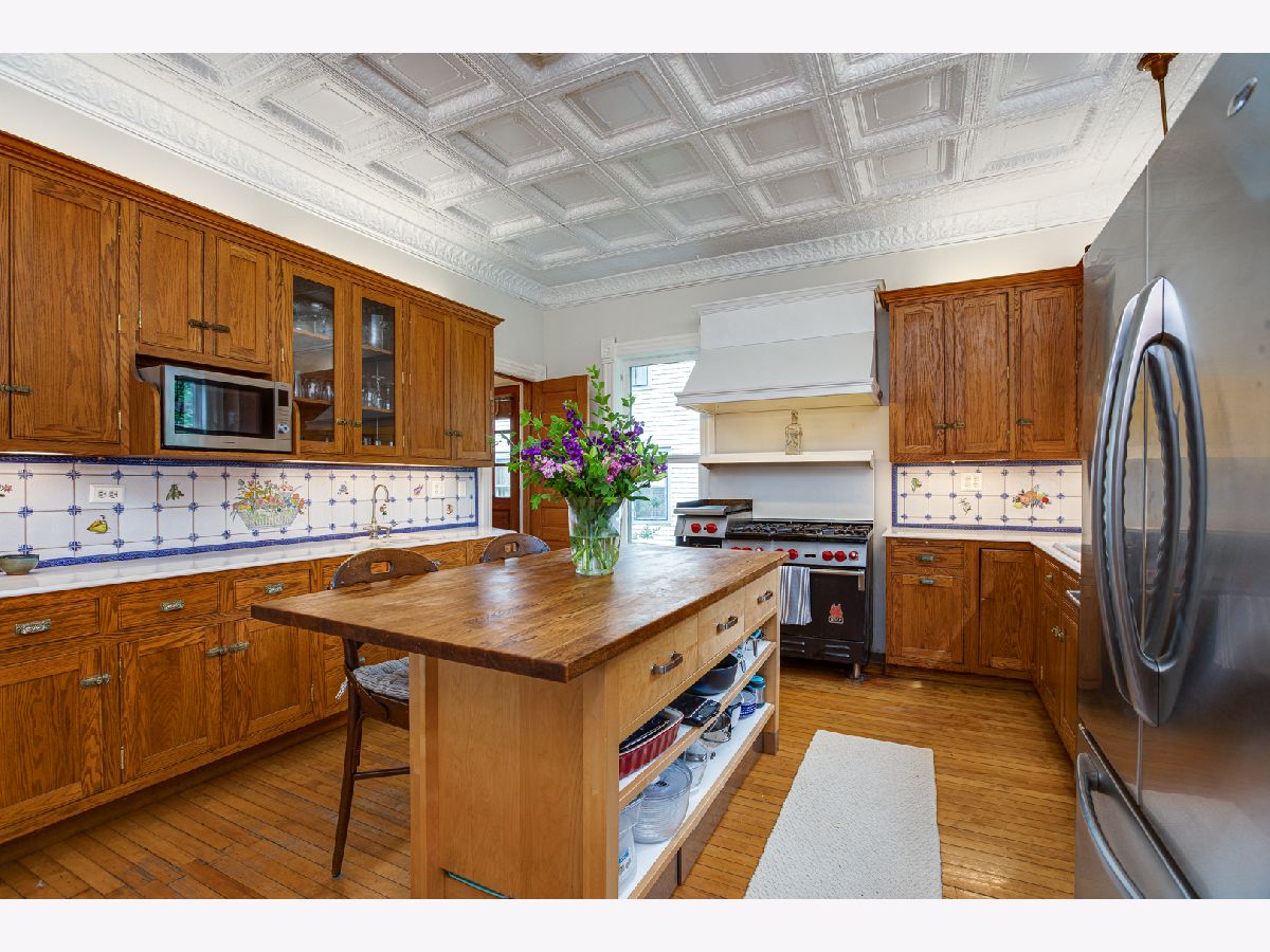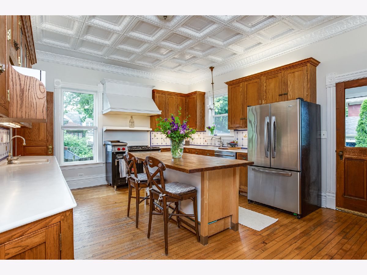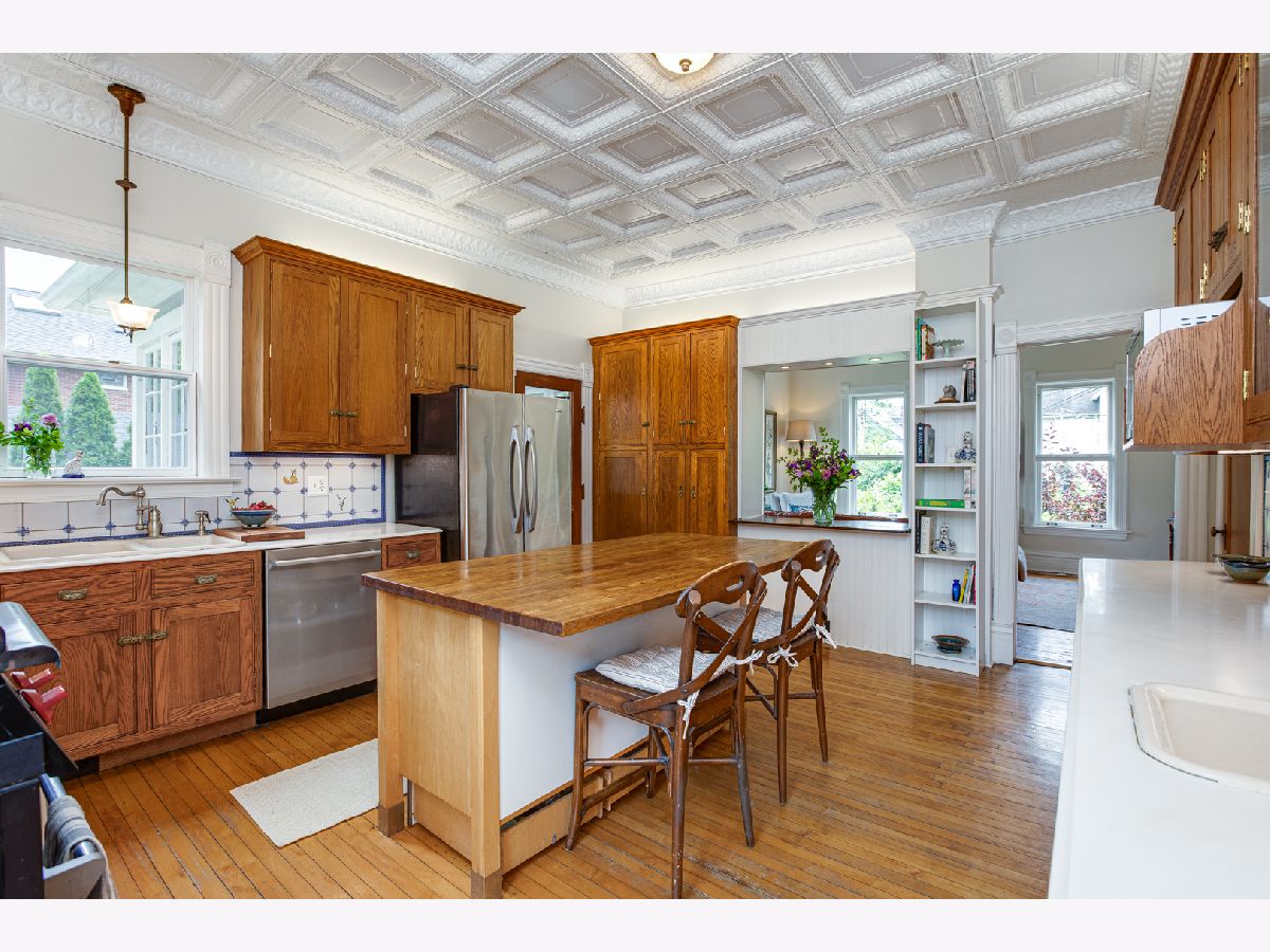 Welcome to this charming home nestled in an ideal location, on a huge lot, just steps away from downtown Wheaton, Wheaton College, exquisite dining, entertainment options, Northside Park, and the convenient Metra train to Chicago. As you approach, the inviting covered front porch sets the stage for the character and warmth found within. Step through the private foyer and be captivated by the unique features this home boasts, including soaring 10-foot ceilings on both levels, original built-ins, and hardwood floors throughout. Natural light dances through the tall windows, creating a bright and airy ambiance. Entertain effortlessly on the main level, where an open layout seamlessly connects the Parlor/Living Room, Dining/Family Room, Drawing Room/Den, and the expansive Kitchen. The kitchen is a dream, showcasing an impressive tin ceiling, abundant cabinetry, a generous island, two breakfast bars, Corian countertops, and includes all of the appliances. Access to the back porch and fenced backyard can be found from the kitchen, while a second door leads to the side yard. Convenience meets comfort with a main-level 4th bedroom/office featuring bright windows and access to a full bath. Upstairs, three spacious bedrooms await plus walk-in closets. A newly renovated full bath (completed in 2024) exudes modern elegance with its shower, tub, and double vanity. The basement offers ample storage space and a convenient bilco door. Step outside to relax and unwind on the elevated deck surrounded by lush landscaping. The oversized 2 1/2+ car garage includes a substantial storage room at the back. Additional highlights of this home include a 2nd floor laundry, a new roof (2019), concrete front walk (2022), a new water heater (2023) and a new humidifier (2024). Teens residing in this area may attend the highly regarded Wheaton North High School. Don't miss out on this extraordinary opportunity to own a piece of Wheaton's history. Schedule your showing today and experience the allure of this remarkable home.