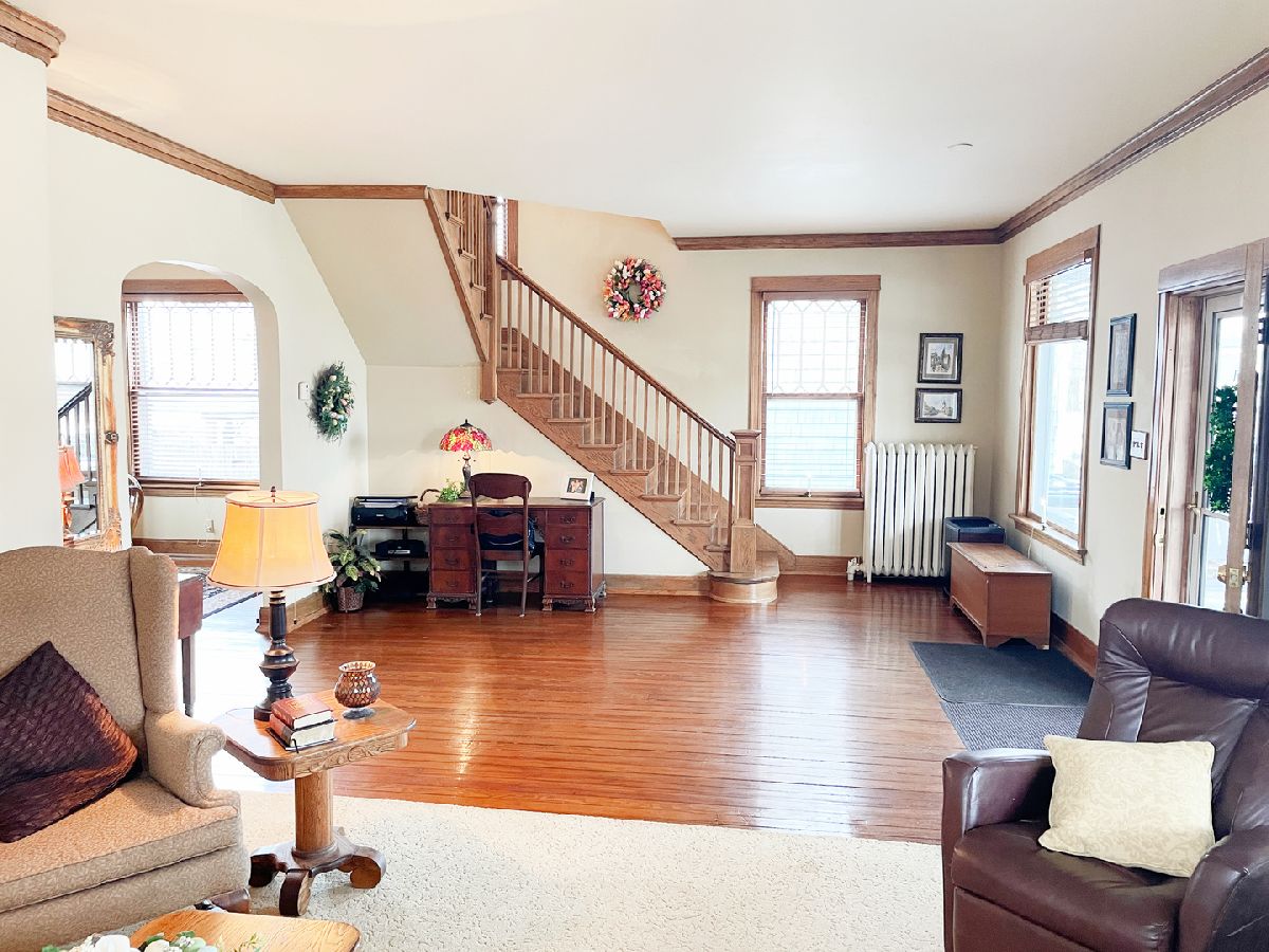 Beautiful! This charming, well-maintained 4 bedroom 2 story home features 9.5' ceilings, original hardwood, woodwork, and doors throughout, as well as depression glass and custom stained glass windows. You are welcomed by a large porch, perfect for relaxing and enjoying the outdoors. Step inside to find a spacious great room featuring large windows and an open hardwood staircase. Continue on to find the separate dining room, half bath, and kitchen. Upstairs find 4 large bedrooms, an oversized hallway, and a full bathroom. In the basement, there is ample storage space, as well as another half bath and large utility sink. Outside you will find a back deck, spacious yard, and a 1 car detached garage.