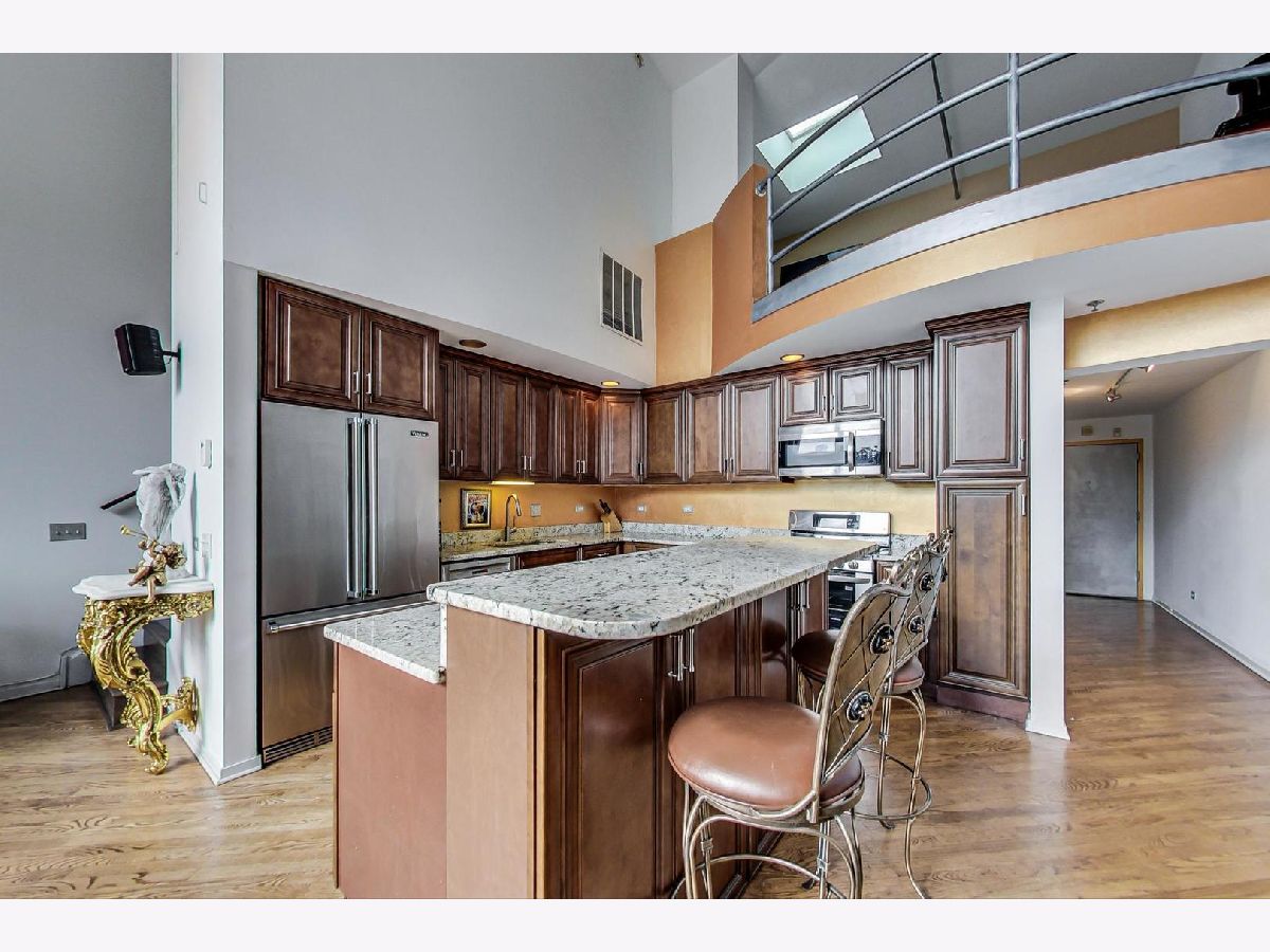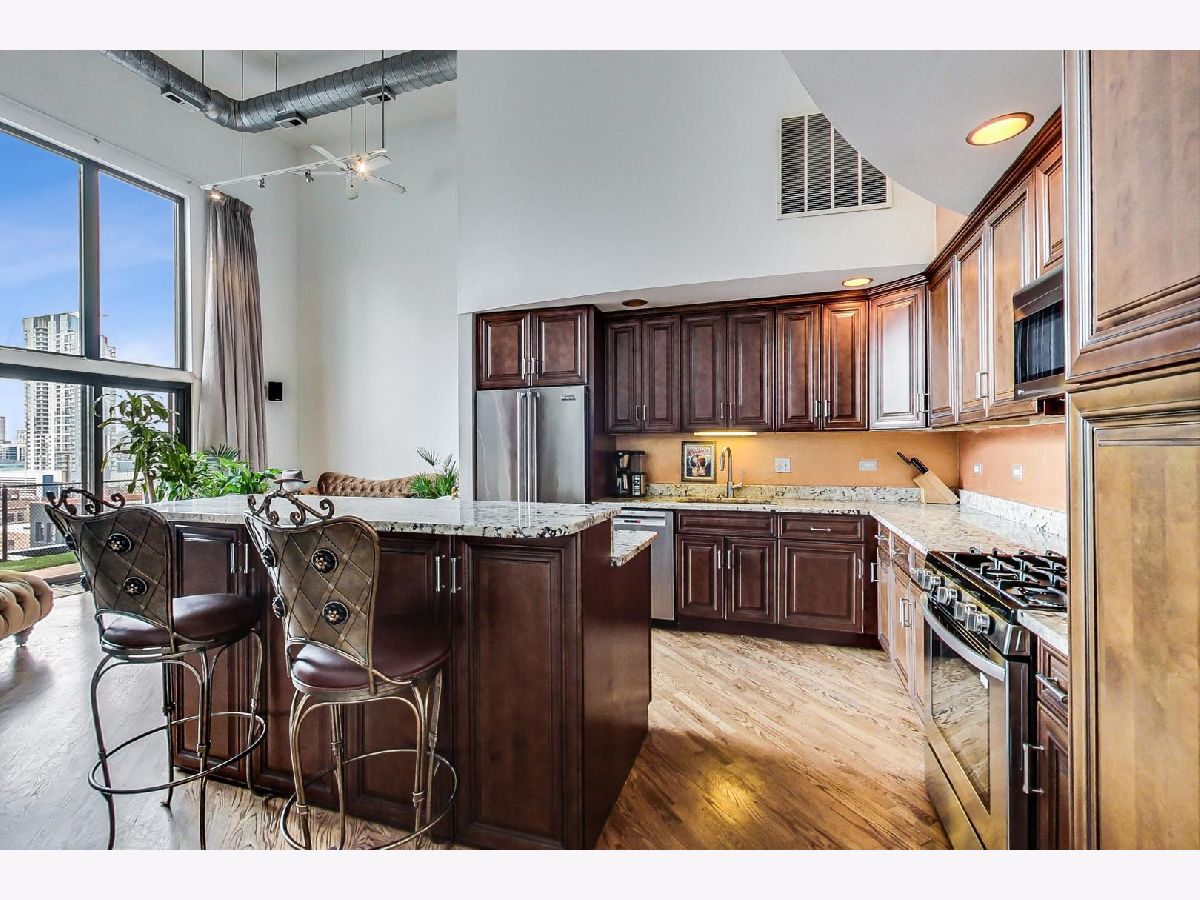 Sleek and sophisticated penthouse unit in a highly sought after and rarely available tier and floor in building. This unit features gleaming hardwood floors and filled with natural sunlight. Wonderful open concept floor plan with a spectacular living room with floor to ceiling windows offer unobstructed views of the city skyline and a stunning fireplace with granite surround. Beautiful kitchen with custom cabinetry, granite counter tops and stainless steel Viking appliance package. Lovely master suite features a large skylight, spacious closet and full private master bath with a custom vanity and a separate shower appointed with natural stone. Spacious second bedroom with large closet and private bathroom. In unit laundry with full size washer and dryer. Expansive, private balcony is the ultimate space for relaxation. Premium parking spot available. Great offering in this price point. Call for your private showing today.