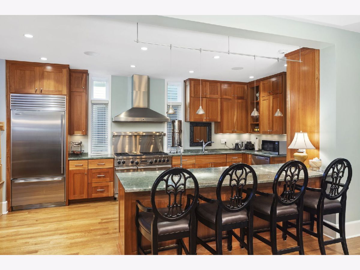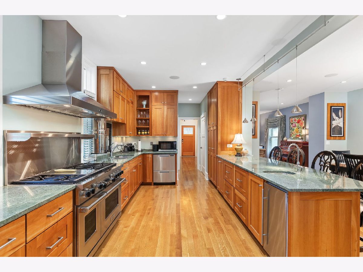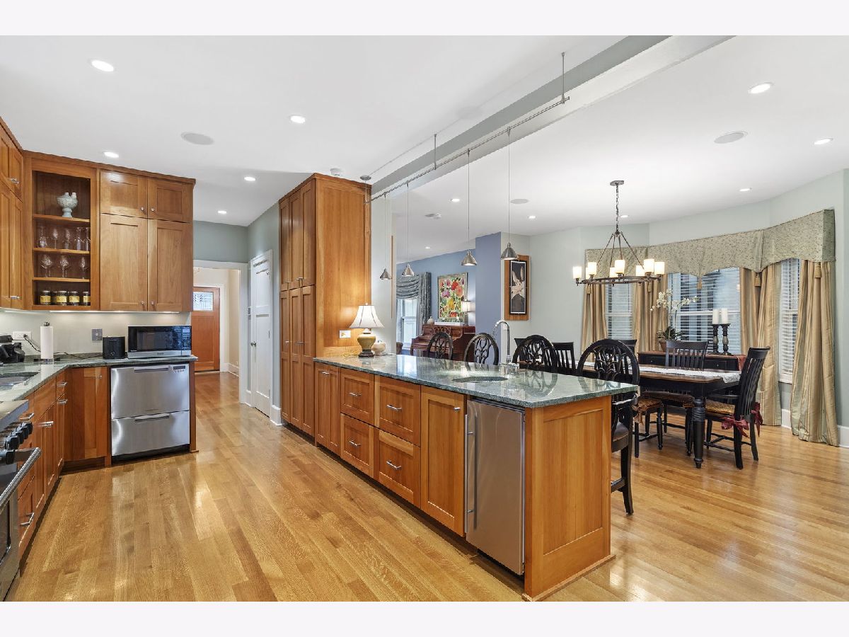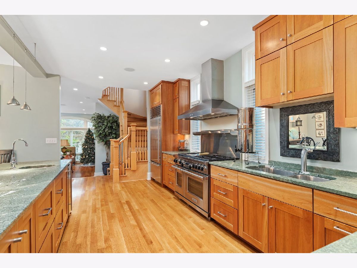 Where luxury meets functionality. Welcome home! This one-of-a-kind Oak Park residence is located in the heart of The Frank Lloyd Wright Historic District. Nearly 30 residences and buildings make up his masterpiece portfolio, including his own home and studio in the ever so loved community of Oak Park. 617 N Kenilworth was meticulously gut rehabbed in 2008. Three stories of new construction comprise an addition that was completed at the same time. There are a total of five bedrooms and four full and two half bathrooms that embody this picture-perfect property. The original structure blends seamlessly into the new construction. Pristine quarter sawn white oak flooring throughout is just the beginning. Natural sunlight drenches this envious floorplan thanks to endless "walls of windows." All staircases, handrails, balustrades, and posts have been precisely crafted. From the charming front porch to the welcoming foyer, you instantaneously feel a sense of hospitality. It has two primary suite options. One is currently being used as a penthouse office suite. The first floor is comprised of a charming living room, a striking open concept dining room and Chef's kitchen greet you. From high end appliances to luxury custom-made countertops and tiles, marble and granite per Ann Sacks, you are ready to effortlessly entertain friends and family. The first floor also boasts a gorgeous sunken family room which can harmoniously be accessed right off the kitchen. This intimate space encompasses a gas-ignite wood burning fireplace and a bank of floor-to-ceiling West facing windows with unobstructed views of the patio for a sensational sunset experience. Explore the second floor by proceeding up the winding staircase off the family room or take the second gorgeous staircase off of the entryway. This floor boasts the same pristine quarter sawn white oak flooring throughout. Revel in four idyllic sized bedrooms, three full bathrooms, and a second enticing laundry room. The primary bedroom showcases one of three fireplaces in its intimate sitting area. The third floor is currently being used as a third family gathering space equipped with fireplace, office, and full bathroom. Rich and cozy Ralph Lauren carpet throughout the third floor. This space could also be used as a second option as a penthouse primary suite. The vaulted ceilings and the designer bank of West facing windows (with sky lights) gives an unmatched airy feel. High-end Sonos/Sonance sound system through-out the home is a nice bonus. The addition also includes another large family room in the lower level which has 10' ceilings. This very generous gathering space is the pinnacle media and gaming room with thoughtful lighting, speakers, and ample sized beverage fridge. An additional half bath is also nearby. At an address that can never be duplicated, make this dream home your reality today! Overall square footage; Basement 1542, First Floor 1557, Second Floor 1579, Third Floor 1158. Updates and improvements are just beyond! Highest quality craftsmanship, design choices, and materials. Geothermal Heating/Cooling. All basement windows Marvin hurricane resistant glass. Marvin windows throughout.Ultra high capacity 1 1/2" gauge copper supply line from buffalo box. Two 200 AMP lines underground from pole. Hard-wired dedicated ethernet/Cat 5-E network, plus 6 commercial mounted access points, including on front porch. Full yard sprinkler and soaker system installed in 2021. New garage has a small heated loft with a skylight. Duo laundry 1 set in basement, 2nd on the second floor. Sonos/Sonance sound system, in ceiling and wall speakers/ subwoofers (11 speakers in main floor alone) Hard wired 5 hi-res security cameras at all key spots. All imagery stored on "Digital Watchdog NVR" system W.D.N Architecture Design.