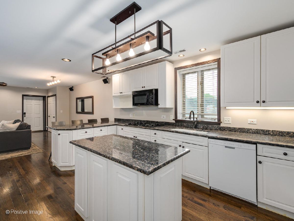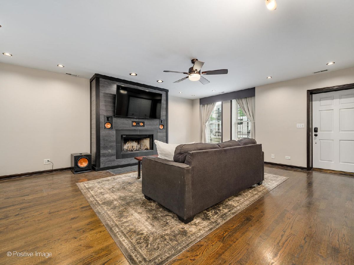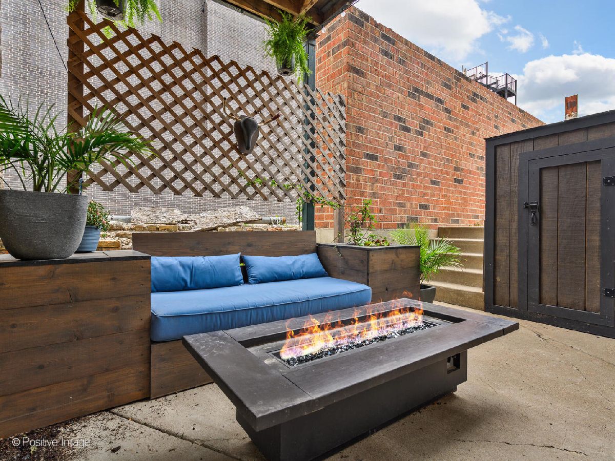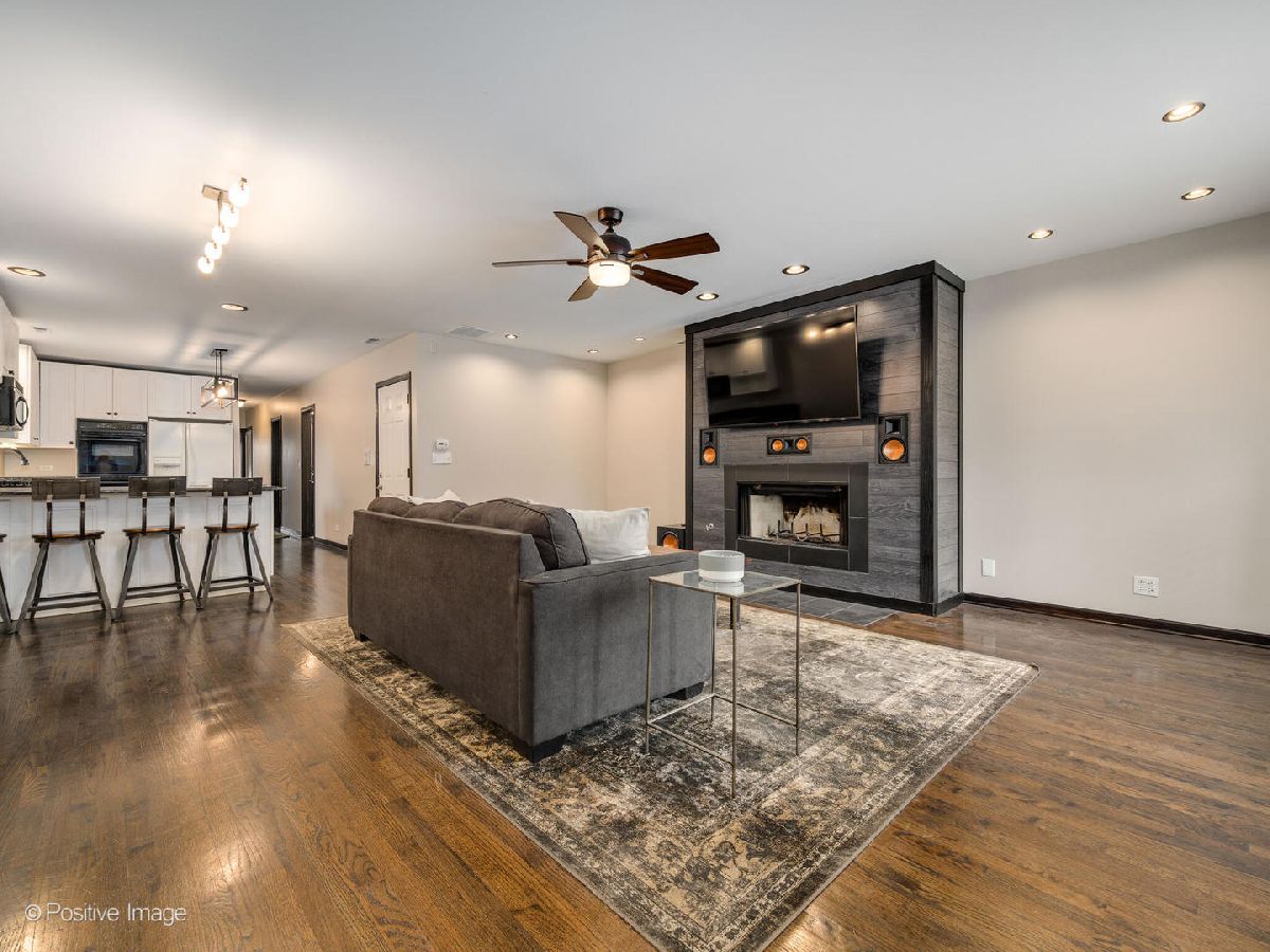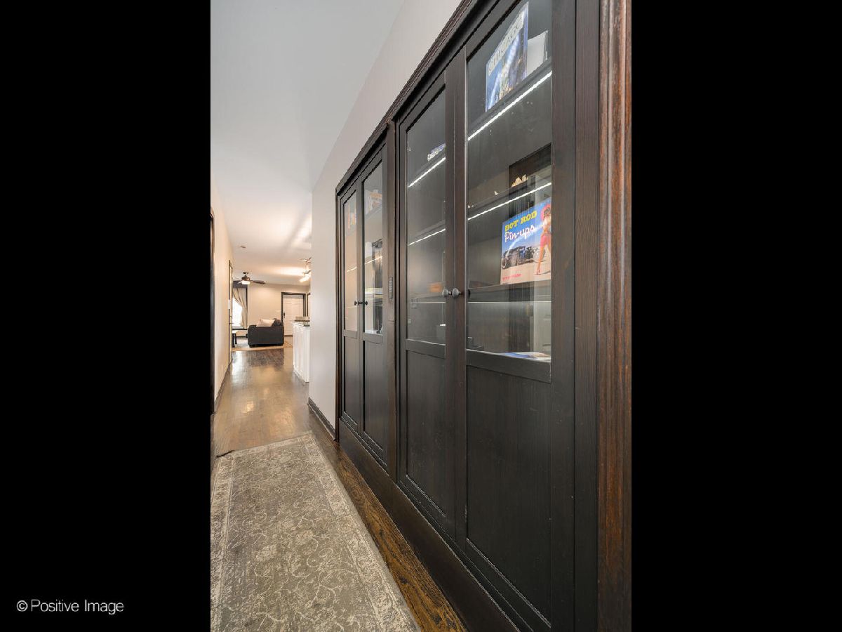 Meticulously upgraded, oversized 1500sqft 2 bed 2 bath condo! Beautifully refinished hardwood floors throughout. Wood burning/gas fireplace in living room is adorned with cool grey wood paneling and a built-in Klipsch speaker system with included receiver. Custom fireplace storage cabinets and a built-in bookshelf off the main hallway. Chef's open-concept kitchen features an eat-in bar that opens to the living/dining room; granite countertops, white cabinetry, built in microwave and a double oven. Master bedroom suite features a large walk-in closet, and provides access to an outdoor patio. Luxury renovated master bathroom boasts dual vanities, custom tile & Kohler fixtures, premium countertops, and a walk-in shower with 3 showerheads, one rain shower. Renovated second bathroom features a soaking tub, also with custom tile & fixtures. Outdoor patio space and storage shed complete this unique, custom, oversized condo! In-unit washer and dryer. Central air. Storage available in building. Short walk to Sushi X, Windy City Cafe, Big Shoulders Coffee, and the Chicago Blue Line Stop.