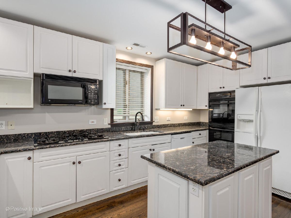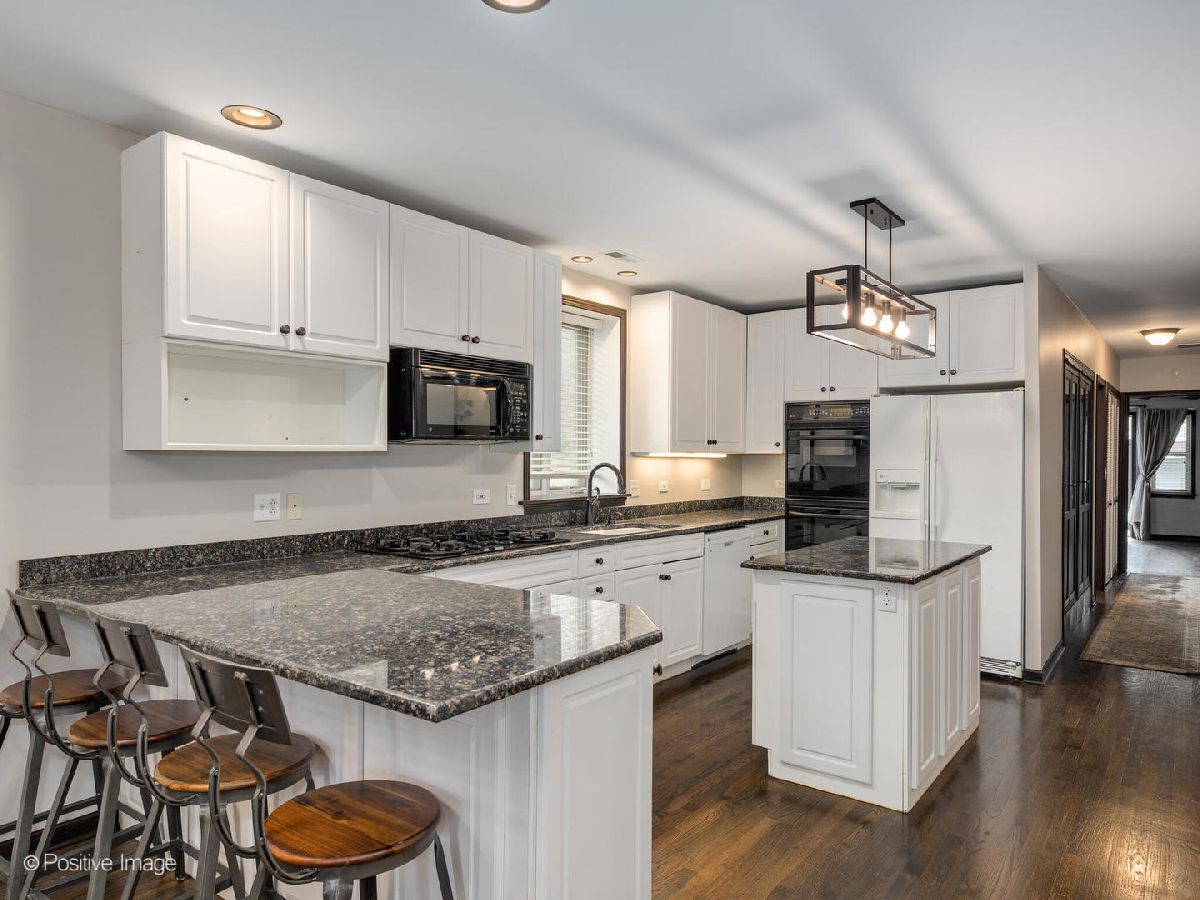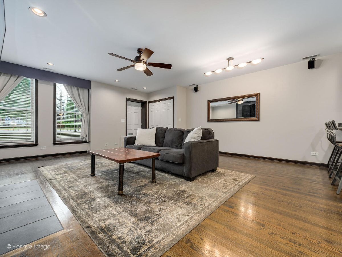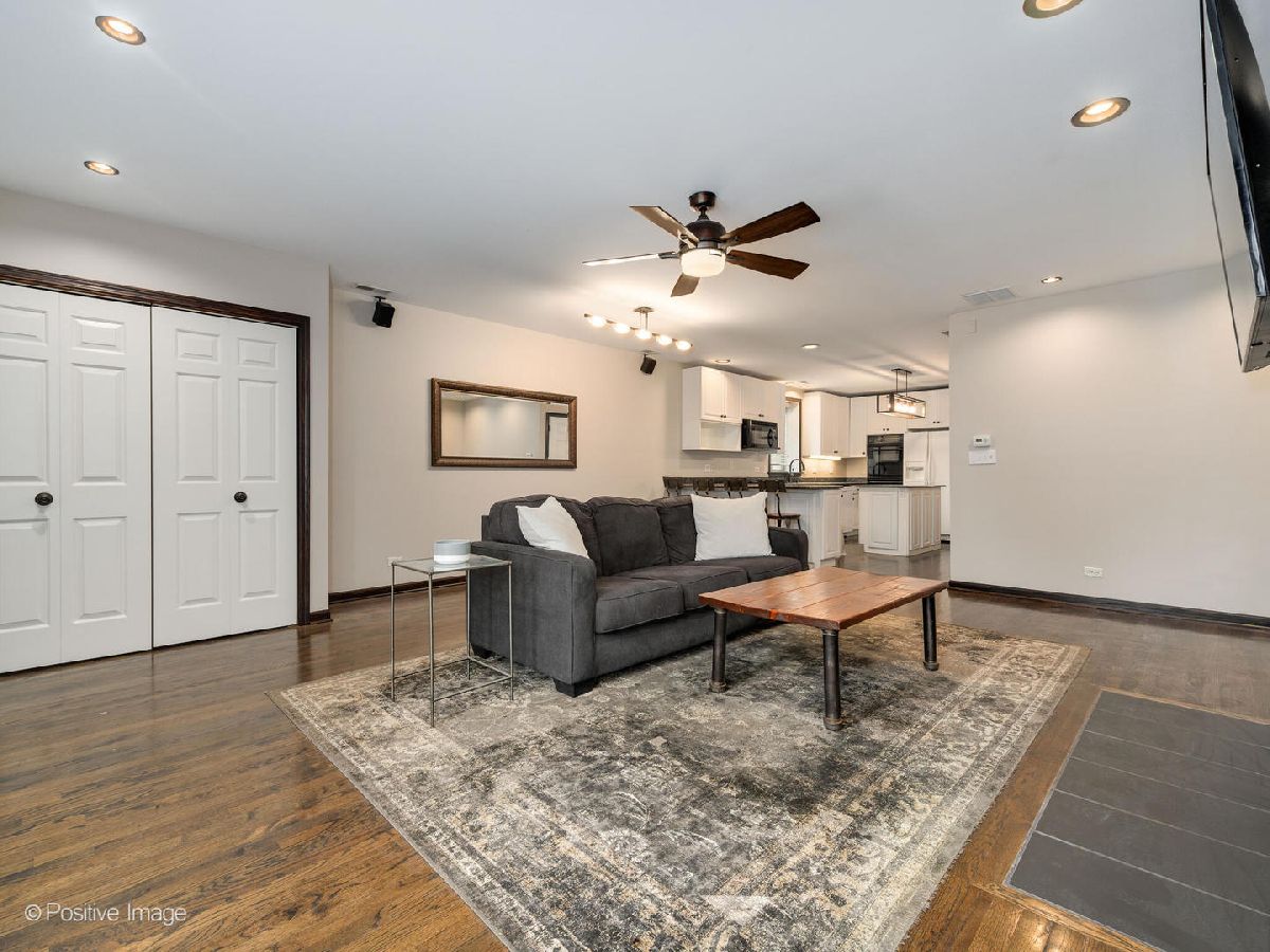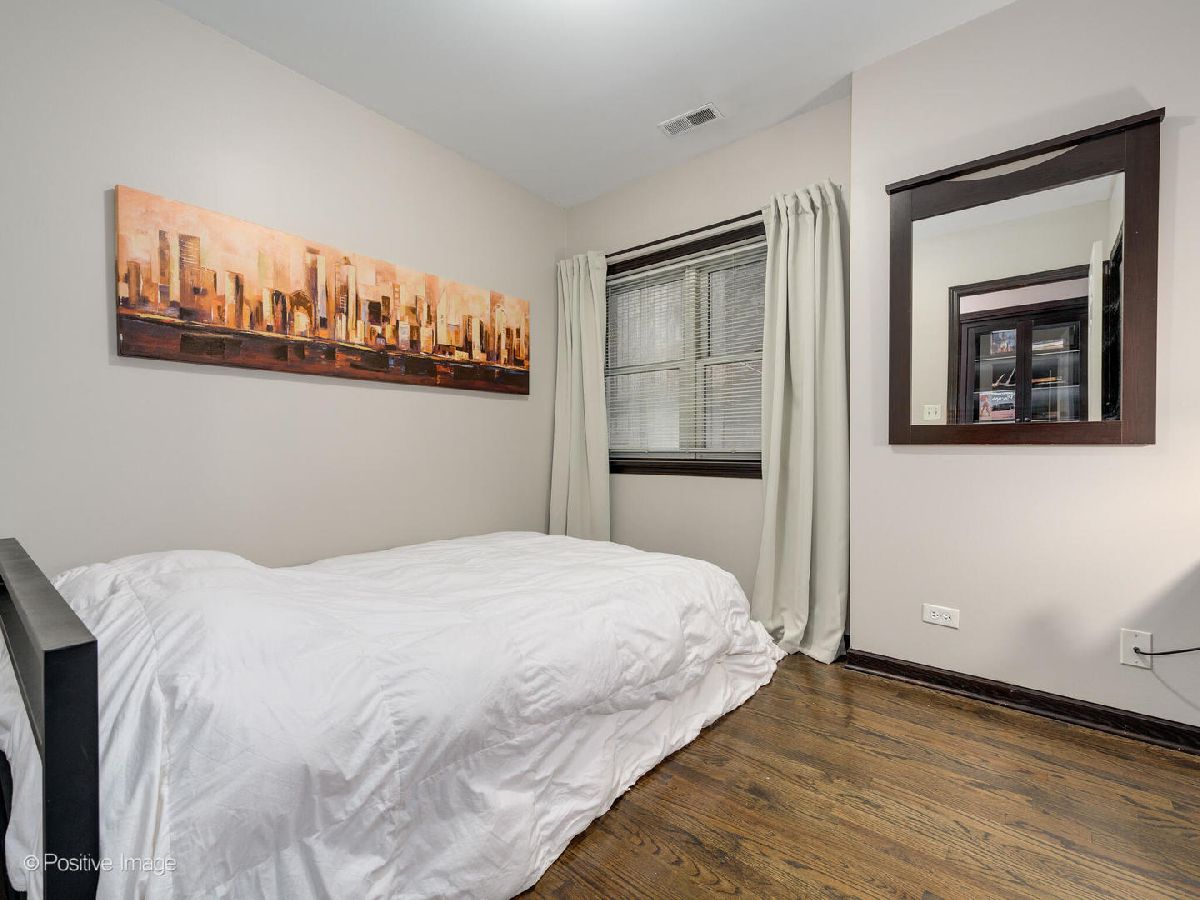 Meticulously upgraded, oversized 1500sqft 2 bed 2 bath condo! Beautifully refinished hardwood floors throughout. Wood burning/gas fireplace in living room is adorned with cool grey wood paneling and a built-in Klipsch speaker system with included receiver. Custom fireplace storage cabinets and a built-in bookshelf off the main hallway. Chef's open-concept kitchen features an eat-in bar that opens to the living/dining room; granite countertops, white cabinetry, built in microwave and a double oven. Master bedroom suite features a large walk-in closet, and provides access to an outdoor patio. Luxury renovated master bathroom boasts dual vanities, custom tile & Kohler fixtures, premium countertops, and a walk-in shower with 3 showerheads, one rain shower. Renovated second bathroom features a soaking tub, also with custom tile & fixtures. Outdoor patio space and storage shed complete this unique, custom, oversized condo! In-unit washer and dryer. Central air. Storage available in building. Short walk to Sushi X, Windy City Cafe, Big Shoulders Coffee, and the Chicago Blue Line Stop.