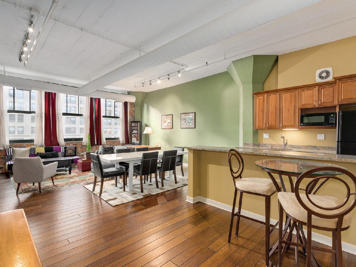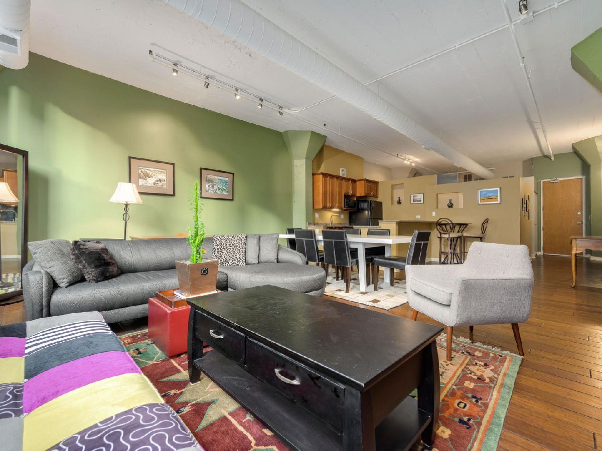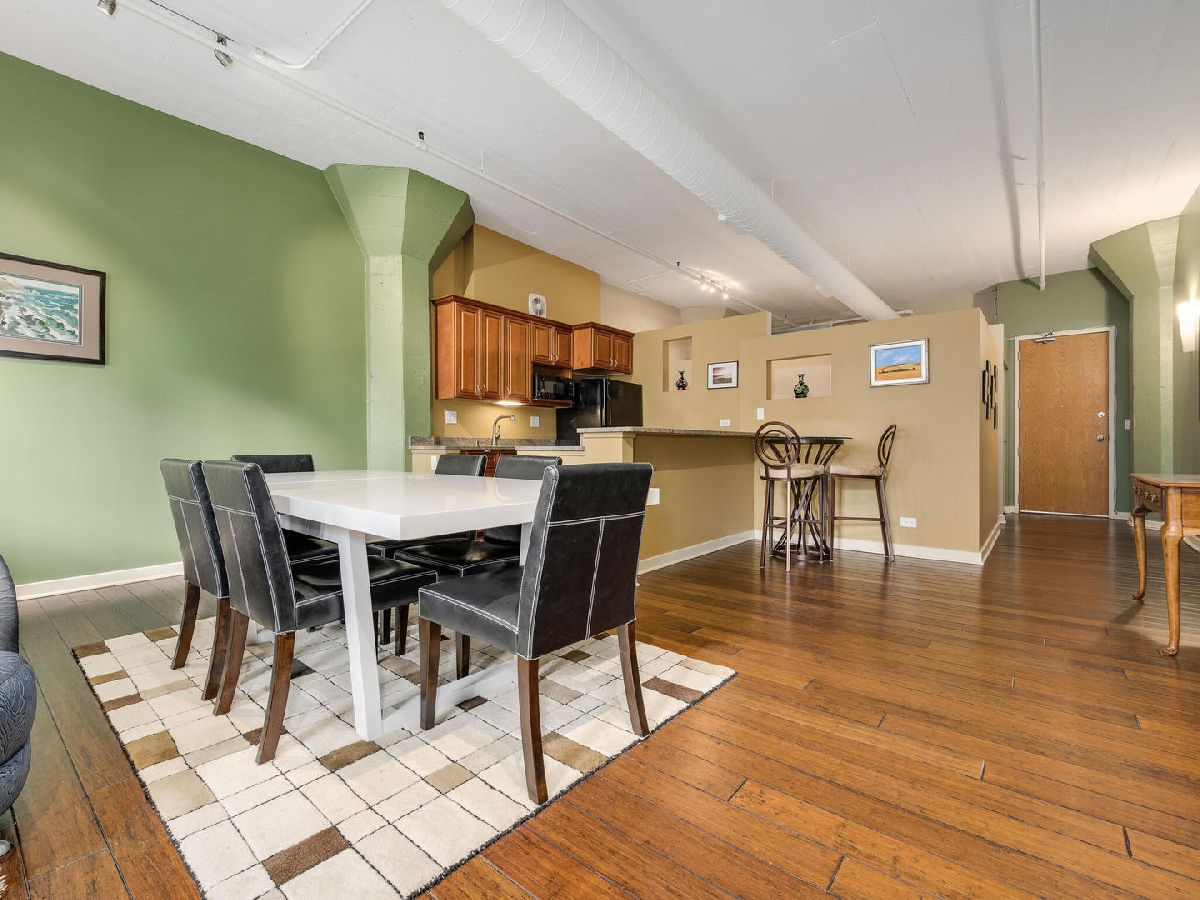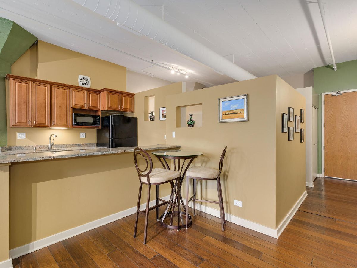 Immediately feel at home in this spacious loft ideal for both leisure and/or working. Upon entering, generous natural light is showcased by a wall of large windows, character adding warm brick, and soaring 11' concrete ceilings. Walking from room to room on classy hardwood floors, you'll notice plenty of room (1000 + square feet) for both living and storage throughout. Benefit from the ease of purchasing turn-key fully furnished or have the flexibility to coordinate moving your own furniture pieces in instead. Entertain or cook in a kitchen fully equipped with dinnerware/glassware, granite counters, and appliances (including microwave, Keurig, disposal, and dishwasher). Dine on barstools near the counter or spread out at a dining room table that can easily accommodate six. Recharge in the lofted bedroom with a comfortable queen-sized bed. Freshen up in a sizeable bathroom that features double vanity, plenty of granite counter space, and a tub-shower combo. Enjoy well-maintained laundry facilities conveniently located on the same floor, a bike room, and a building shared rooftop with impressive views. Geared towards convenient living, this condo is located in the heart of Printer's Row with easy access to public transit, restaurants, entertainment, and everything the city has to offer. Parking can be leased through other owners on-site or there are options in the neighborhood. Schedule a showing now!
