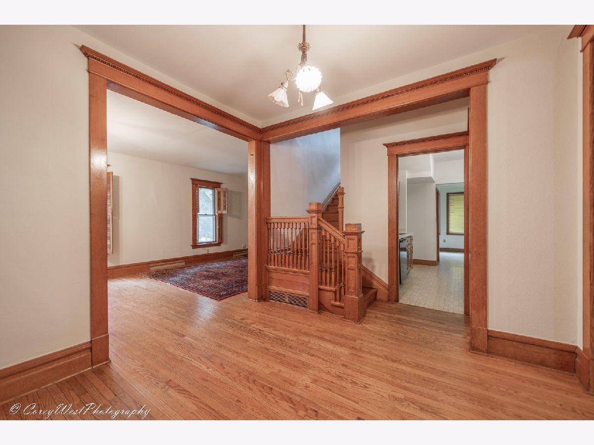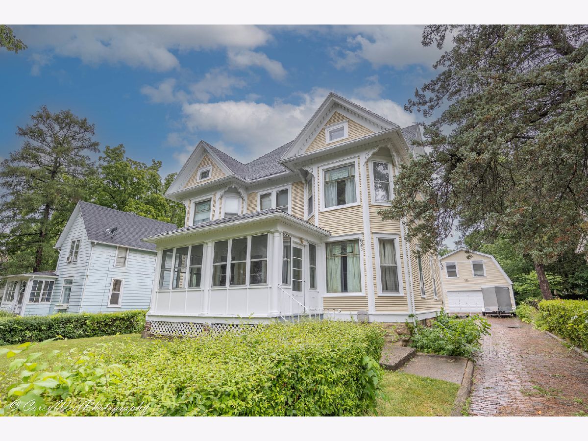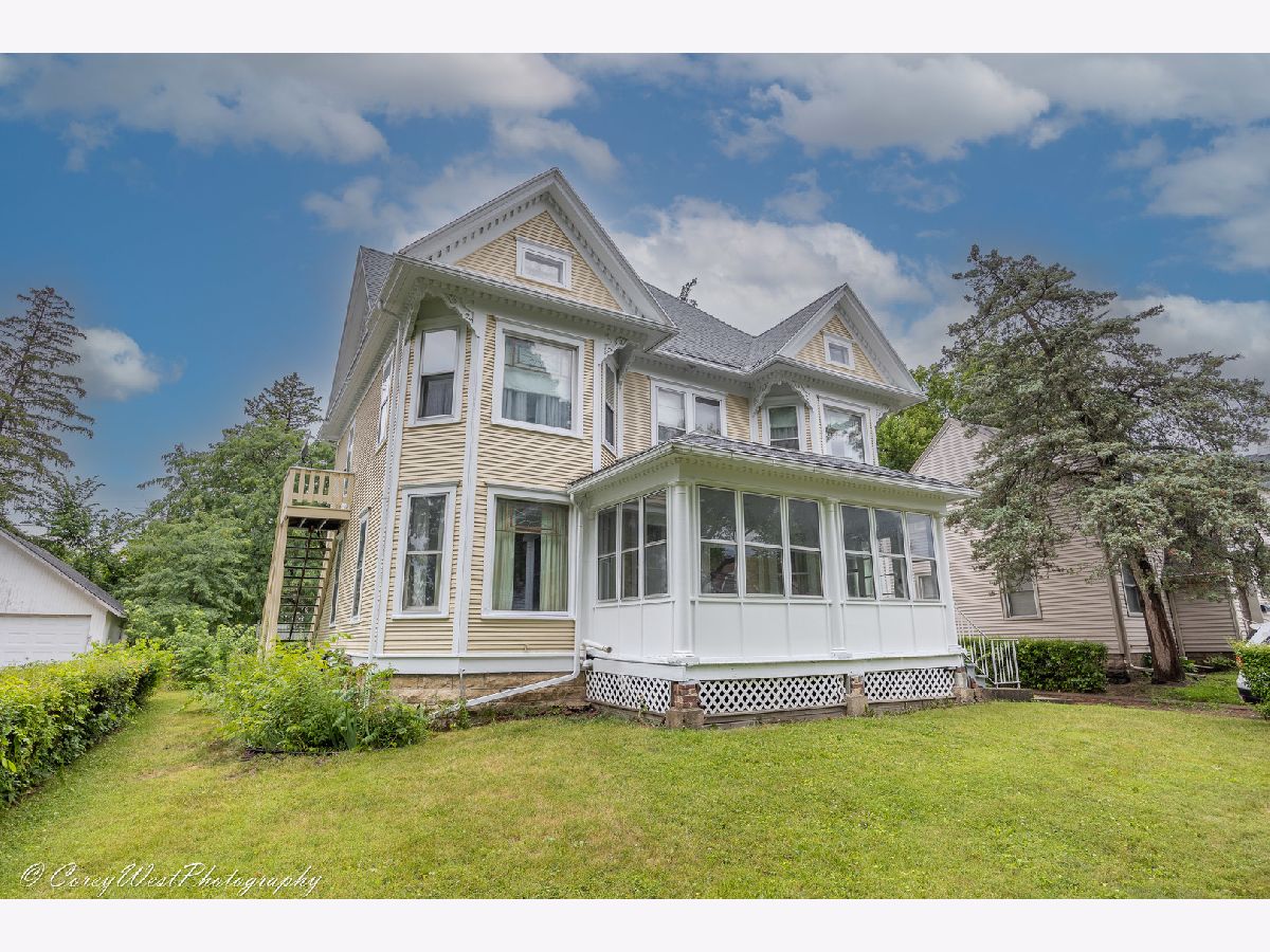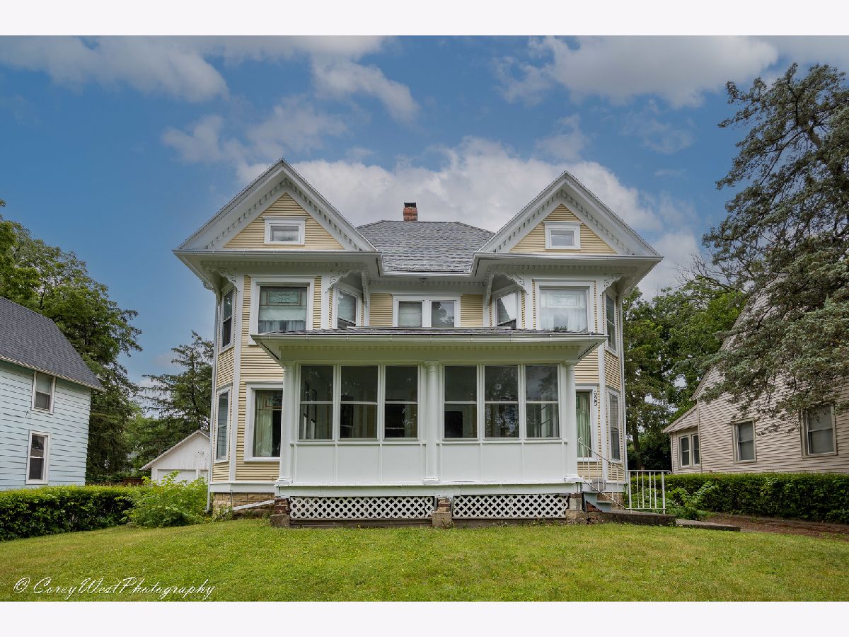 Own a little bit of Dekalb history with this large older vintage "Queen Anne" style home on the south side of DeKalb. Entire interior and exterior recently painted! A lot of "original" charm with the hardwood floors, lighting, built ins, trim, 6 panel door, central vac system, gas professional range, hardware, stain glass window decor, and more. Hardwood floors, throughout, enclosed spacious front porch, large eat in kitchen with built ins and walk in pantry, master with two closets and sitting area, separate dining room with built in hutch, brick drive and patio, large heated workshop, above the 2+ Car garage with electric, plenty of storage, walk up attic ready to finish and add living space, central air. Heated space with electric above the garage would be great for a workshop, classroom, studio, home office/small business, craft room and more! Unless possibilities! Garage roof replaced in 2016, back porch and flat roof replaced, updated electrical. The charm, space and possibilities make this home a MUST SEE!
