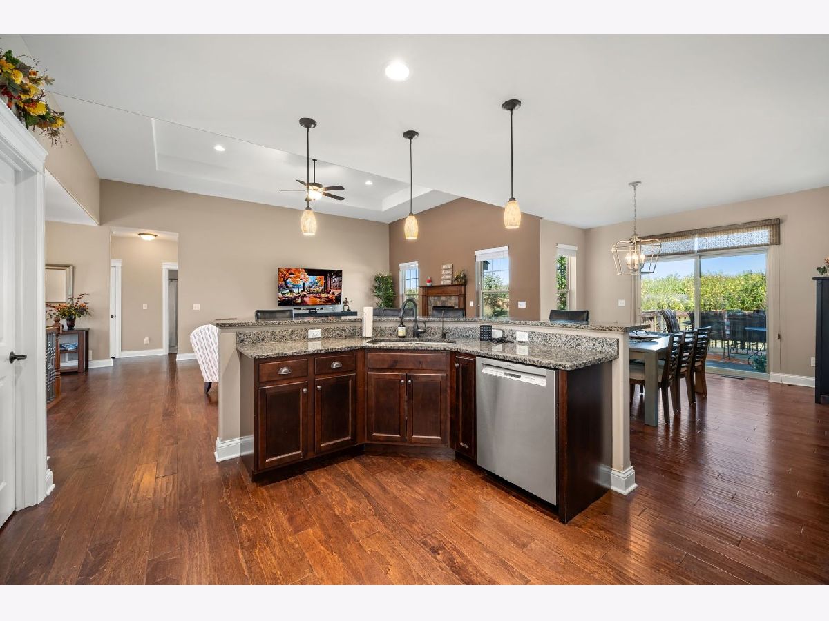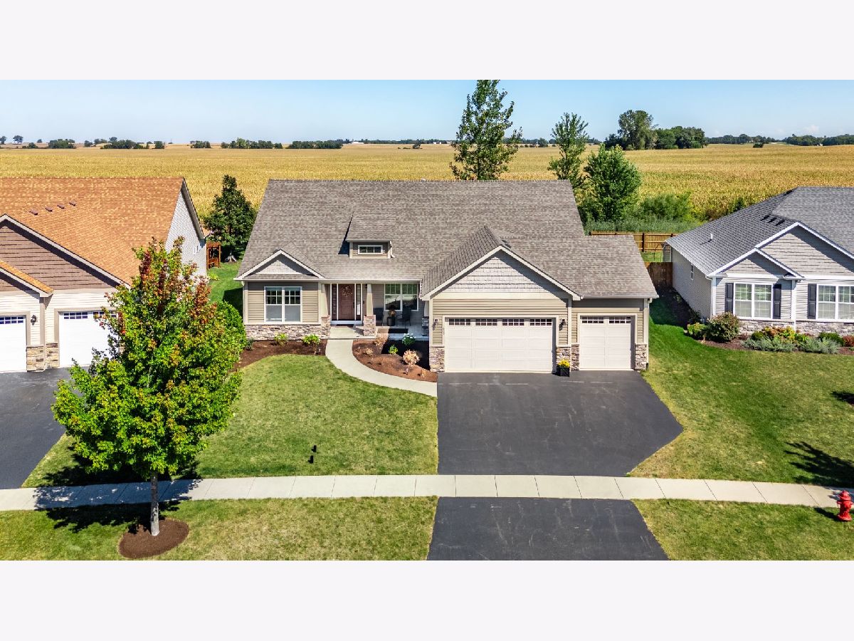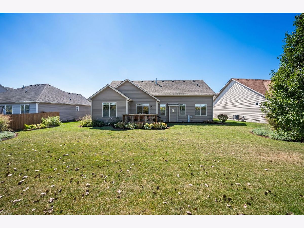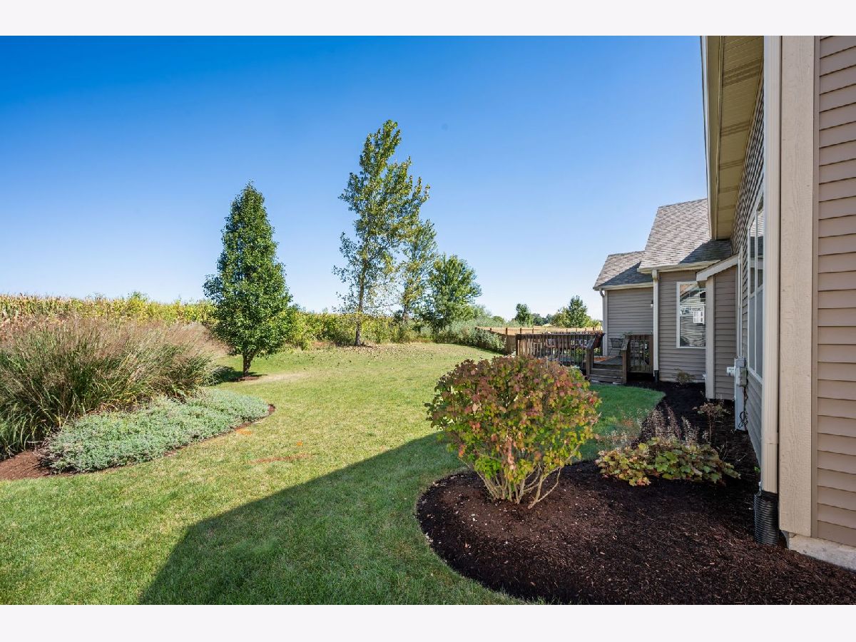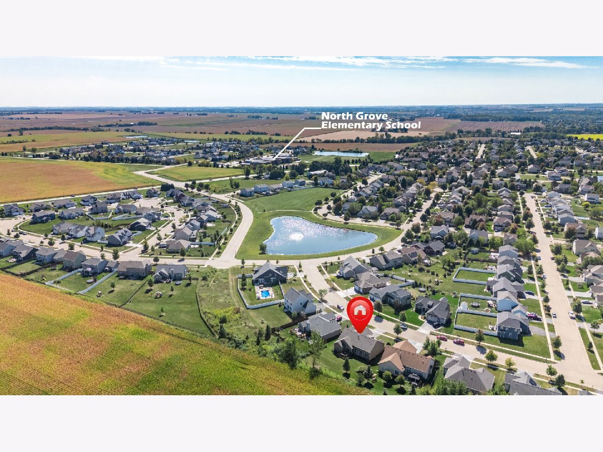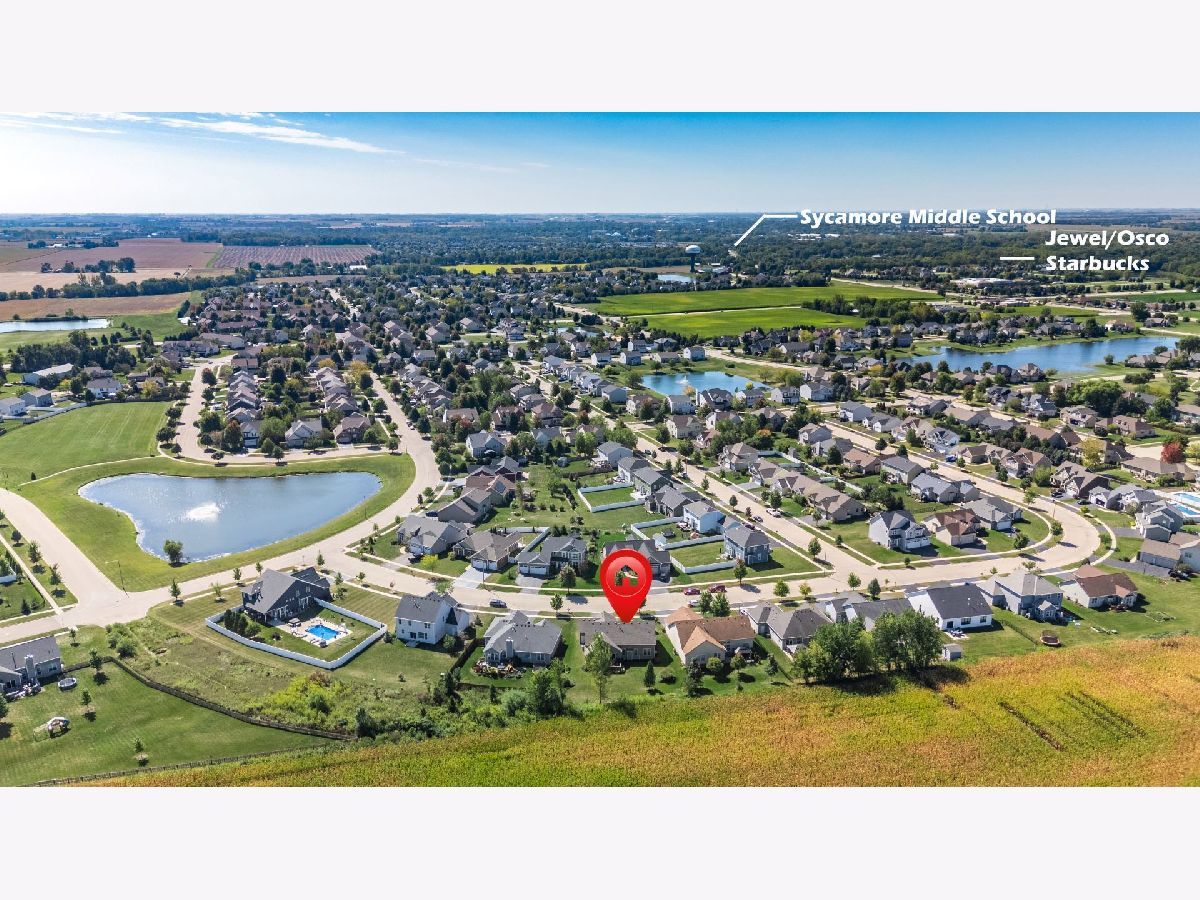 This stunning ranch located in North Grove Crossings boosts a welcoming covered front porch, open floor plan with grand foyer, open staircase, and gleaming engineered hardwood floors throughout. The foyer opens up to spacious family room with 13' tray ceiling and gas fireplace with wood mantle. The kitchen overlooks both the family room and dining room offers an extended island with a breakfast bar for casual dining and entertaining. The chef's kitchen features 2 toned cabinetry with soft close drawers and crown molding, granite countertops, stainless steel appliances, and walk-in pantry. The laundry is equipped with washer and dryer with shelving. You will love the privacy of split floor plan! The primary suite features tray ceiling and an en-suite bathroom with double sinks, tiled shower with Jolie showerhead, linen closet, and large walk-in closet. The 2 additional bedrooms with a hall bathroom located on opposite side of the house arounds off the first floor. If you need more room, check out the beautifully finished basement with living room, 4th bedroom, office, full bathroom, and storage rooms. The 14X12 deck overlooks meticulously landscaped, peaceful, and private backyard with a view of cornfields, making it the perfect retreat. 3 car garage, Sycamore Schools. Conveniently located near downtown Sycamore, shopping, dining, and I88. Make this your next move!